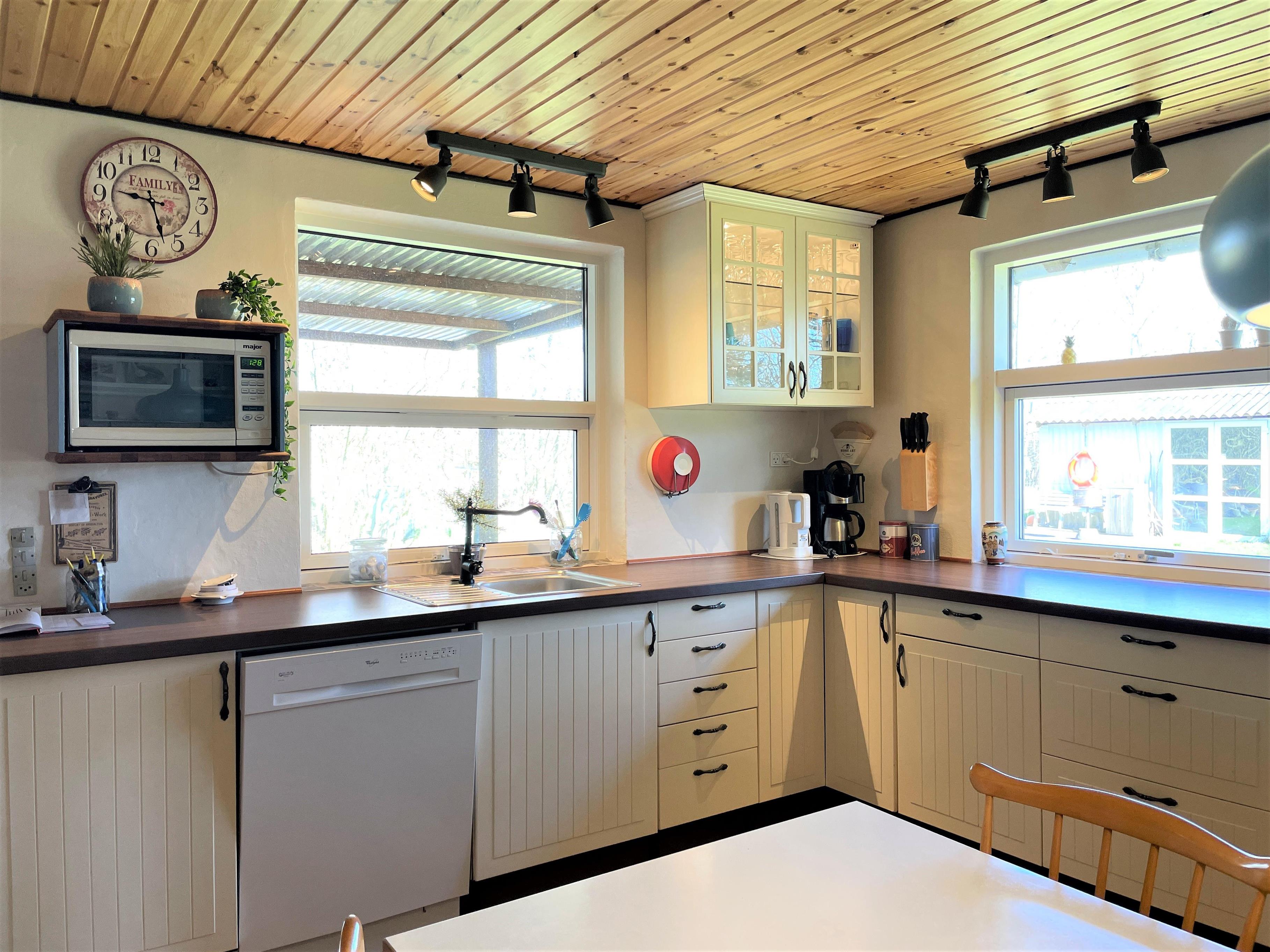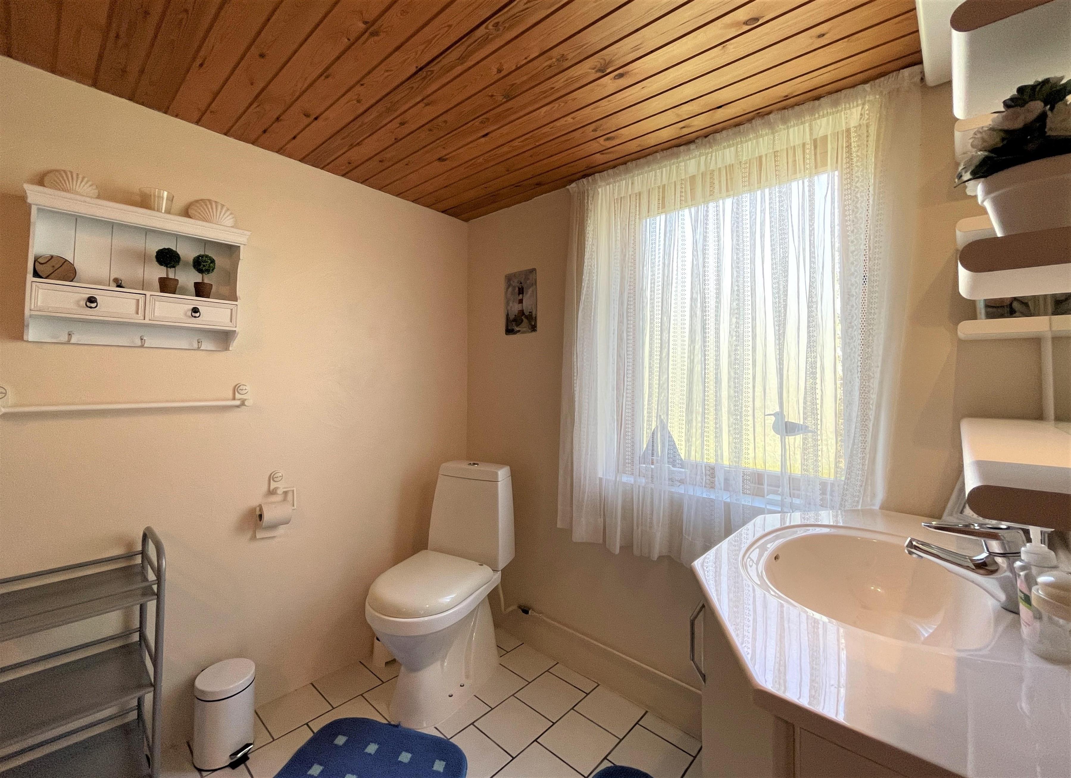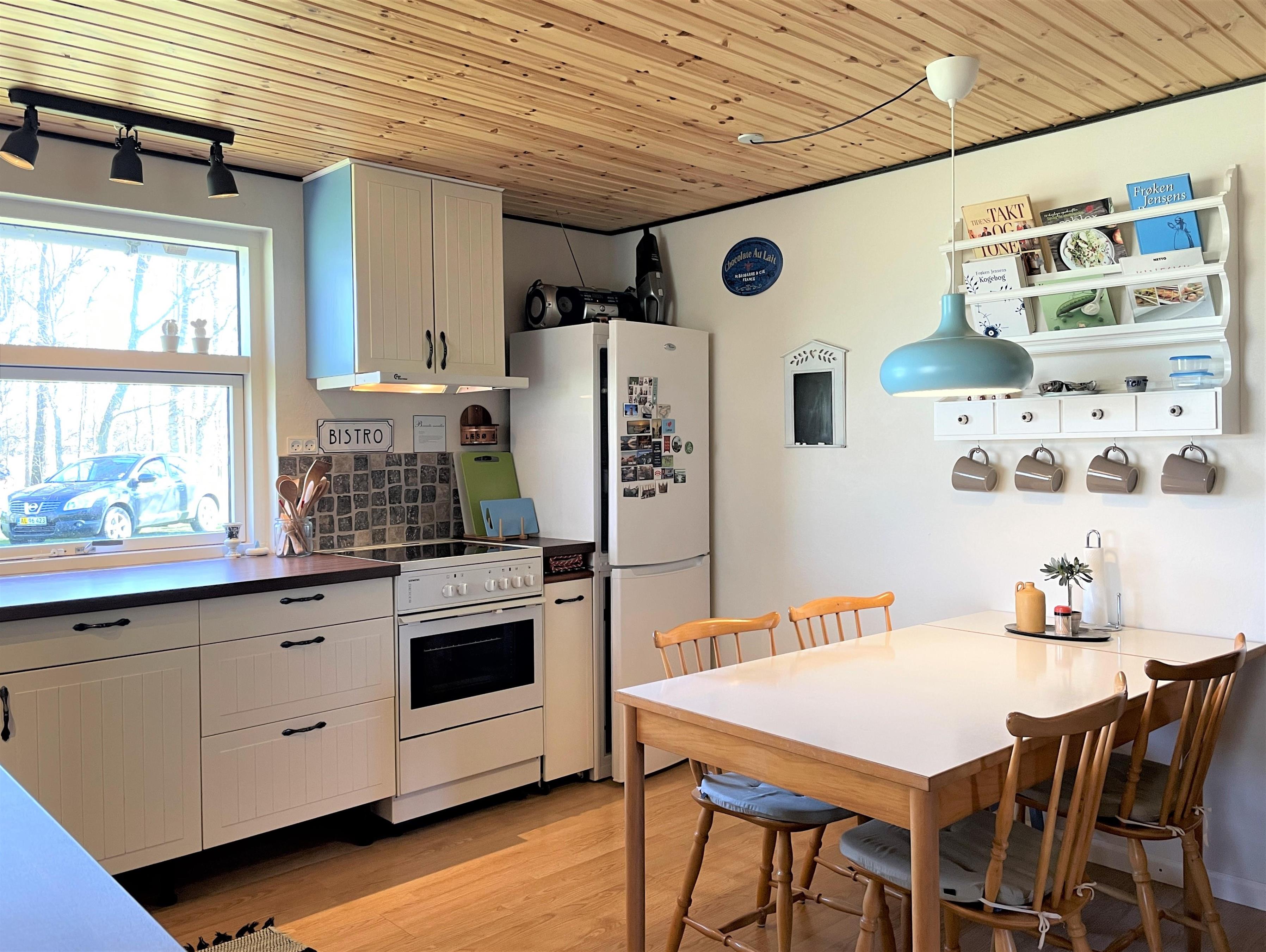 Huset indeholder fint køkken med spiseplads samt stue med hyggelig møblering. Pænt badeværelse med brus. Der er et soveværelse i stueplan med to enkeltsenge samt to soverum på 1.salen med dobbeltsenge. Der er brændeovn i stuen. Hunden er velkommen i husets underetage.