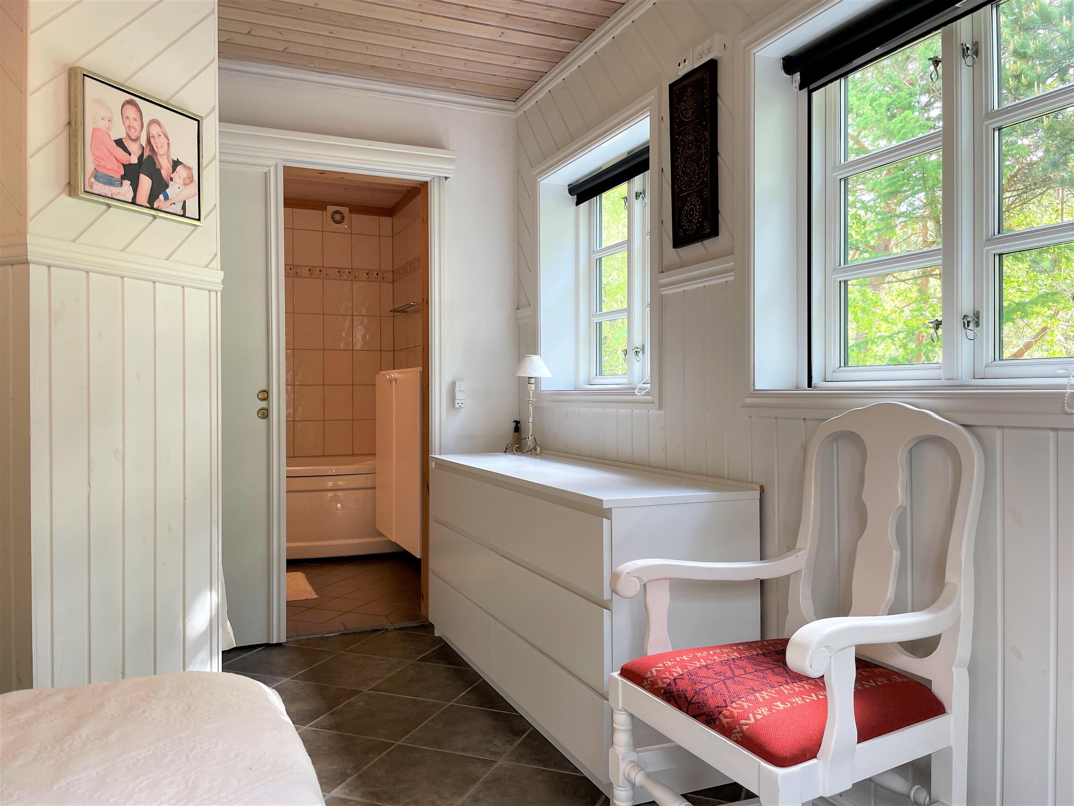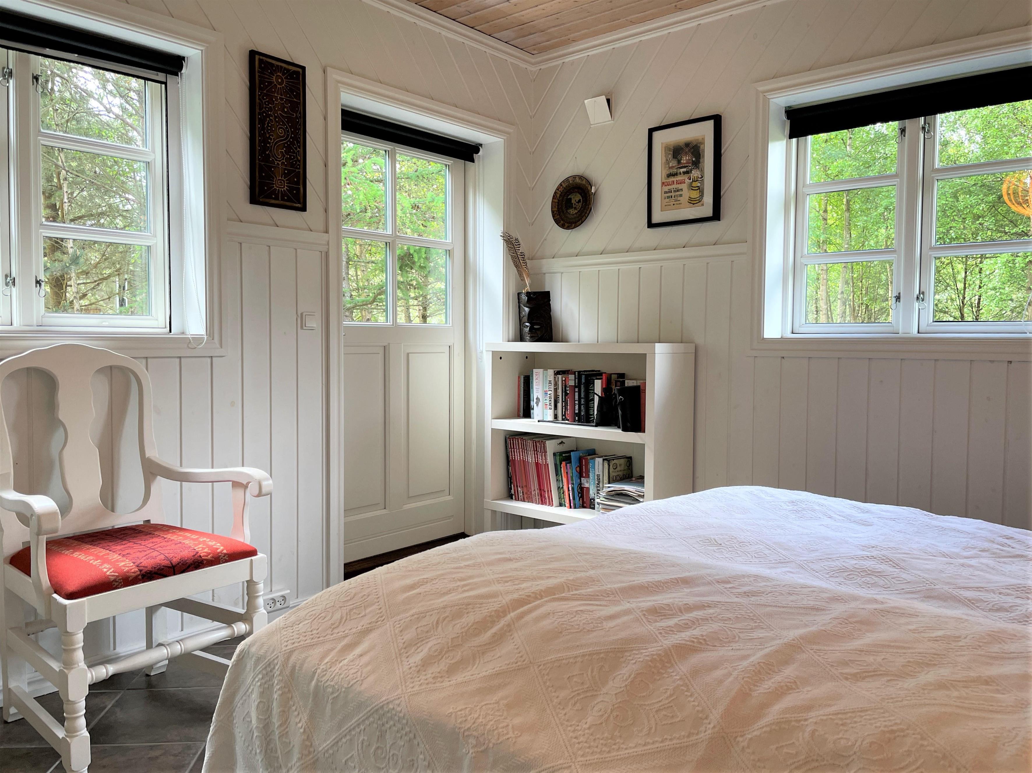 Dette flotte, store sommerhus med tre badeværelser har en dejlig ugenert beliggenhed i det attraktive, naturskønne feriehusområde nord for Vesterø Havn tæt på både stranden og det smukke hede/skovområde. Huset er lyst og lækkert indrettet med stor stue med brændeovn og komfortabelt køkken/alrum med spiseplads. Der er i alt fire soveværelser, to med dobbeltsenge og et med to enkeltsenge, - derudover anneks med dobbeltseng. Havedør til terrassen fra det ene soveværelse. Der er fint lysindfald i alle rum fra de mange vinduer. Huset er, som nævnt, udstyret med hele tre badeværelser, hvoraf et er med badekar. Trappe til overetagen, hvor der er et stort opholdsrum.