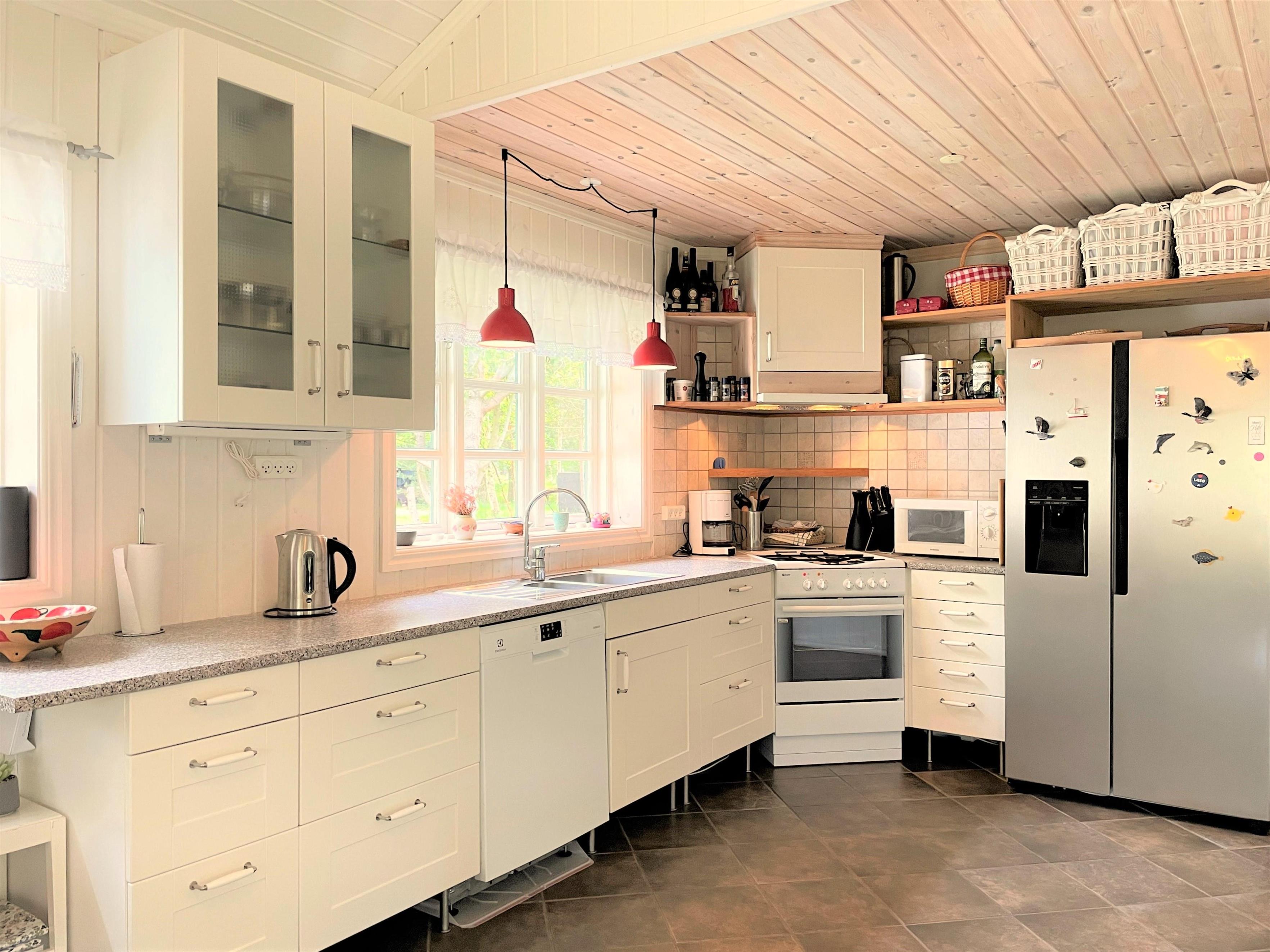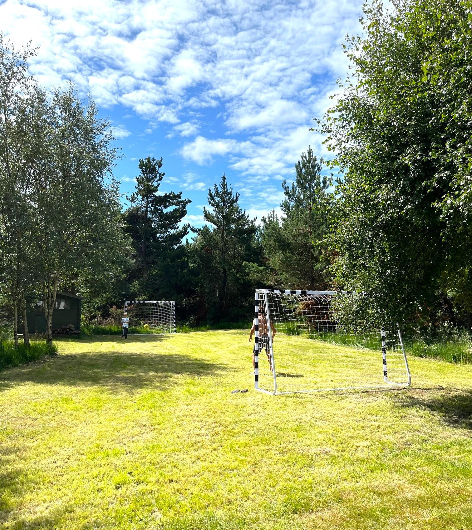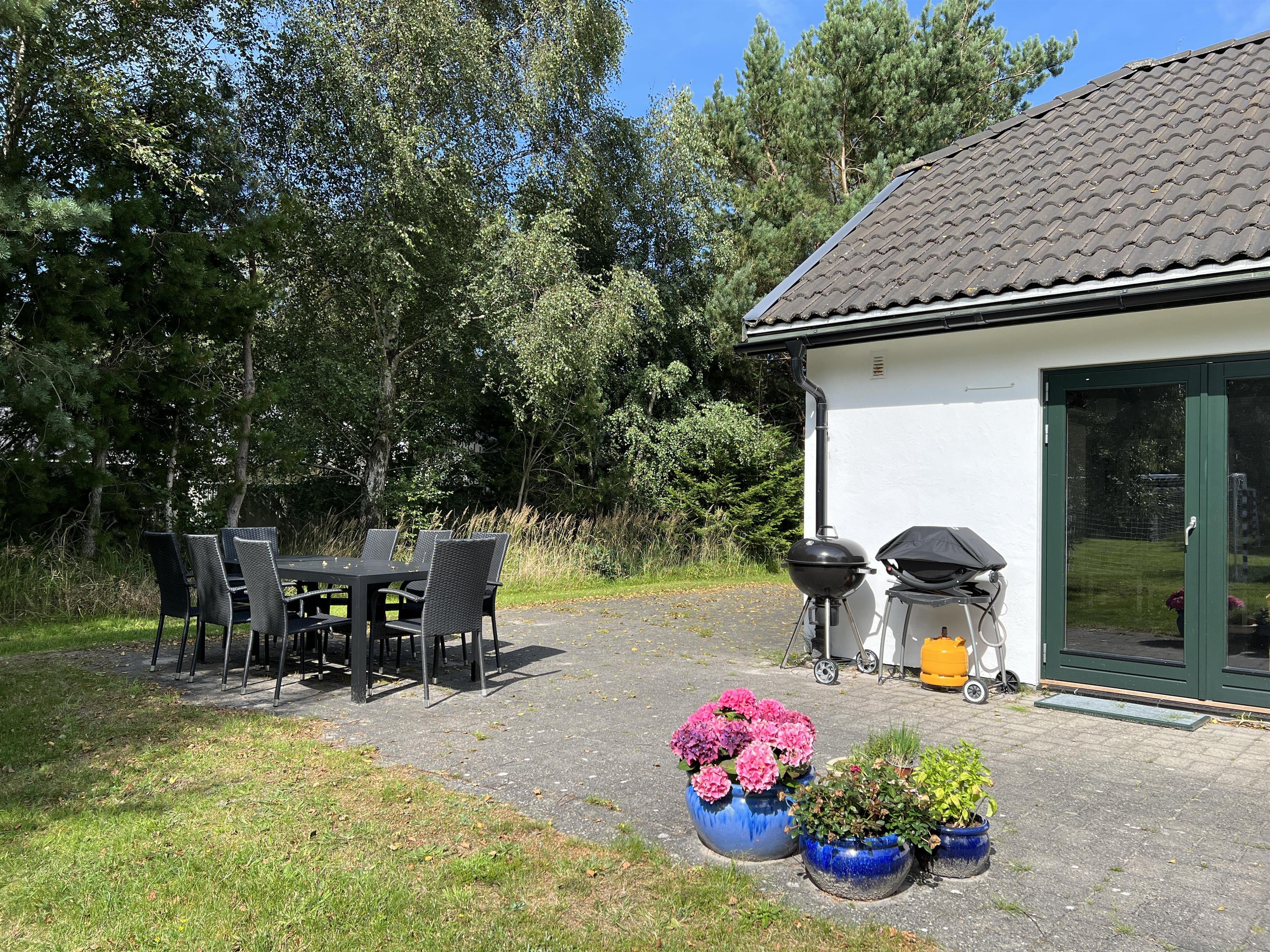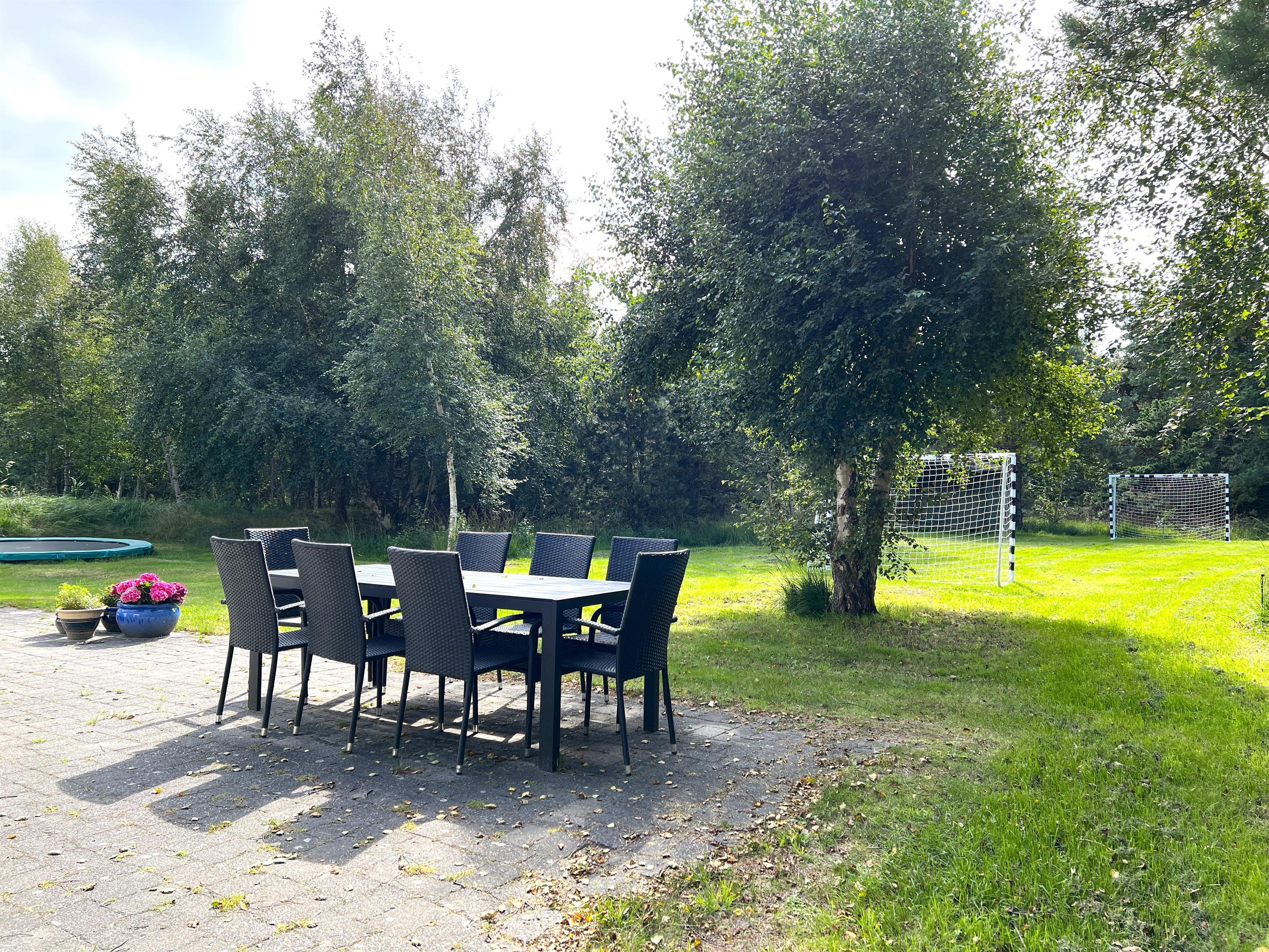 Gode muligheder for at nyde solen og sommeraftenerne på den store terrasse sydvest for huset. I haven kan børnene rigtig muntre sig, både på den nyanlagte fodboldbane og på trampolinen, og der er masser af plads til hunden på den store indhegnede grund. Et rigtig dejligt hus til den store familie eller til to familier, der vil nyde ferien sammen.