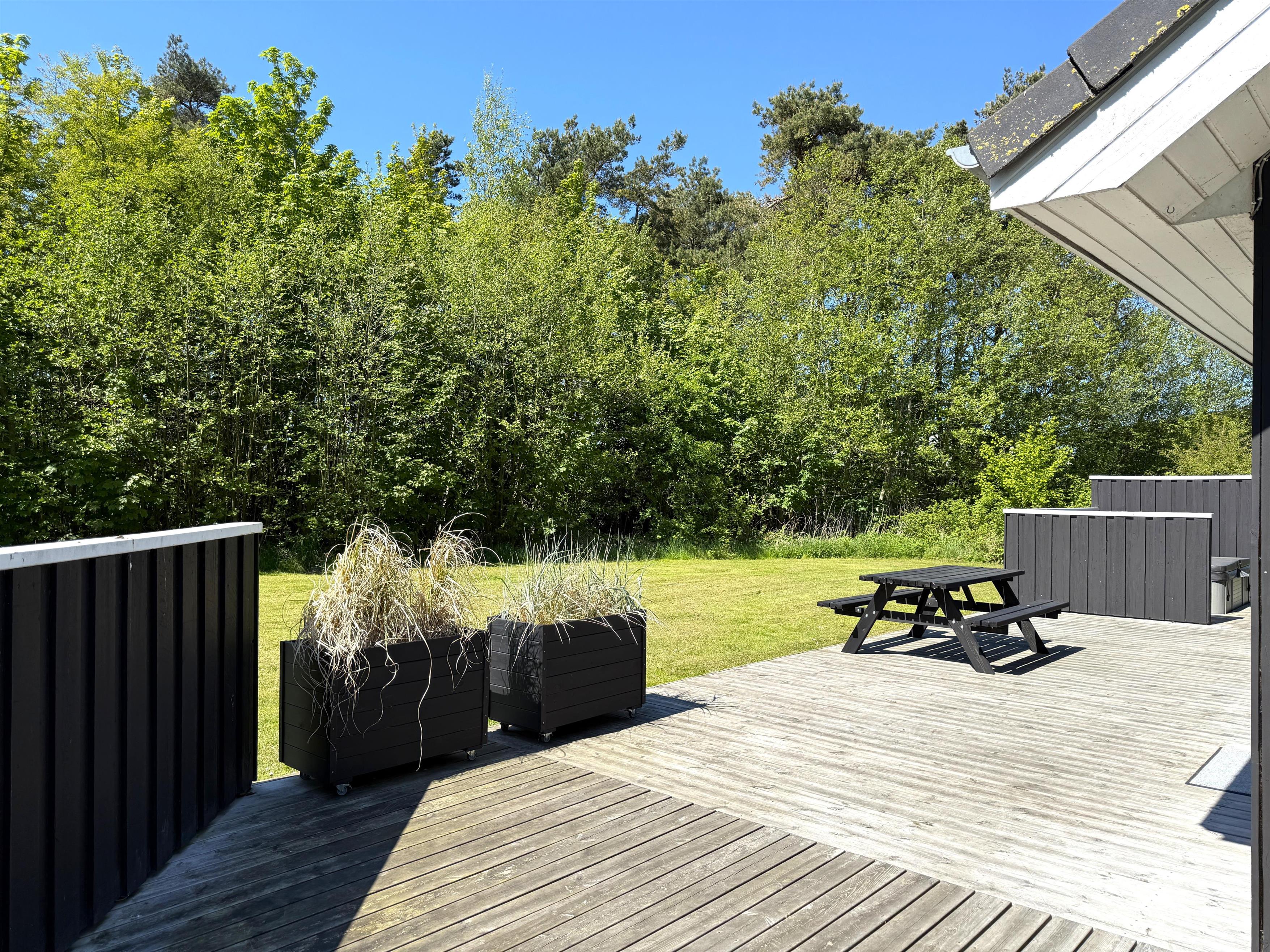 Huset har et skønt, moderne køkken-alrum med spiseplads og hyggeligt sofaarrangement, hvor der er plads til den store familie. Der er tre gode soveværelser, hvoraf to har dobbeltsenge og det tredje har to enkeltsenge. Der er god skabsplads og yderligere en rummelig hems med to ekstra sovepladser. Der er hele to flotte, store badeværelser med brus, og et pænt bryggers med vaskemaskine og tørretumbler. Huset har også sauna i forbindelse med det største badeværelse. Der er endvidere installeret vildmarksbad pr 1. marts 2026. På de store træterrasser kan husets dejlige solkroge og havemøbler benyttes, og der er rig mulighed for skønne grillaftener.