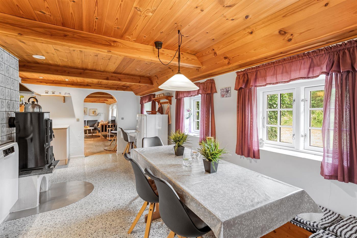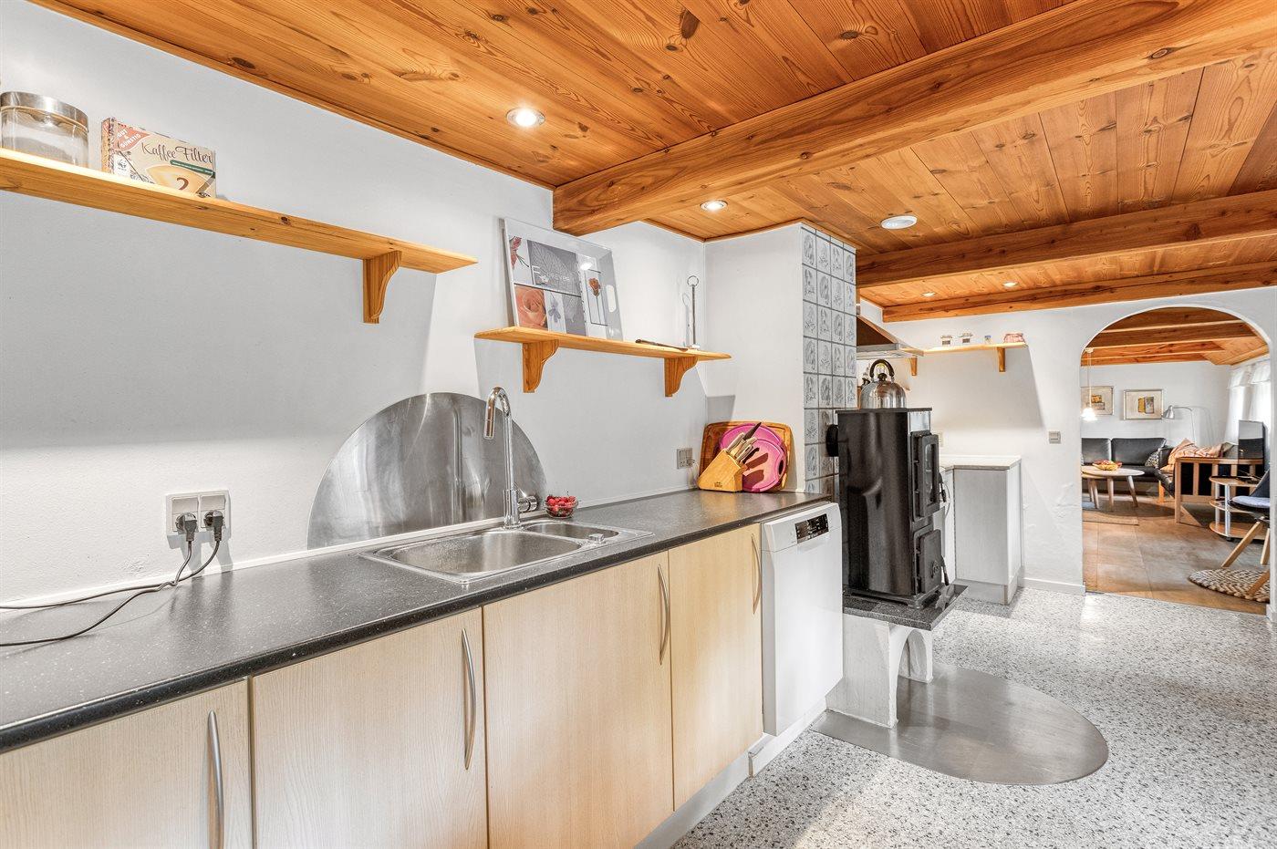 Køkkenet er udstyret med 1 køleskab. Der er 4 keramiske kogeplader, varmluftovn, mikrobølgeovn samt opvaskemaskine.