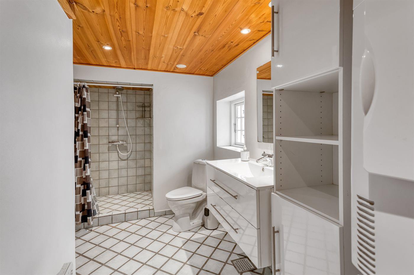 Der er 2 badeværelser med bruseniche og 2 toiletter. Der er gulvvarme på 2 badeværelser. I saunaen er der mulighed for afslapning.