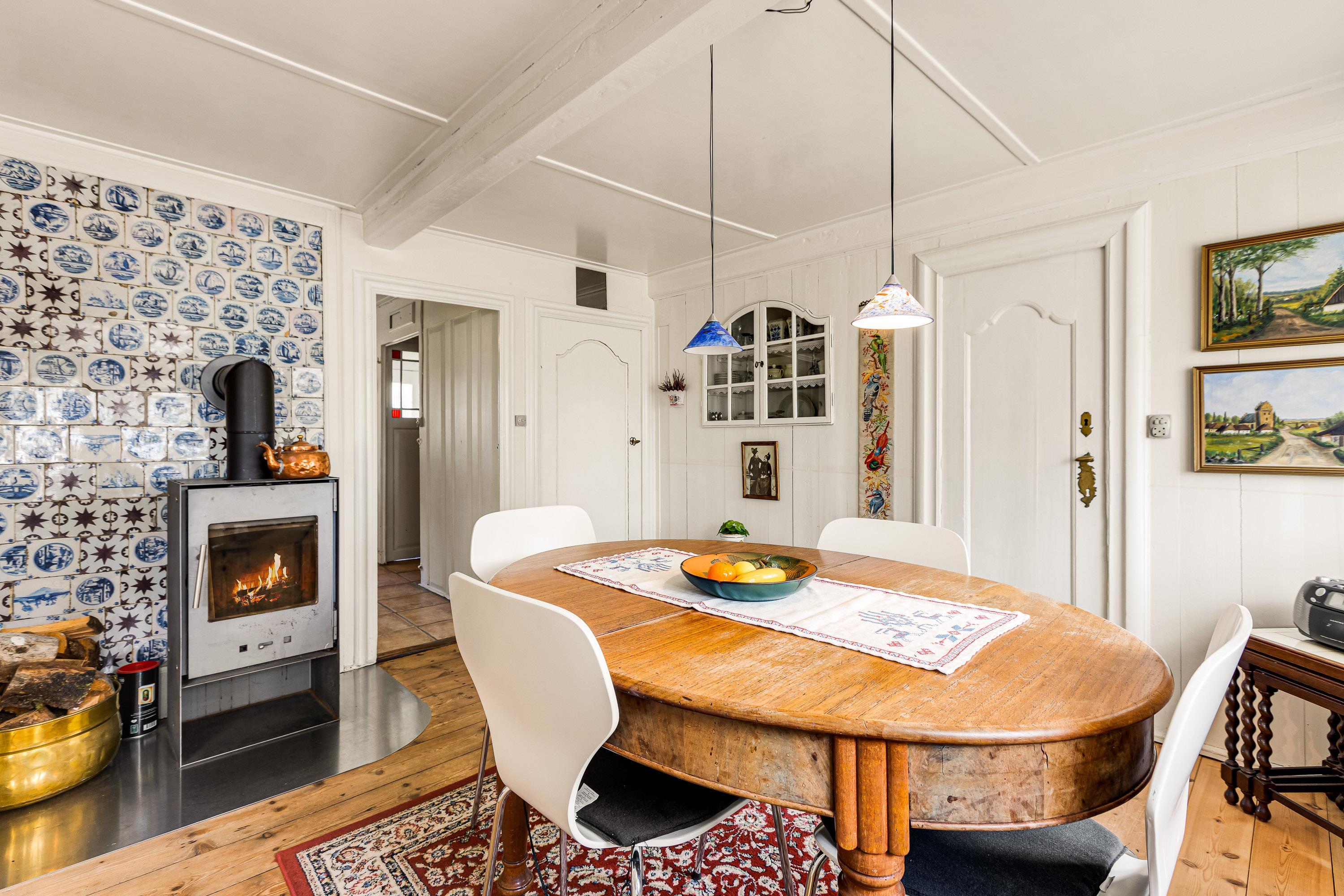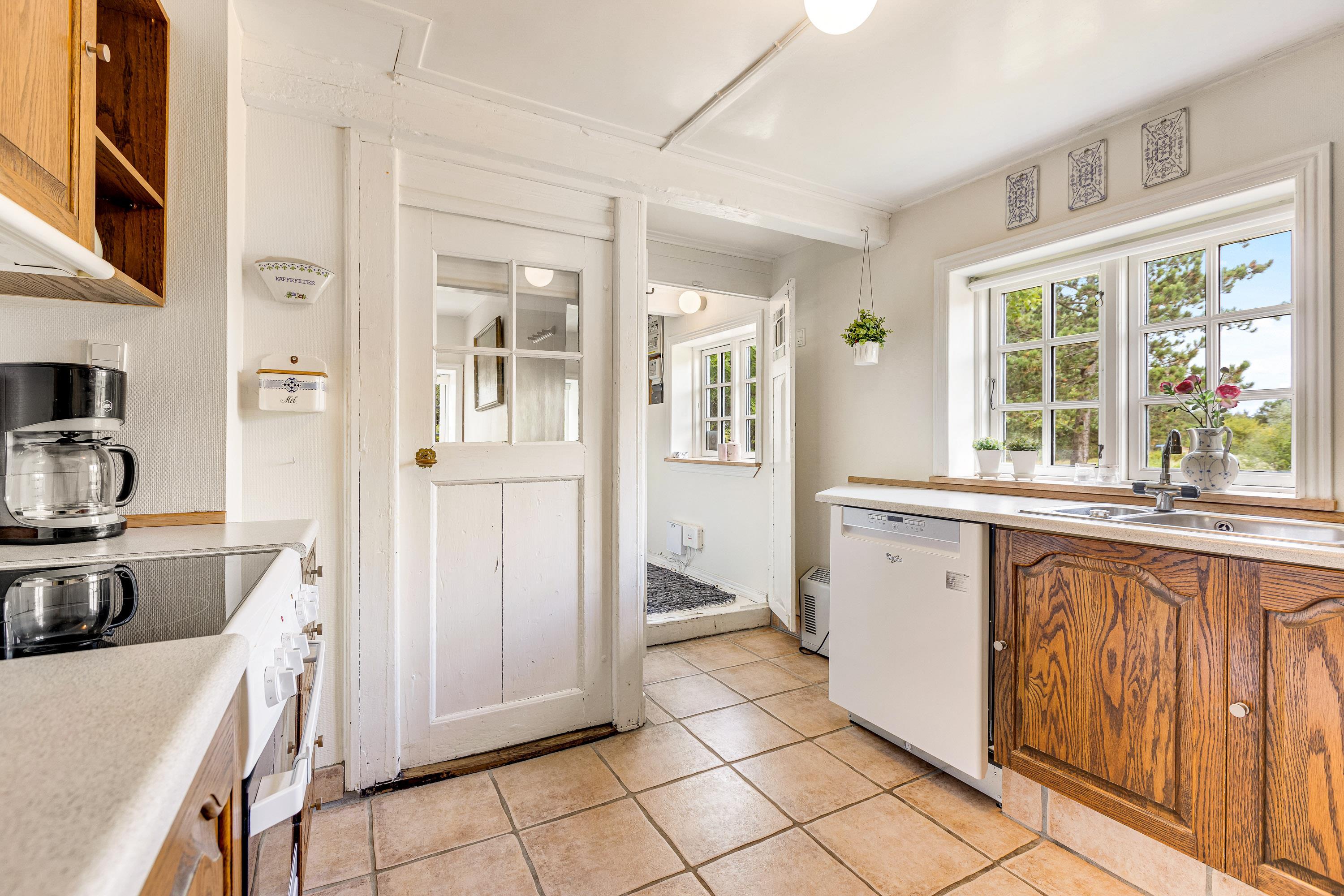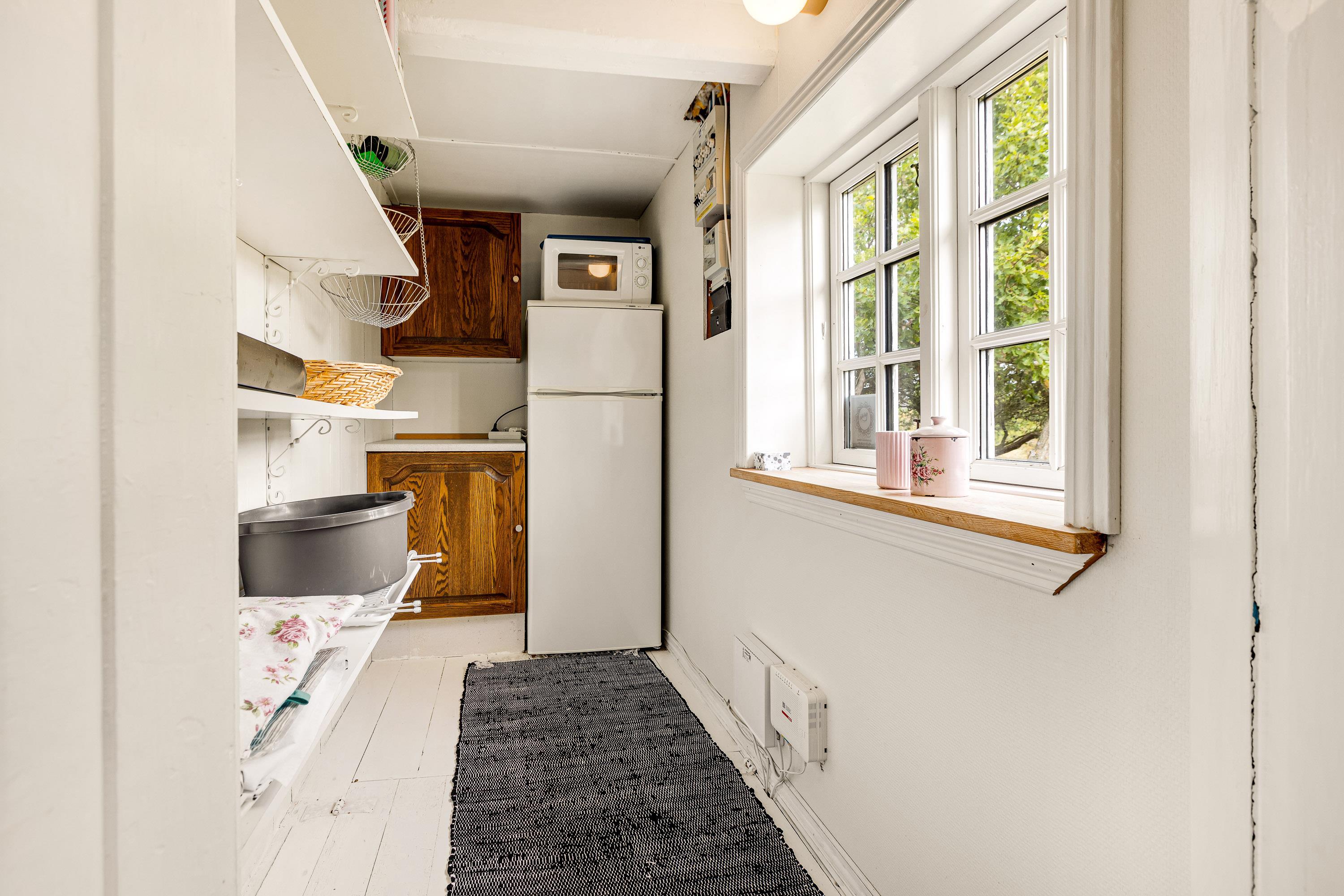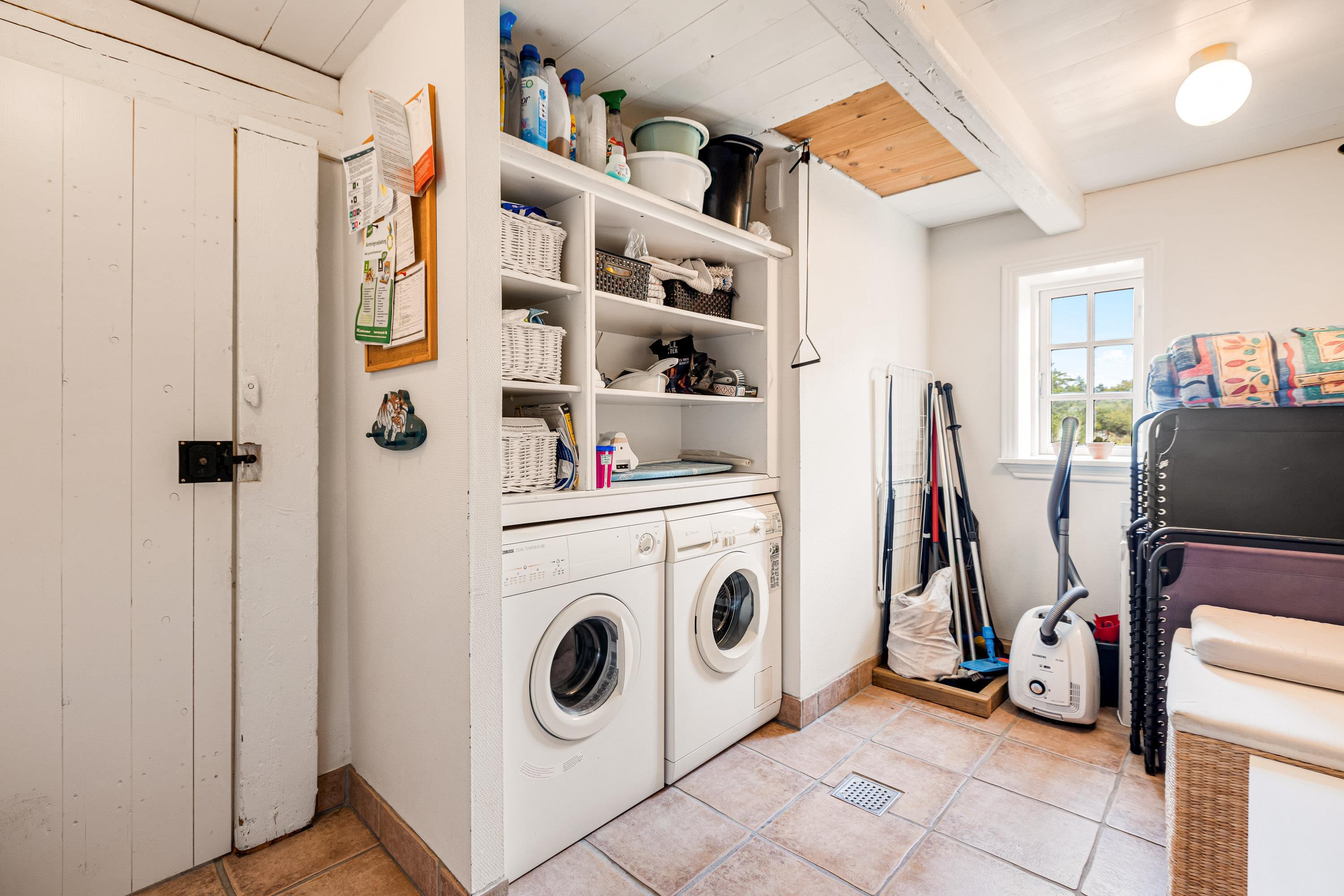 Sommerhuset er også indrettet med et stort og traditionelt køkken i et separat rum for sig, hvor du også finder en opvaskemaskine, mikroovn og en stor 100 L fryser. I køkkenet er det muligt at samles om fælles madlavning, og nyde den ved det smukke runde spisebord sammen med familien. I husets bryggers finder du også en vaskemaskine samt tørretumbler.