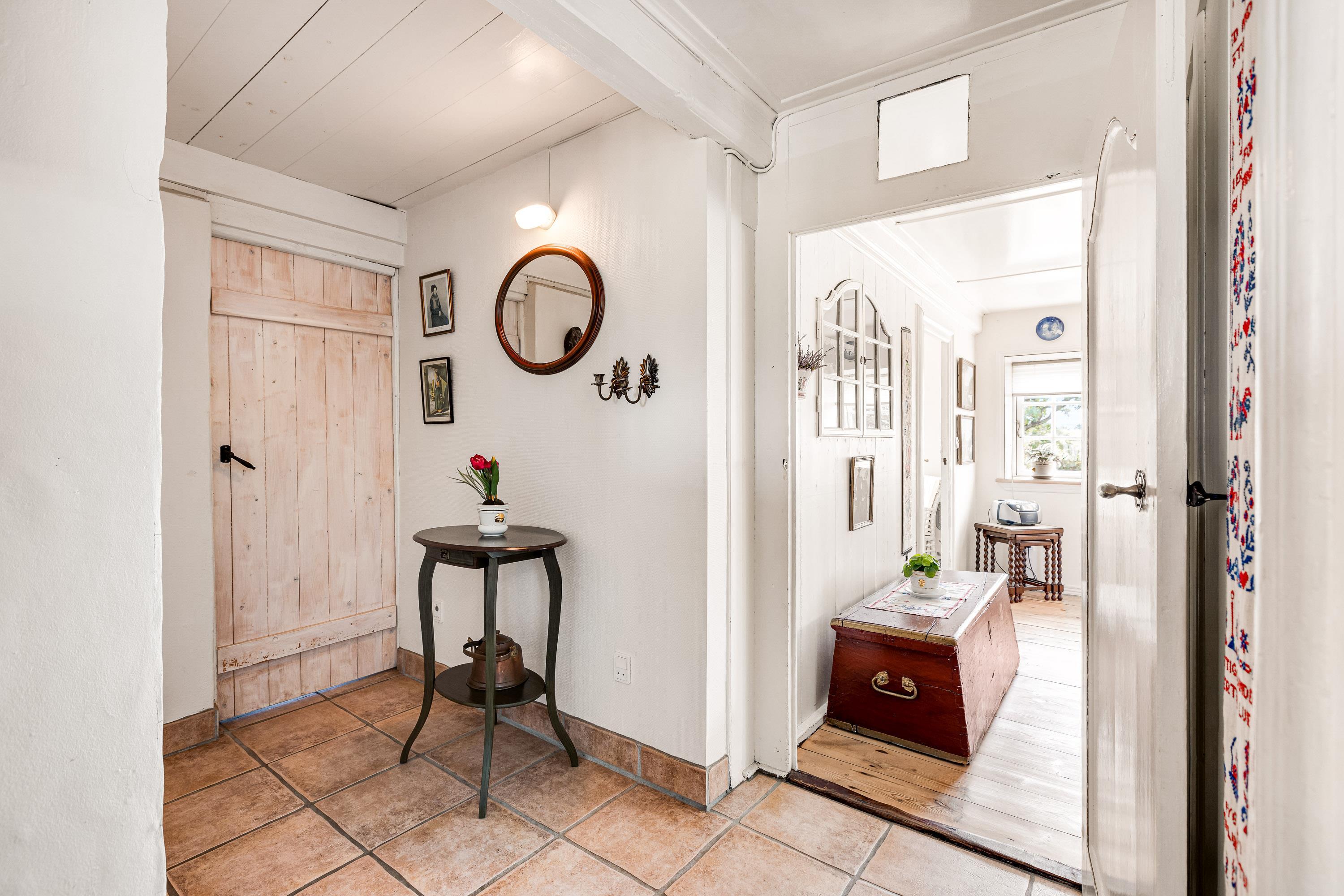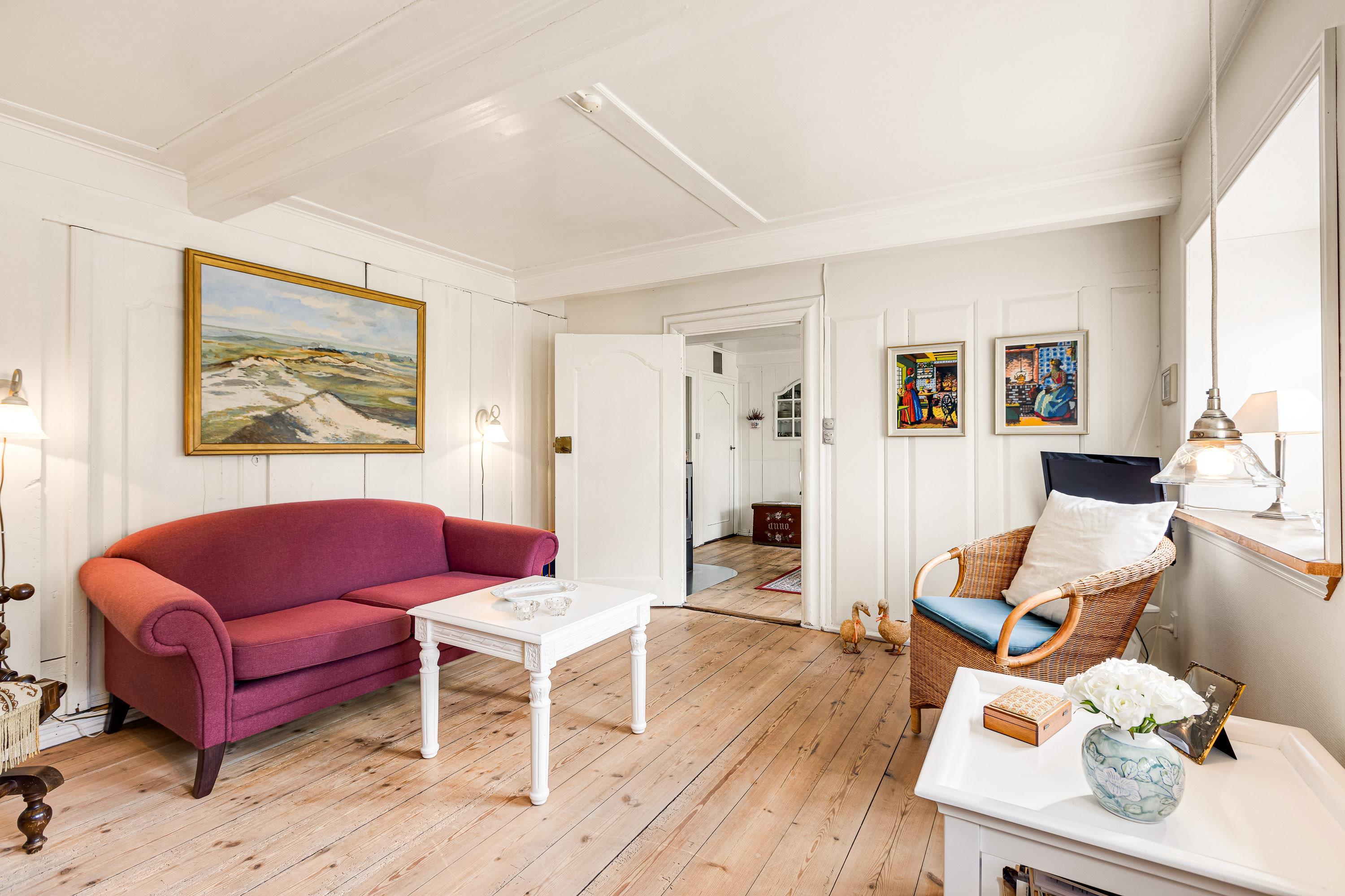 Indvendigt finder du lyse rum som er hyggelige og velindrettede med charmerende møbler, der bevarer husets alder og karakter. Samtidig er der i de 2 soverum med dobbeltseng samt stuen og spisestuen et stort trægulv, som bevarer husets charme. Husets varierende lave loftshøjde gør også, at dets karakter er bevaret. Derudover emmer møbleringen af ægte sommerhushygge, hvorved familien kan samles i sofaen og se en film på husets fjernsyn, imens brændeovnen står tændt og luner i spisestuen ved siden af.