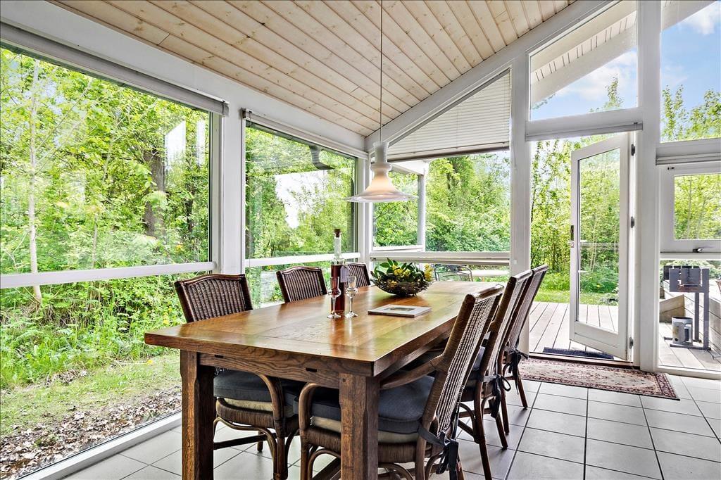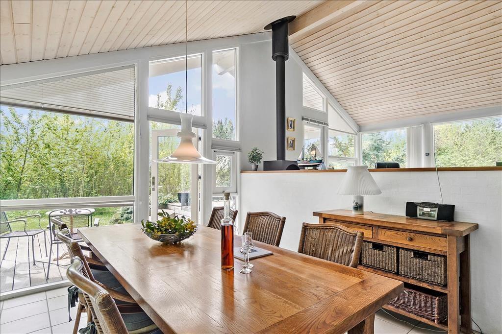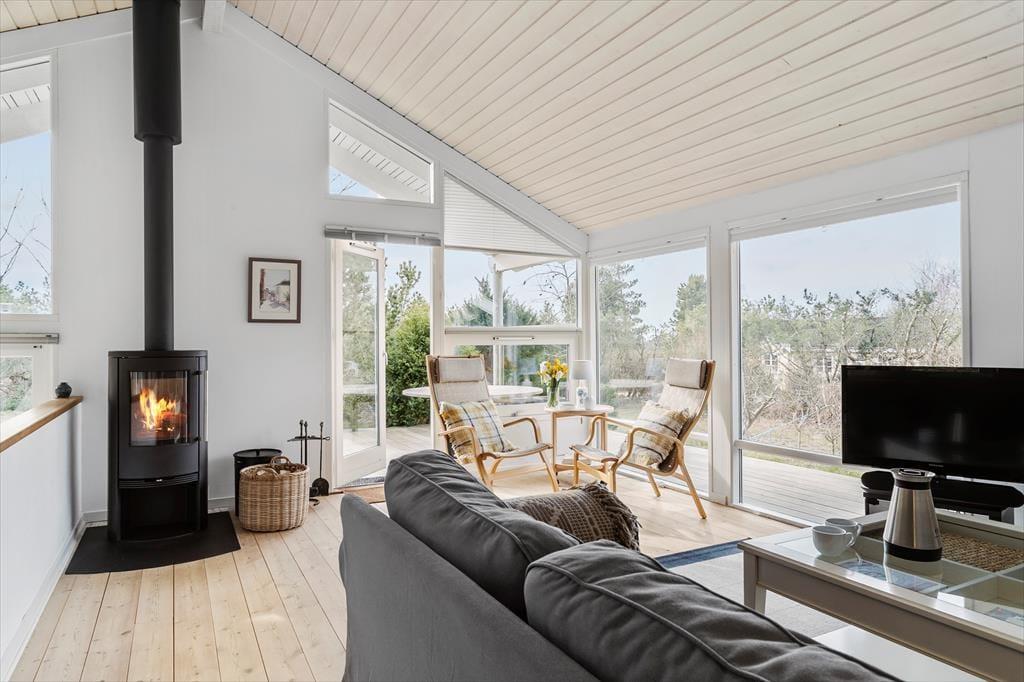Fint udsyn fra det store alrum; her er der trægulv og brændeovn. Åbent til køkken med hvidevarer i god kvalitet og til spisepladsen; stige til hems og flere udgange til terrassen. Tre værelser med dobbeltsenge. - laminatgulv i alle tre værelser.