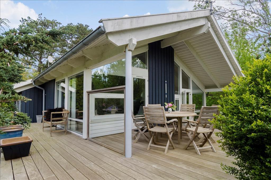 Terrasse i hårdt træ i flere niveauer, delvist overdækket. På grunden flere fine kroge, hvor man kan finde sol, skygge og læ.