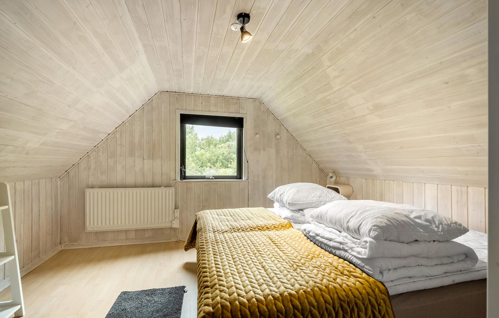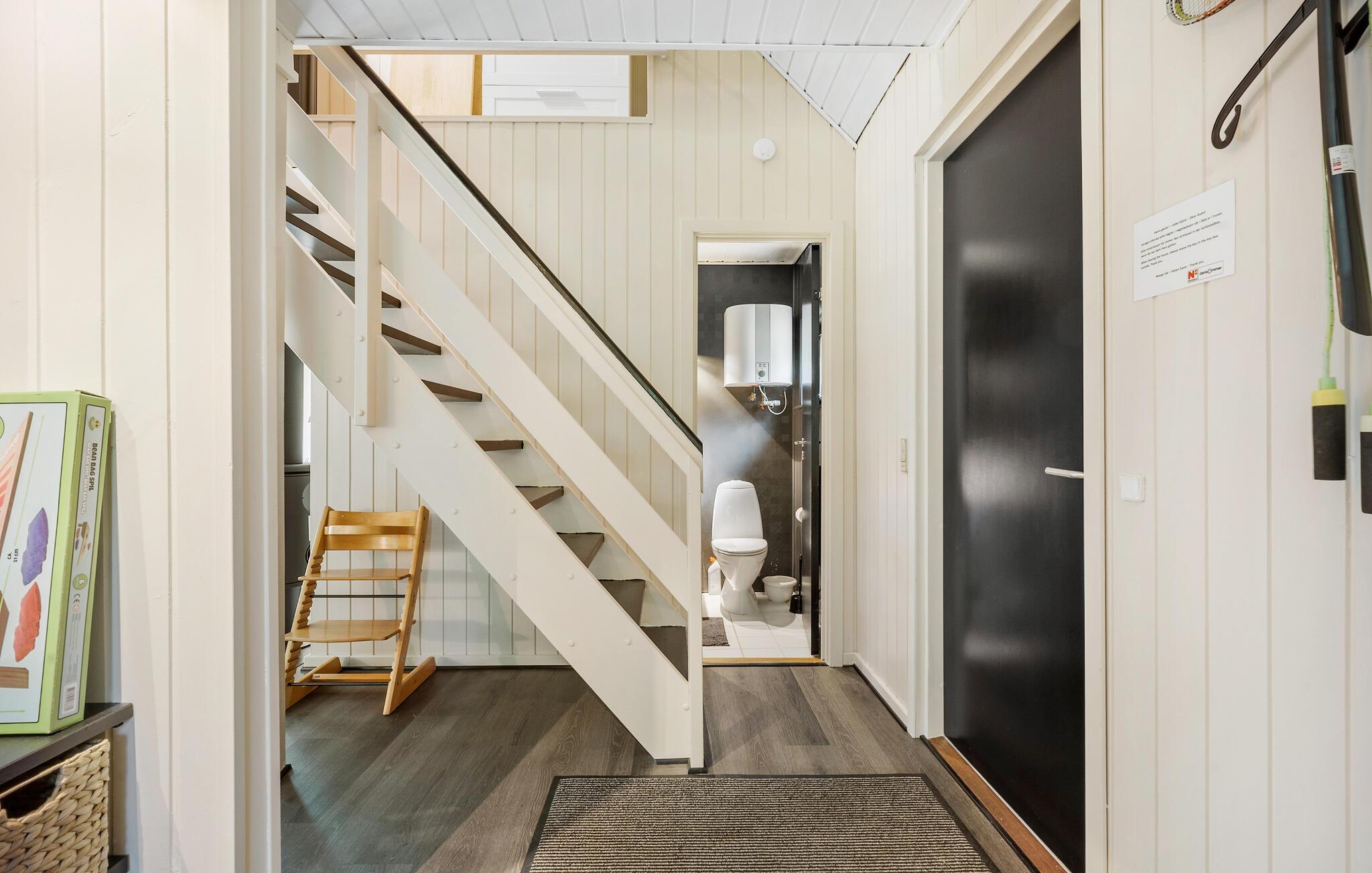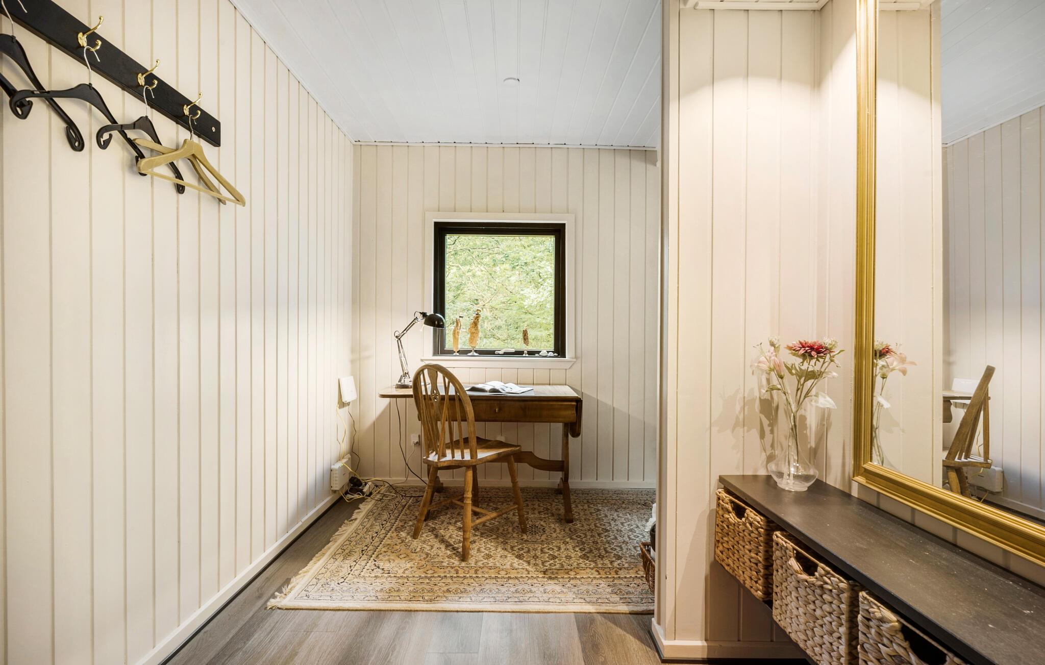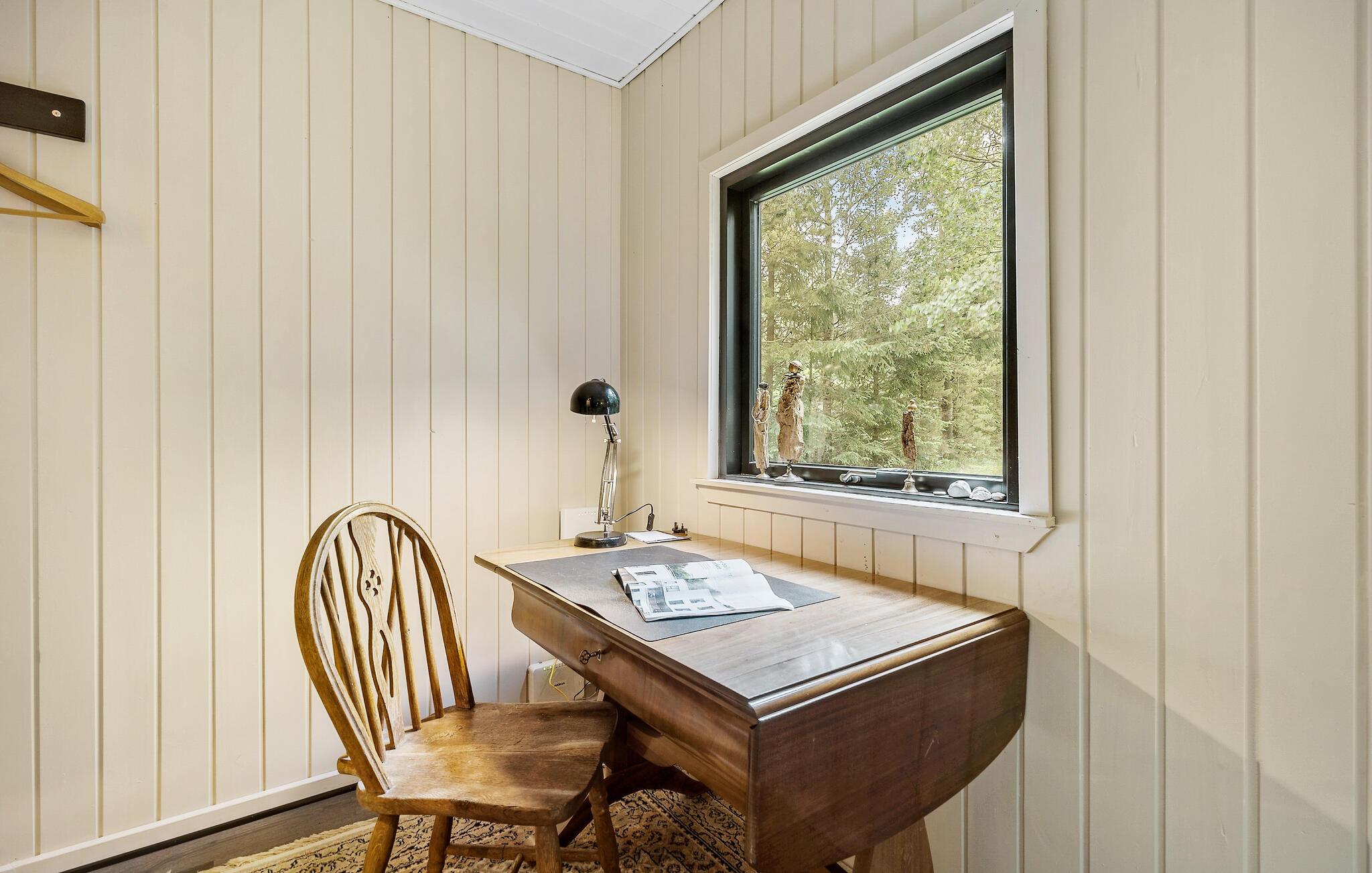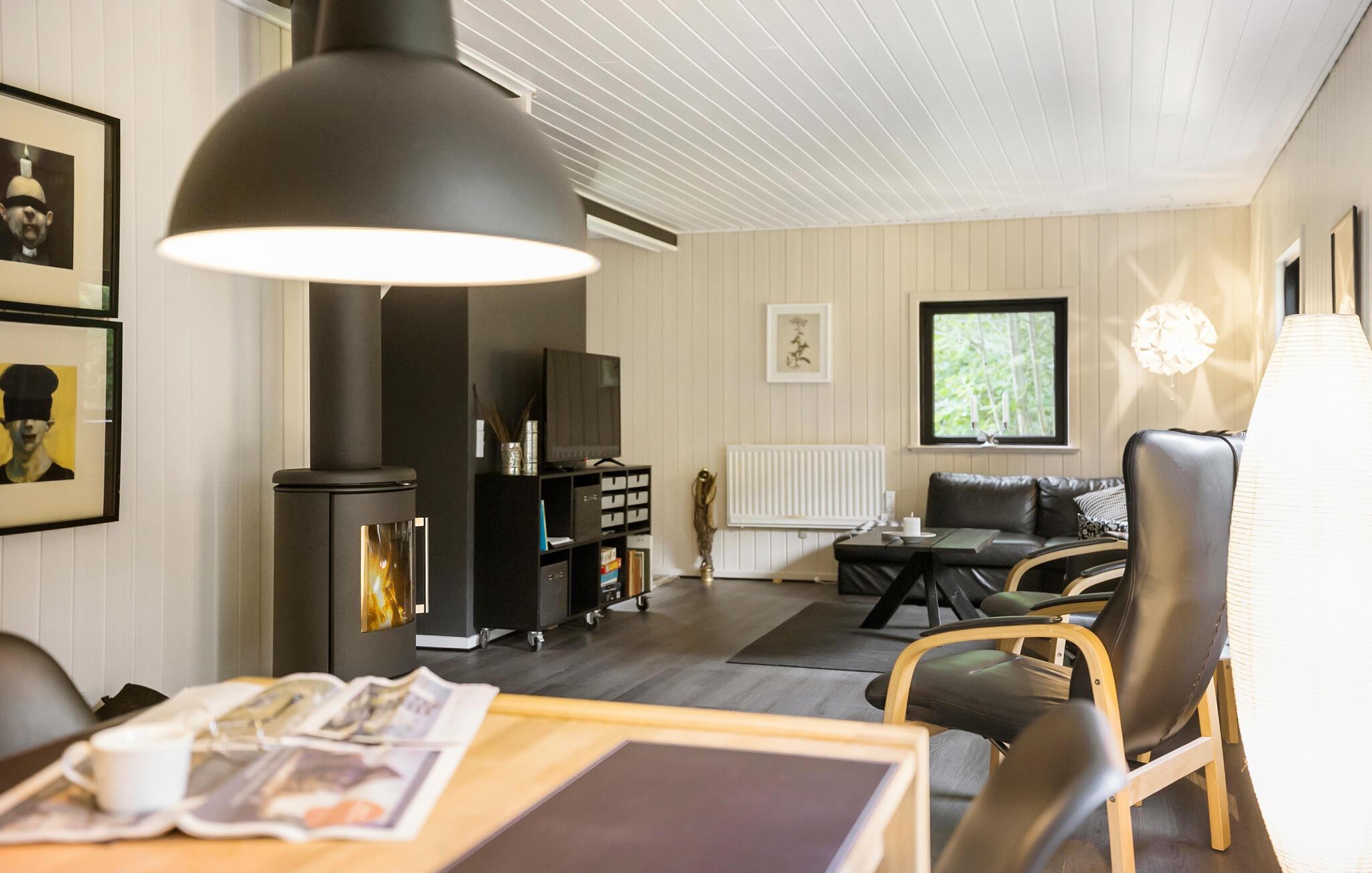 Der er lagt op til en afslappende ferie i dette hus, som har en fredfyldt beliggenhed på en grund, som er omkranset af træer. Husets mange vinduer giver jer en dejlig udsigt over den grønne have, så boligen har en skøn forbindelse mellem ude og inde. Efter dagens aktiviteter kan I læne jer godt tilbage i det hyggelige opholdsområde til lyden af gnisterne i brændeovnen.
