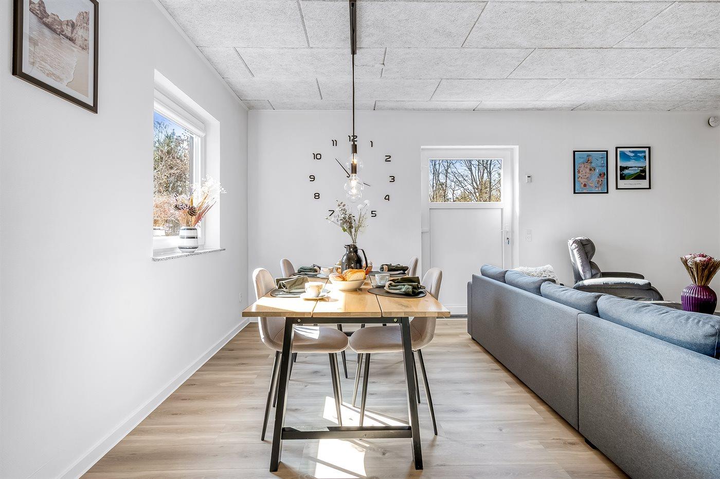 Indvendigt fremstår sommerhuset lyst og moderne med en rigtig god planløsning, præcis som man forventer det af et nybygget sommerhus. Husets hjerte er den store åbne stue med køkken-alrum, som er et dejligt sted at samle familien til feriehygge, hvis vejret skulle svigte. Sommerhuset er med to gode soveværelser helt oplagt til f.eks. en familie med 1-2 børn eller blot et par, som ønsker at holde ferie i disse naturskønne omgivelser.