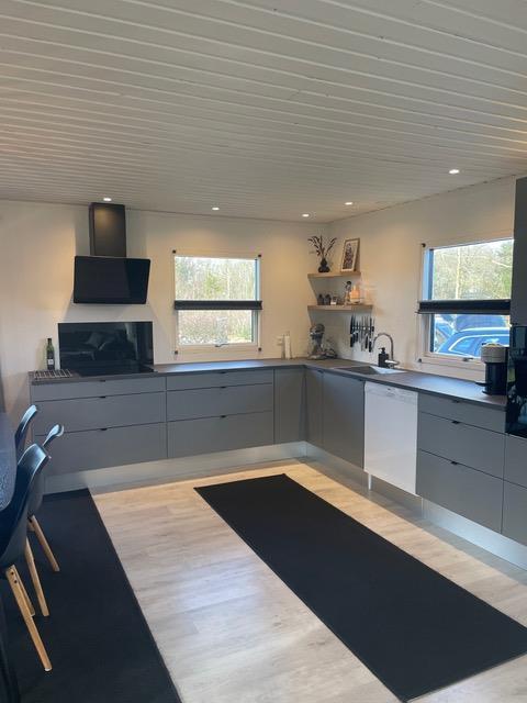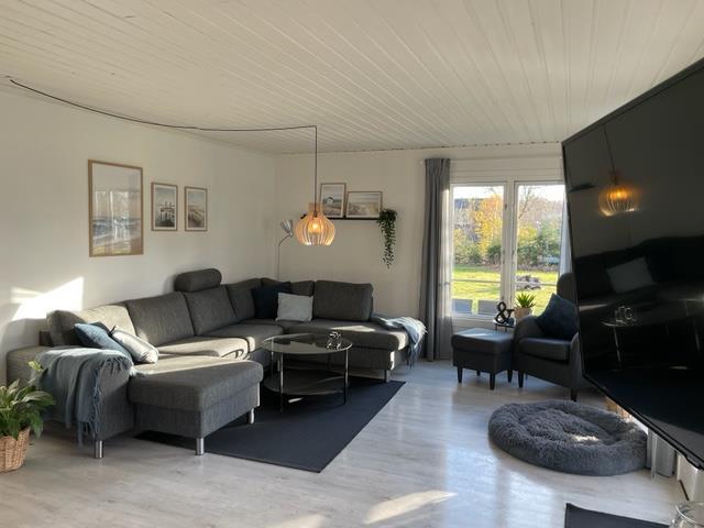 Dejlig, rummelig stue med skønt sofahjørne med plads til hele familien og spiseplads, også med god plads hvis nogen for eksempel vil spille brætspil, mens andre tilbereder maden i det nye, lækre køkken, der ligger i åben forbindelse med stuen. Køkkenet har bl.a opvaskemaskine og mikroovn.