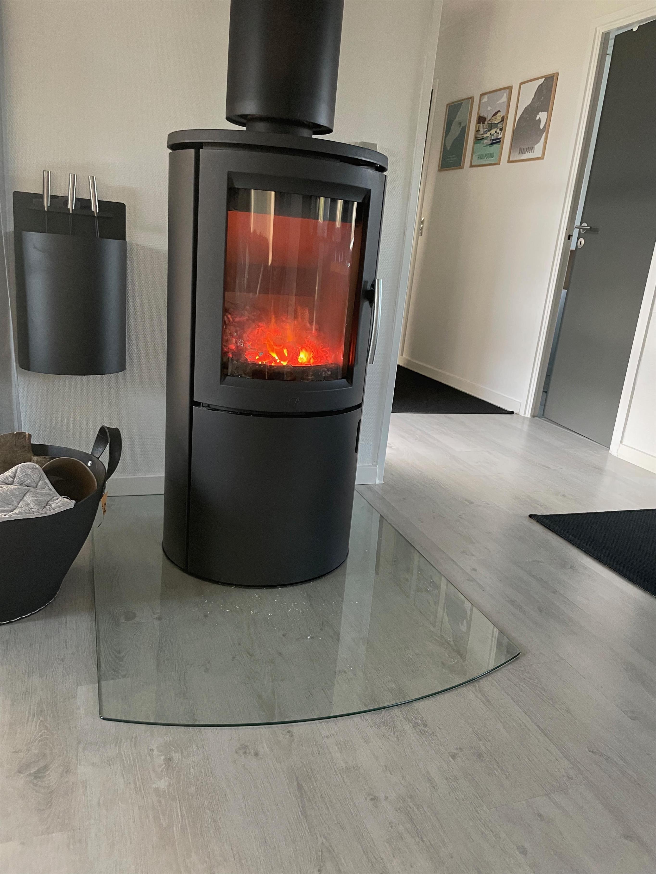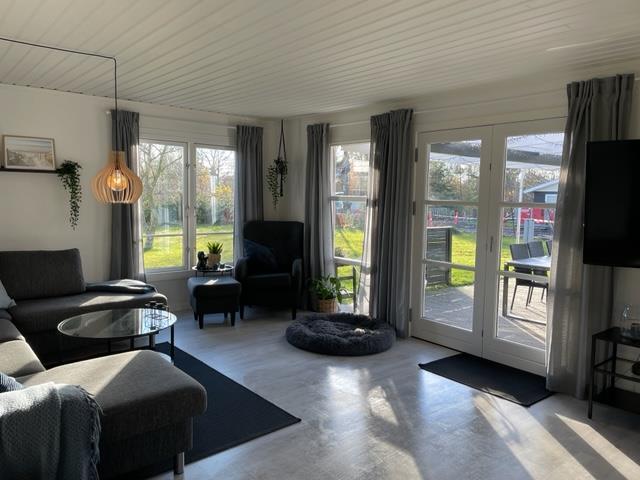 Stuen har store vinduer, så I kan nyde udsigten til alt det grønne. Der er dobbelte døre ud til den store, overdækkede terrasse. Der er TV med danske kanaler, kabel-TV samt Chromecast. I kan tænde op i brændeovnen - for hygge eller måske opvarmning på en kølig aften.