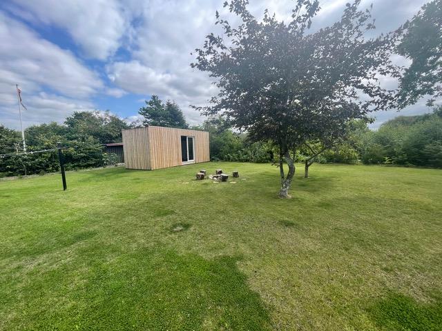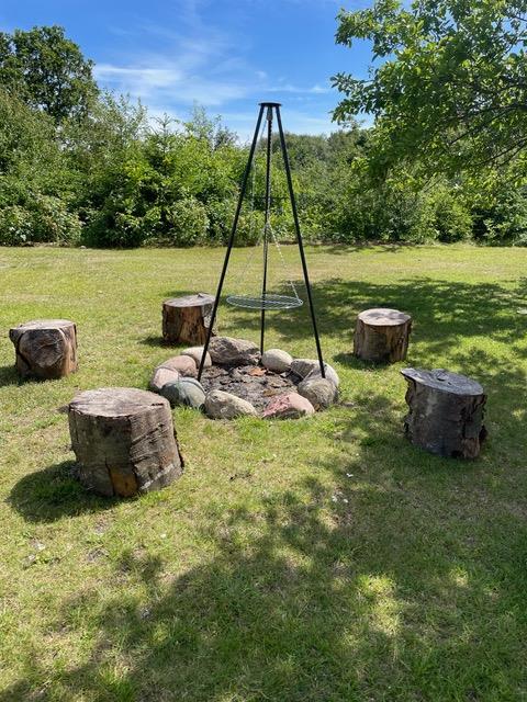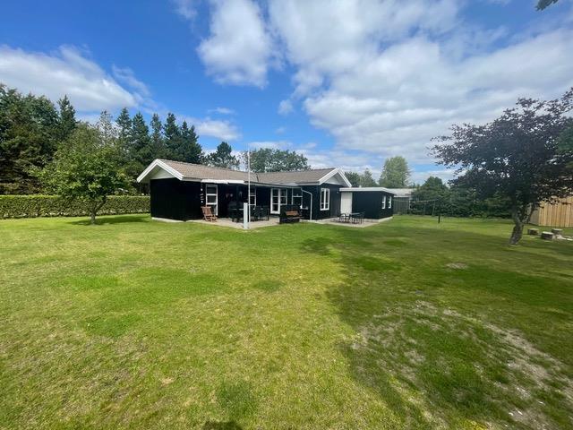 Huset ligger på en dejlig, tilvokset grund på ca. 1200 m2. Der er to terrasser ved huset – en åben terrasse på 20 m2 og en overdækket terrasse på 35 m2. Her kan I sidde og grille om aftenen, også hvis vejret ikke er helt, som man kunne ønske sig. Der er bålplads, så I kan bage snobrød eller riste pølser, og der er også p-plads på grunden.