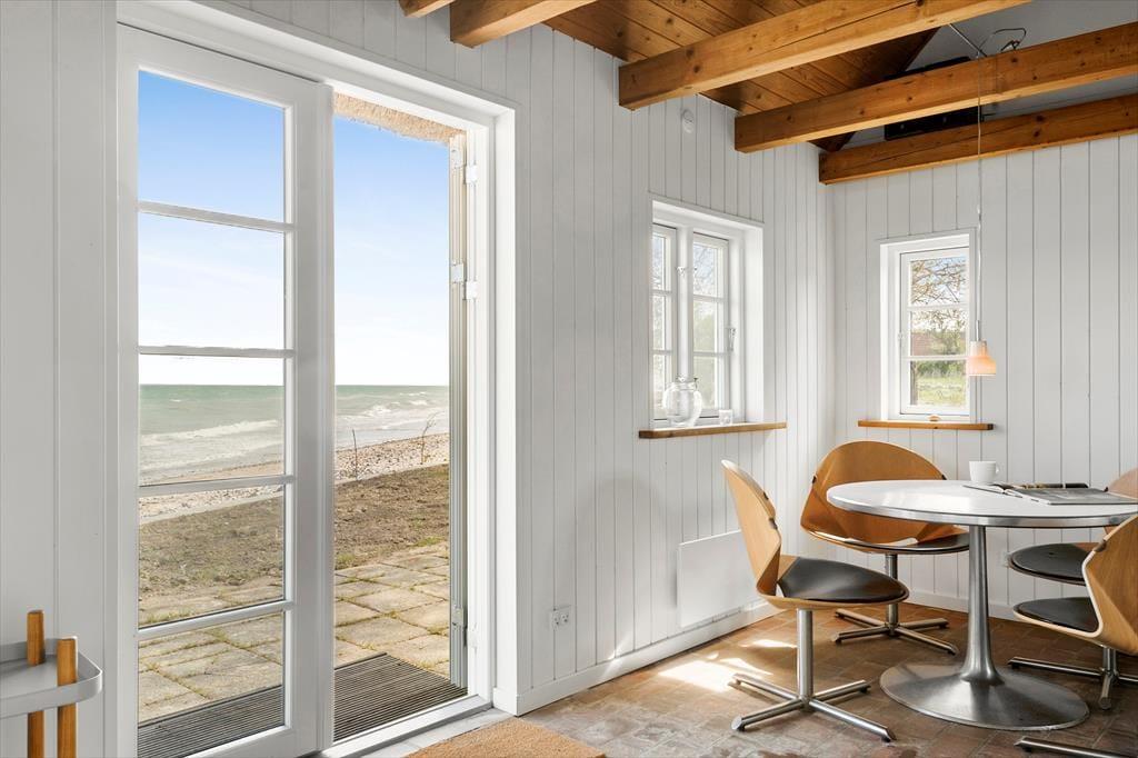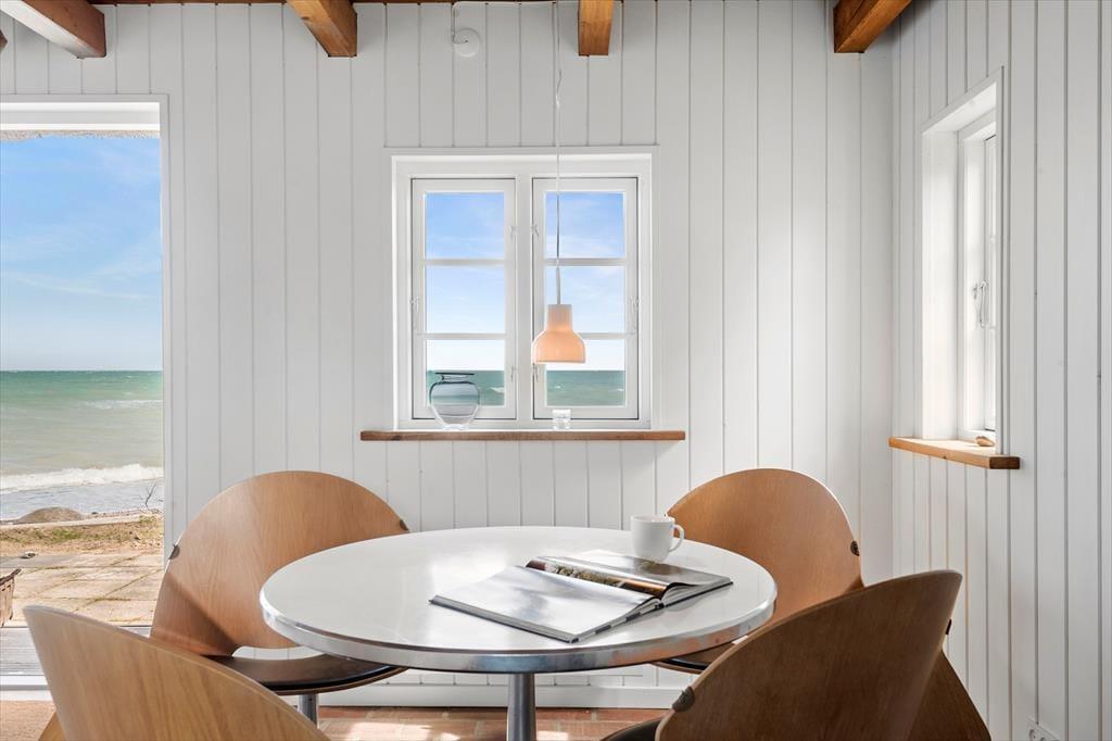 Hyggelig opholdsstue med skøn udsigt til vandet samt udgang til morgenterrasse. Spisehjørne.