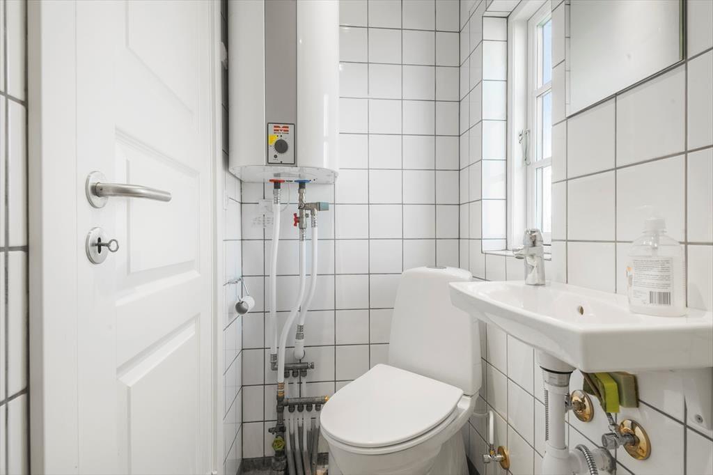 Badeværelse med toilet, håndvask og bruser.