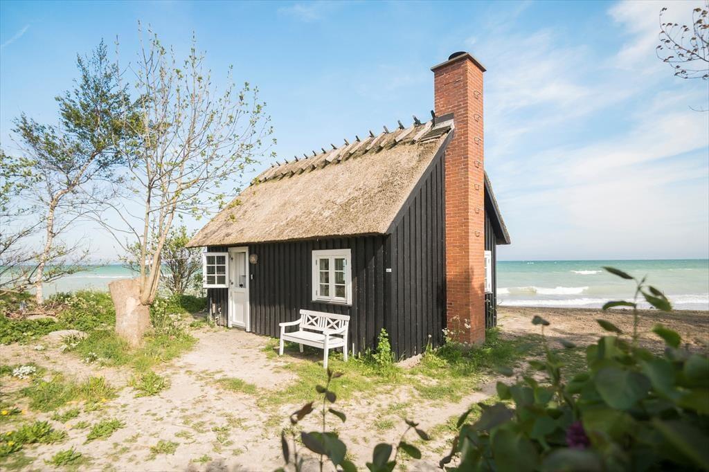 Lille træhus med stråtag, helt fantastisk beliggende direkte på stranden. Naturgrund. Sommerhuset ligger på Vest Møn tæt ved landsbyen Fanefjord som ligger ca. 7 km væk, hvor daglig Brugsen har åbent alle ugens dage. Der er heller ikke langt til Stege, Møns største handelsby med mange muligheder for shopping og cafe- og restaurant besøg.