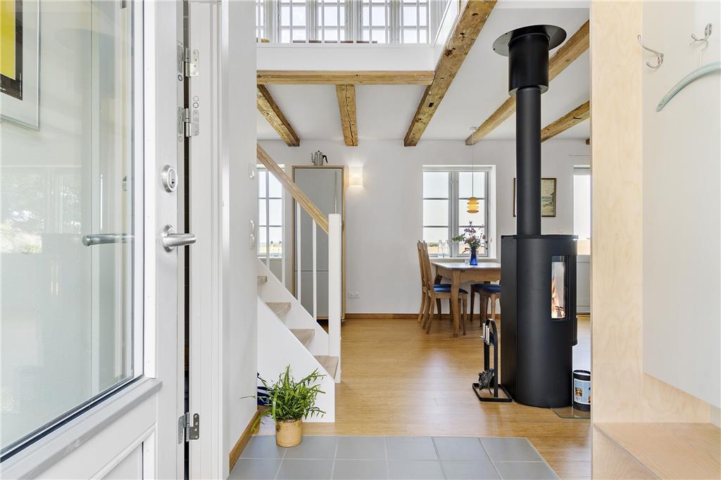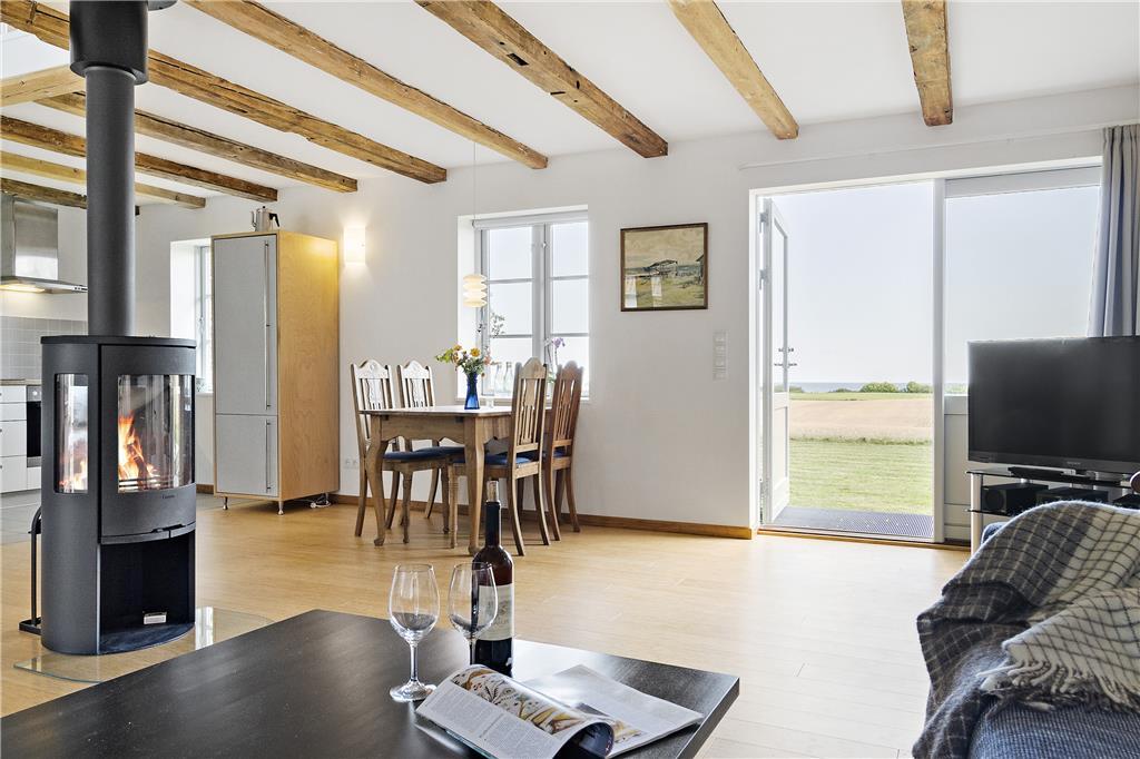 Indgang fra den hyggelige gårdsplads til lejligheden. Her kommer man ind i en skøn stue i åben forbindelse med klinkebelagt køkken. I stuen er der dejlig sofahjørne, god brændeovn midt i rummet og TV (kun tyske TV-kanaler). Ligeledes er der en dejlig spiseplads med havudsigt