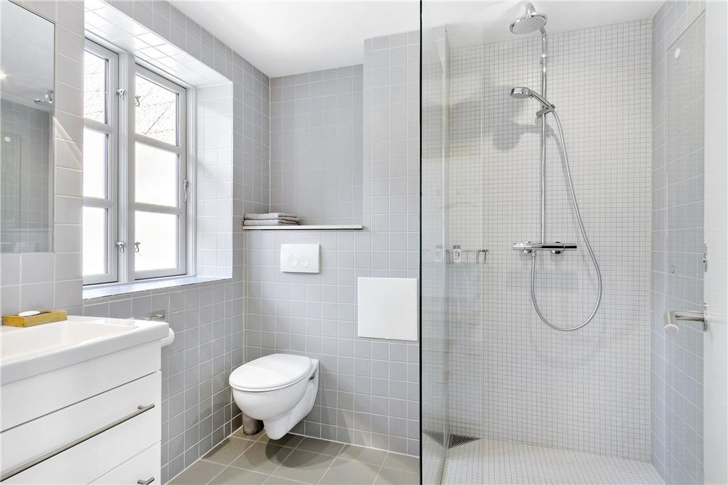 Dejligt lyst og fint badeværelse med toilet, håndvask og brusekabine.