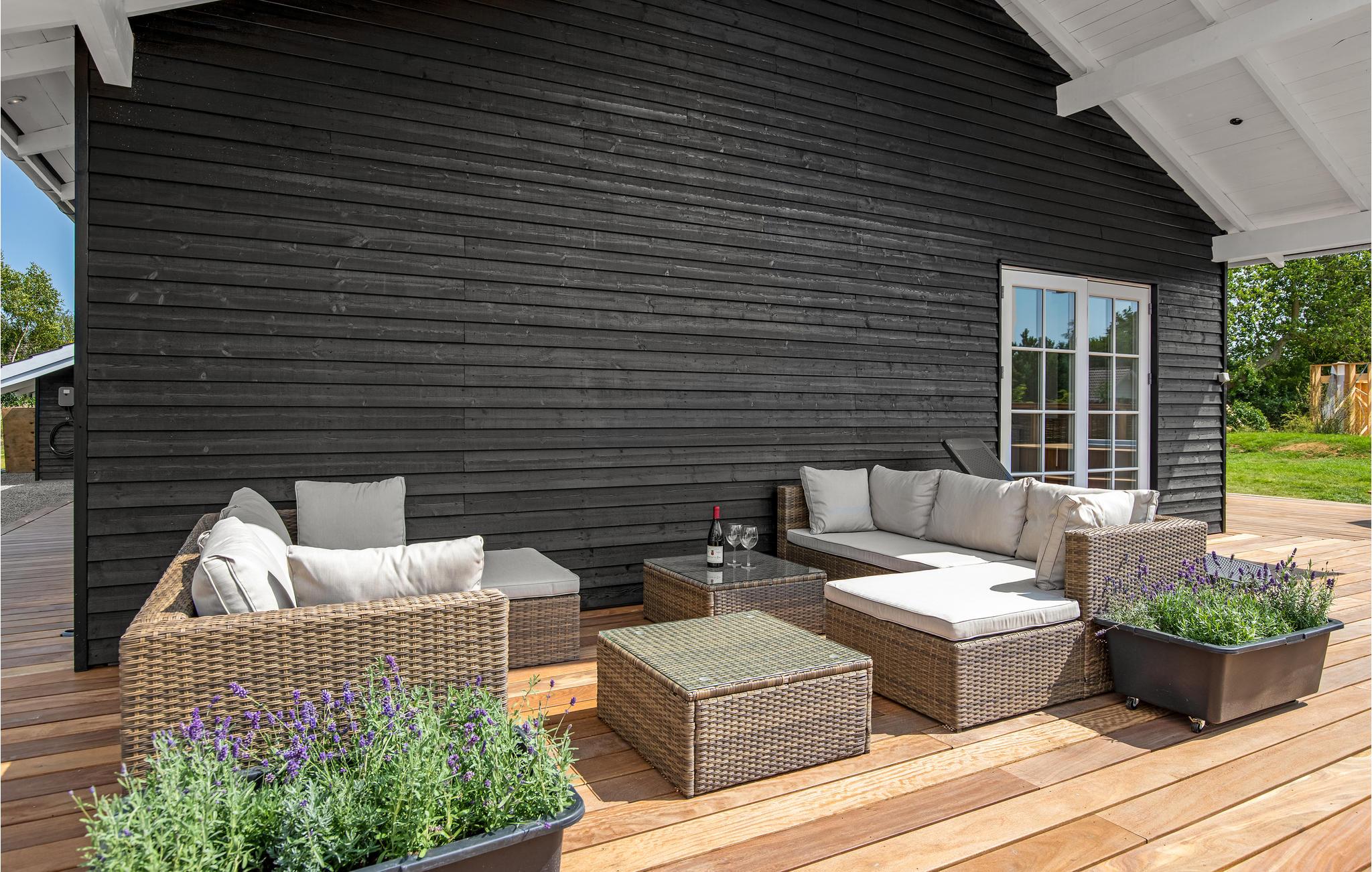 Moderne sommerhus nær stranden med vildmarksbad, sauna og stor terrasse for afslapning og familiehygge.