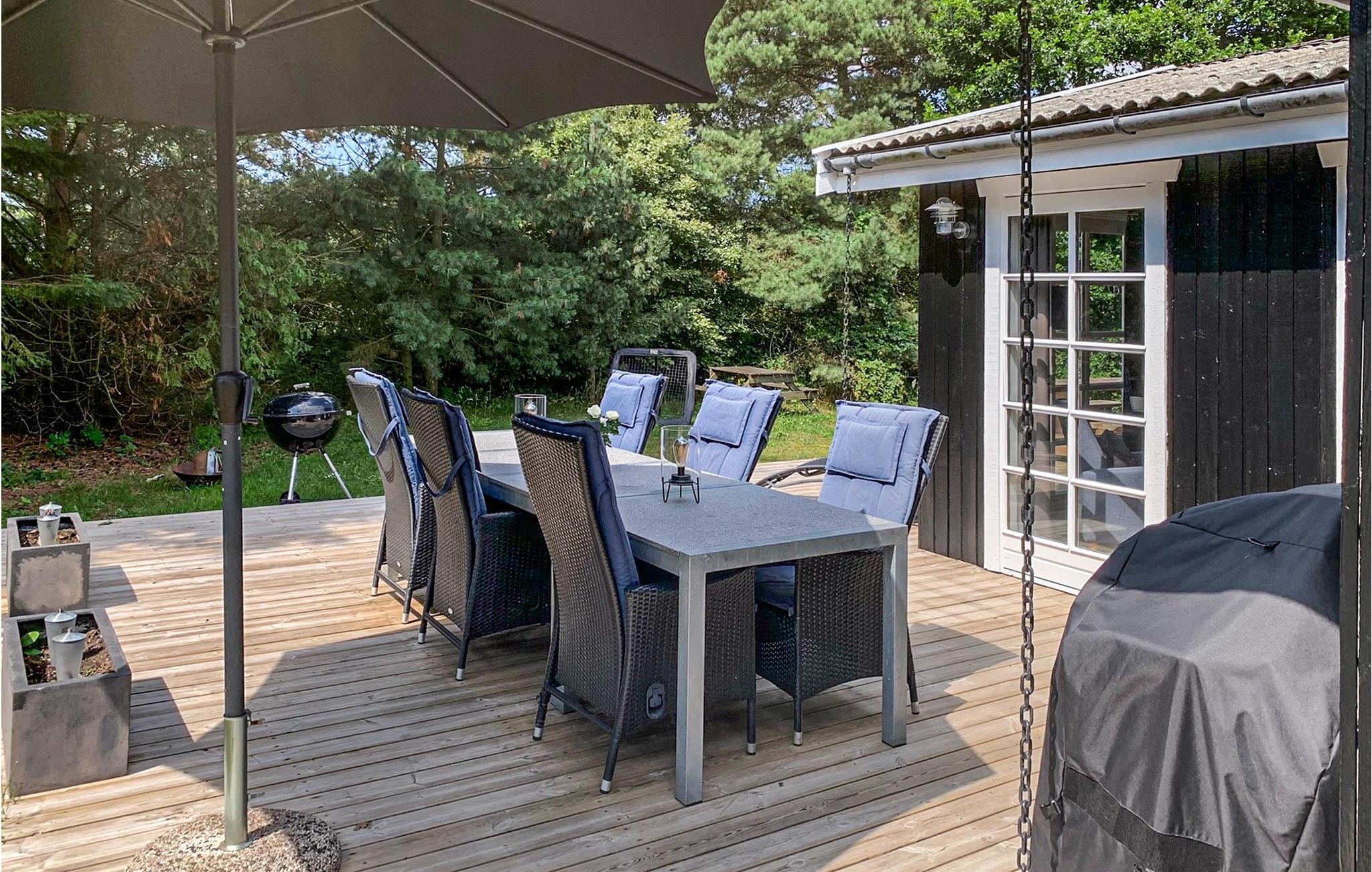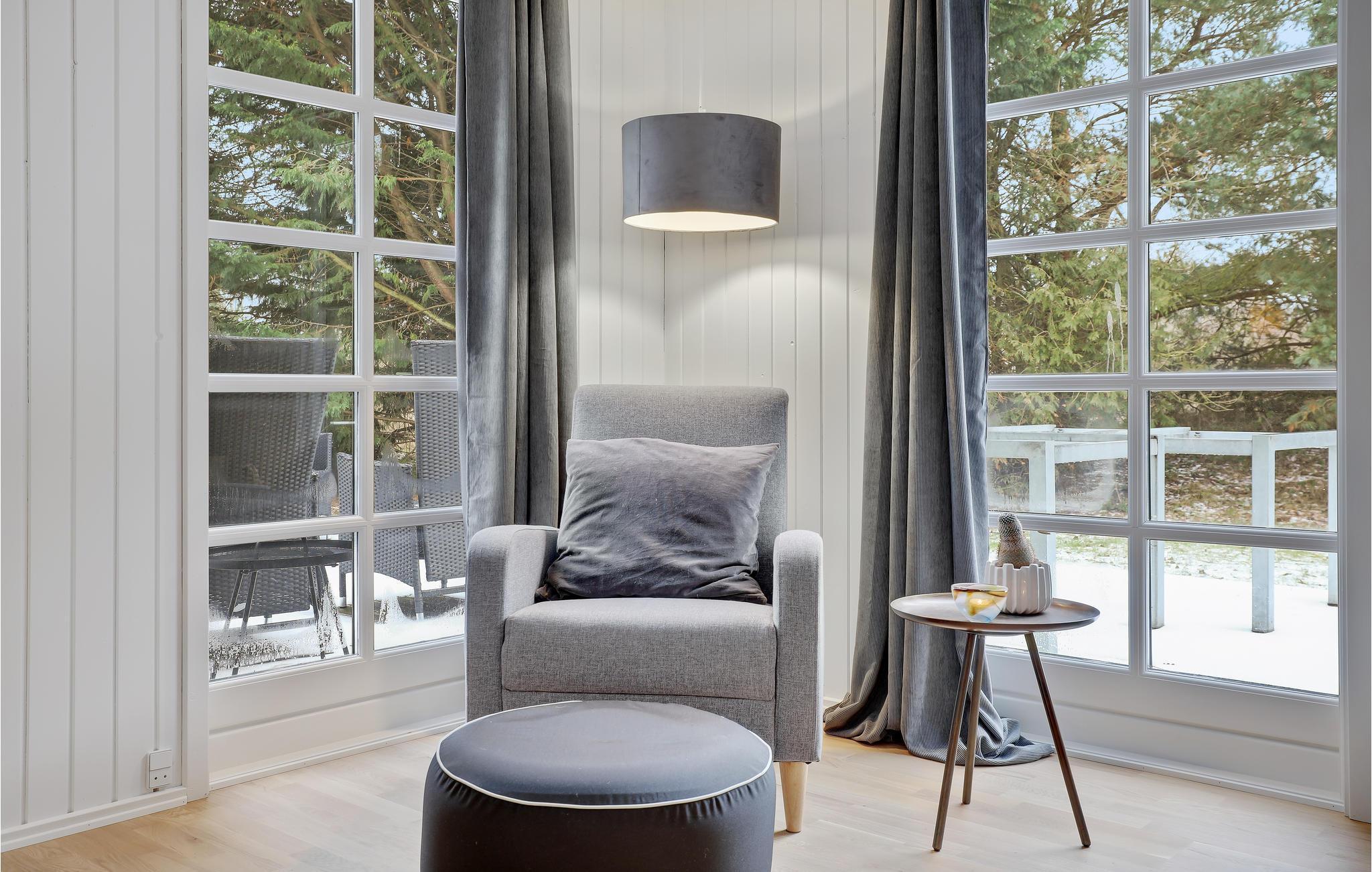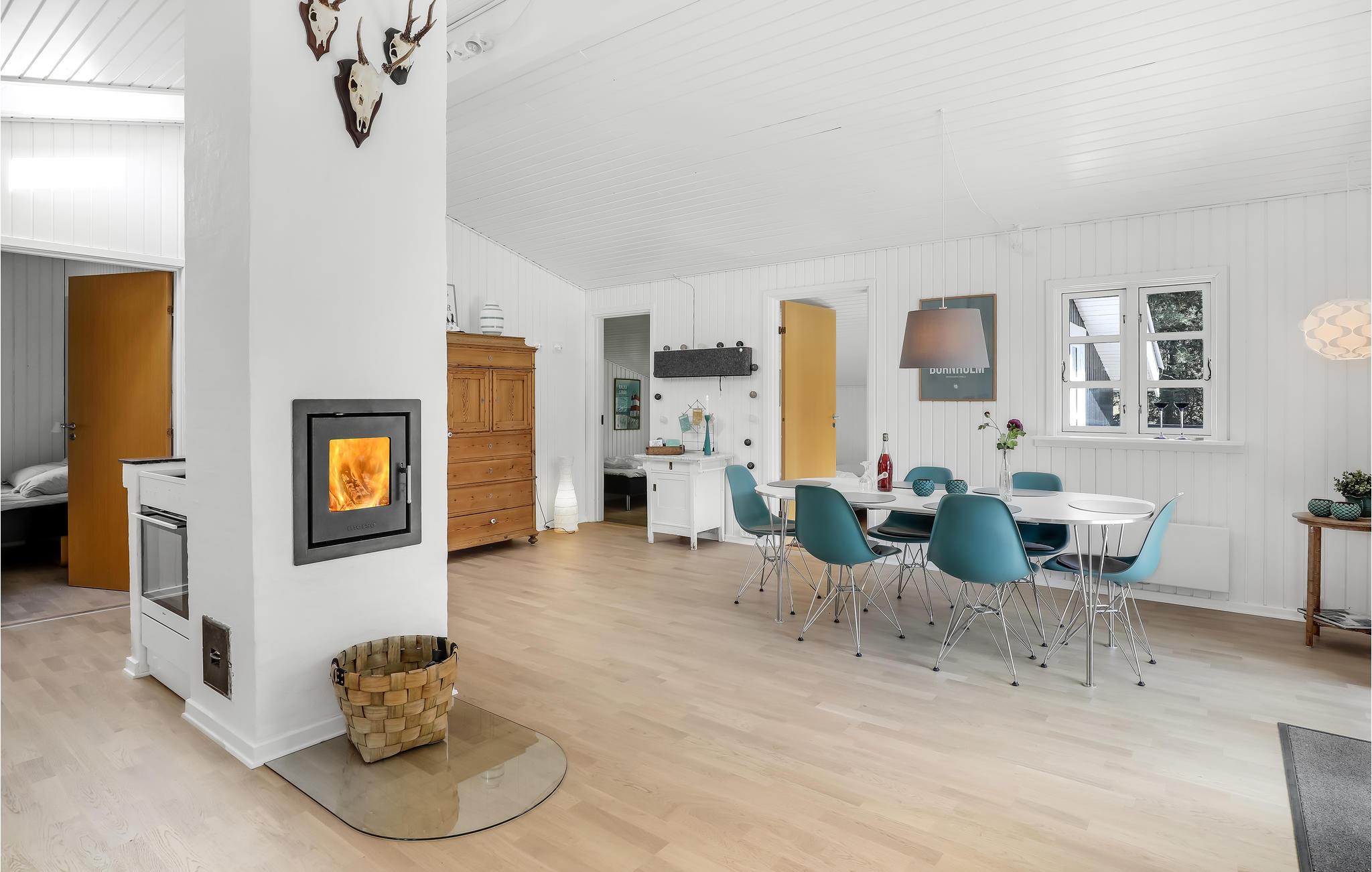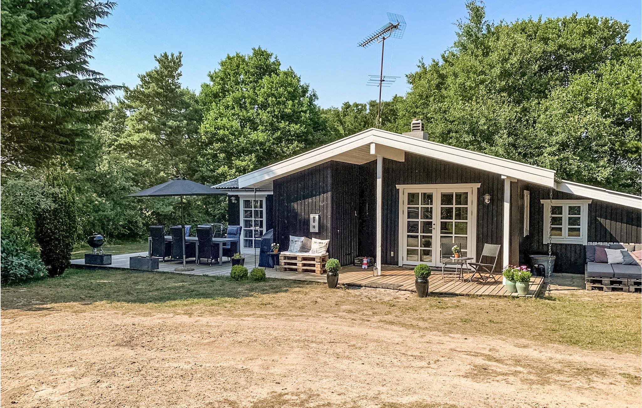 Nydeligt og velindrettet sommerhus med flot og moderne møblering i lyse og indbydende farver og en meget rar stemning overalt i huset. Dette sommerhus fremtræder overalt lyst og velindrettet, og byder bl.a. på en godt åbent køkken, pejs og varmepumpe samt gratis internet. Dejligt åbent miljø der indbyder til ro, afslapning og feriehygge.Flot separat opholdsstue med komfortable møbler og med udsigt til smuk natur. Dejligt stort badeværelse med spa-bad og sauna, hvor I kan slappe af og forkæle jer selv. Huset ligger i et dejligt sommerhusområde, og byder også på en god og uforstyrret træterrasse hvor I kan nyde ferien i husets komfortable havemøbler og spise mad fra grill. På grunden er der også plads til leg og boldspil. Der er ca. 1 km til en glimrende sandstrand. Husets mange moderne faciliteter gør det velegnet til ferie uanset årstid.