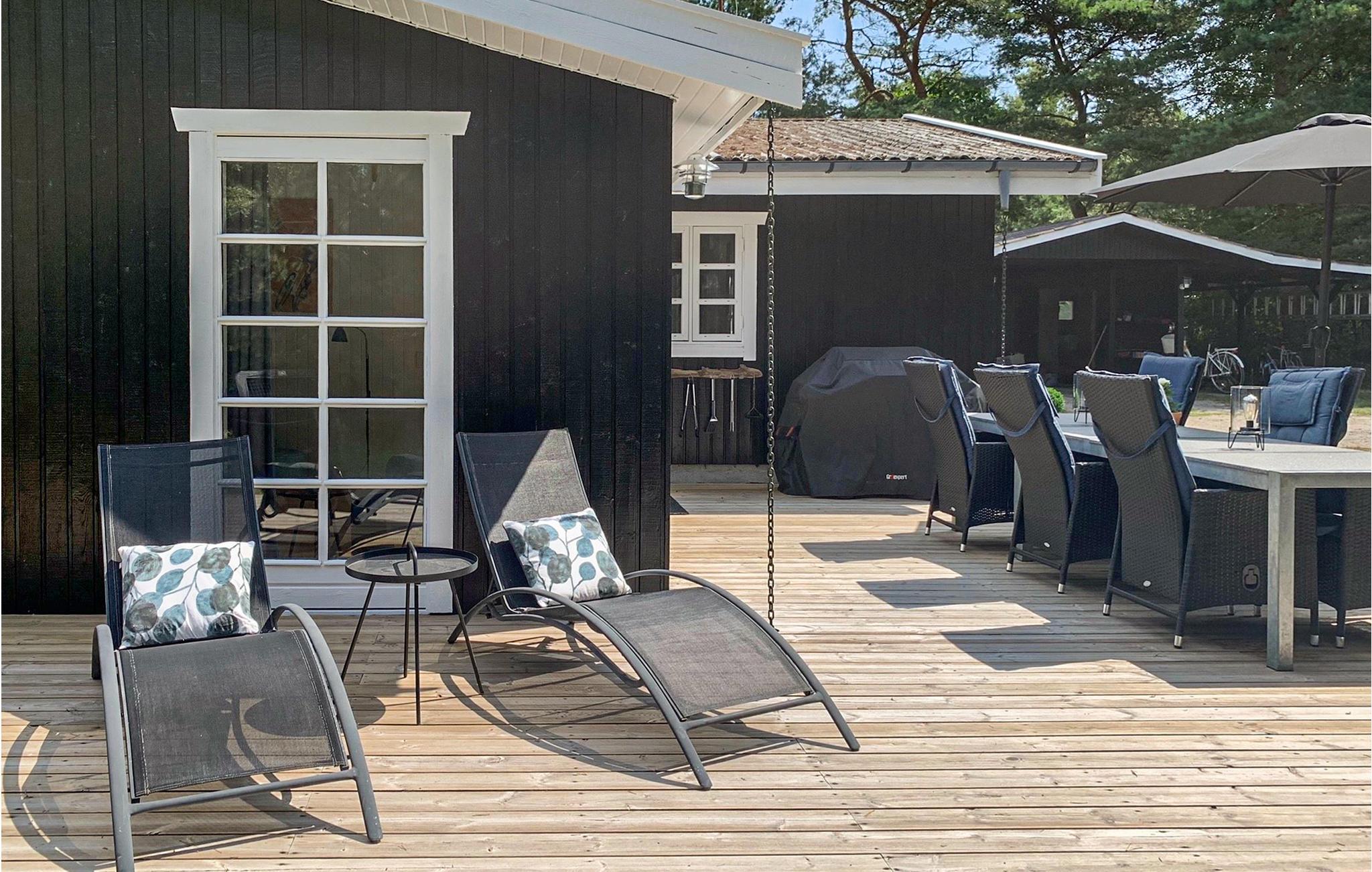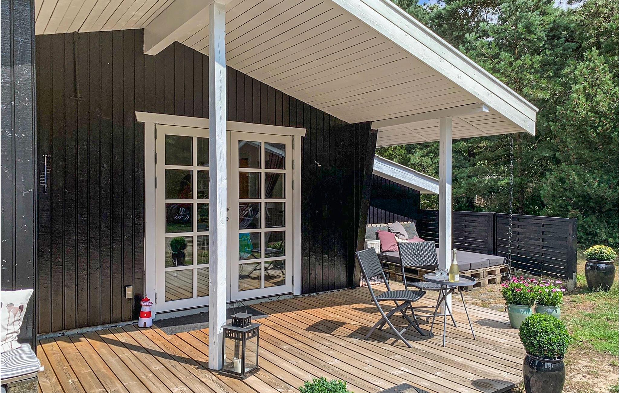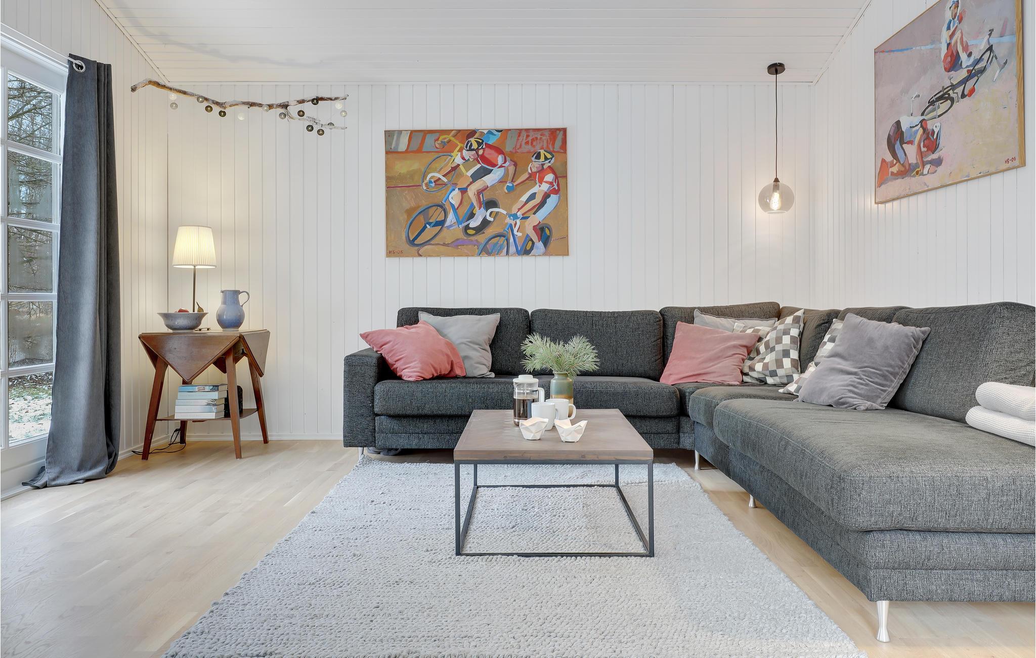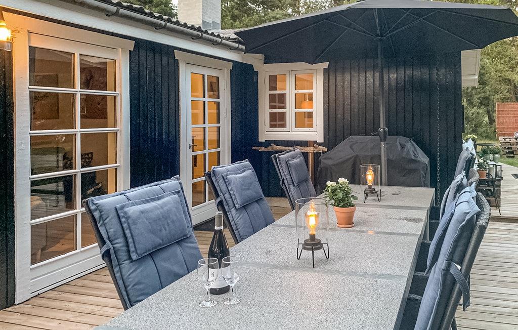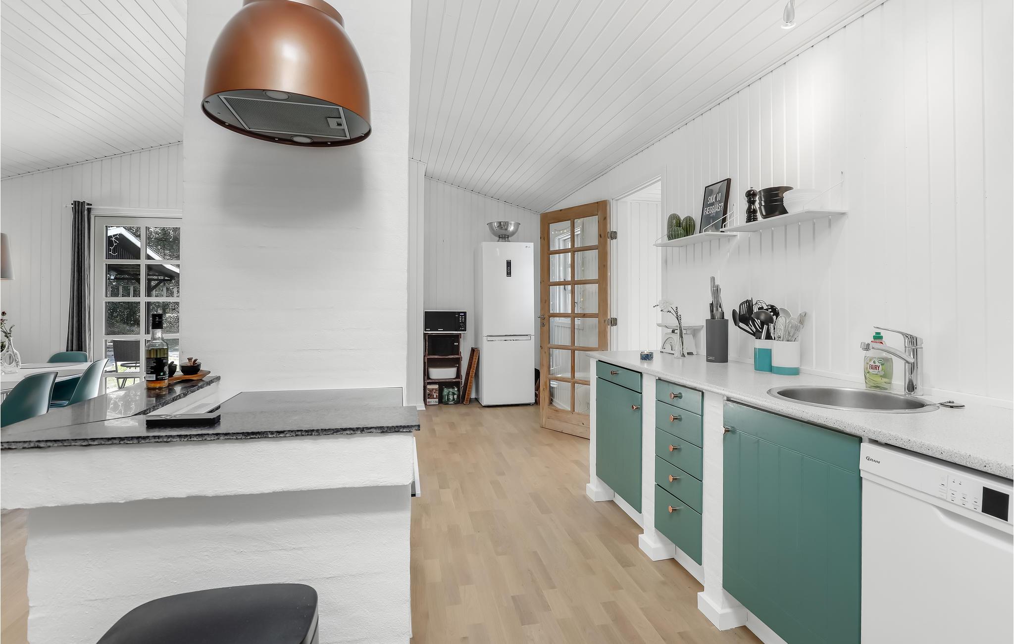 Nydeligt og velindrettet sommerhus med flot og moderne møblering i lyse og indbydende farver og en meget rar stemning overalt i huset. Dette sommerhus fremtræder overalt lyst og velindrettet, og byder bl.a. på en godt åbent køkken, pejs og varmepumpe samt gratis internet. Dejligt åbent miljø der indbyder til ro, afslapning og feriehygge.Flot separat opholdsstue med komfortable møbler og med udsigt til smuk natur. Dejligt stort badeværelse med spa-bad og sauna, hvor I kan slappe af og forkæle jer selv. Huset ligger i et dejligt sommerhusområde, og byder også på en god og uforstyrret træterrasse hvor I kan nyde ferien i husets komfortable havemøbler og spise mad fra grill. På grunden er der også plads til leg og boldspil. Der er ca. 1 km til en glimrende sandstrand. Husets mange moderne faciliteter gør det velegnet til ferie uanset årstid.