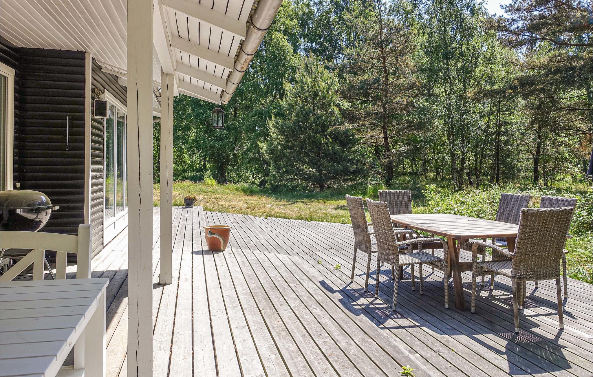 Den store, delvist overdækkede træterrasse er et klart højdepunkt ved huset. Her finder I mange havemøbler - herunder både åbne og overdækkede spisepladser - og en grill til hyggelige grillaftener. terrassen er det perfekte sted at nyde solen og at drikke en kold øl eller et godt glas vin. I haven har børnene god plads til leg og aktivitet, og de vil uden tvivl elske gyngen.