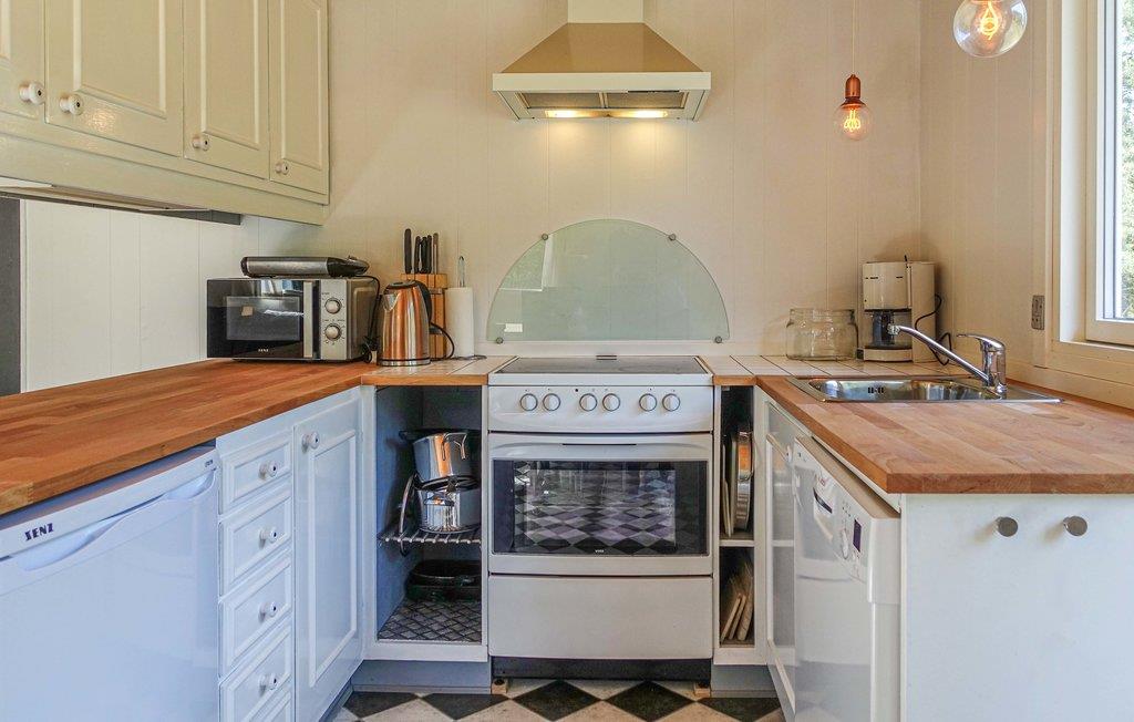 Sommerhusets hjerte er den hyggelige og smagfuldt indrettede opholdsstue, hvor I kan se film fra det behagelige sofarrangement, høre radio eller musik og nyde varmen og hyggestemningen fra brændeovnen i køligere sæsoner. Det veludstyrede køkken ligger i åben forbindelse med opholdsstuen. Vaskemaskine og tørretumbler i udhus.