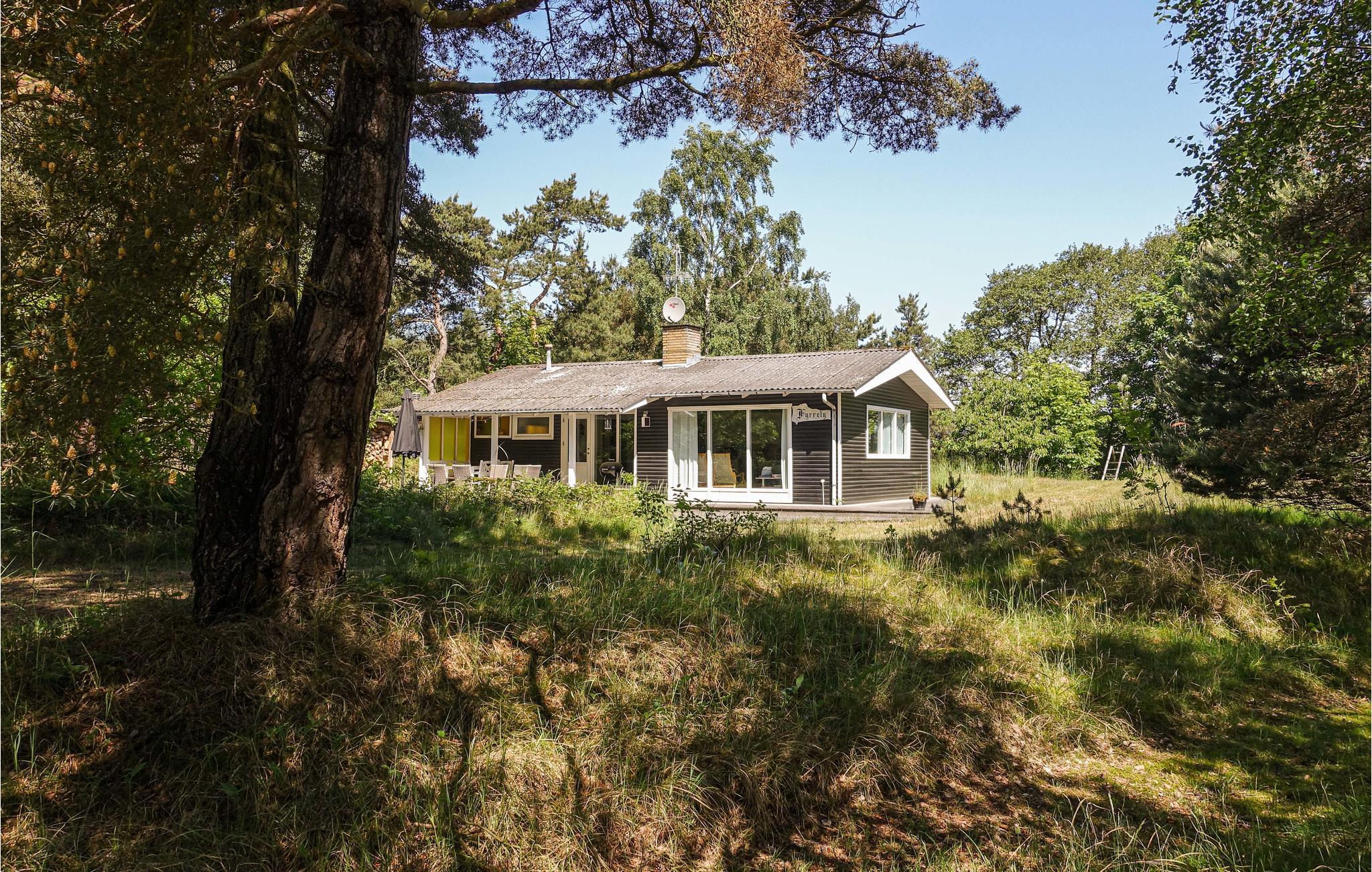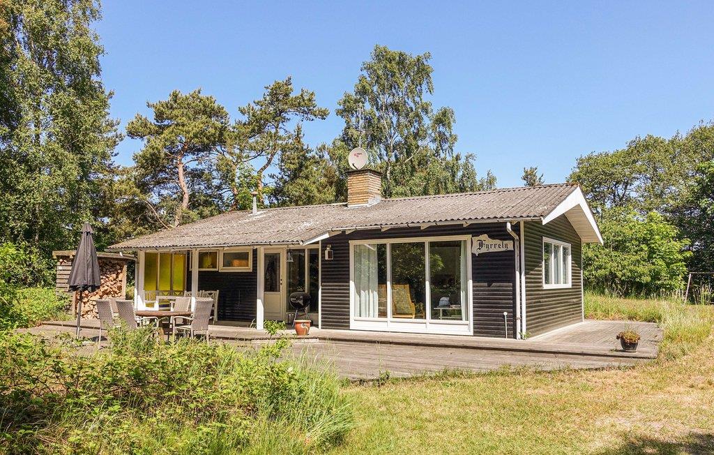 Hyggeligt sommerhus på stor naturgrund nær børnevenlig sandstrand med stor terrasse og brændeovn.