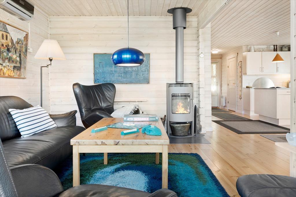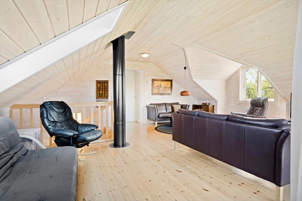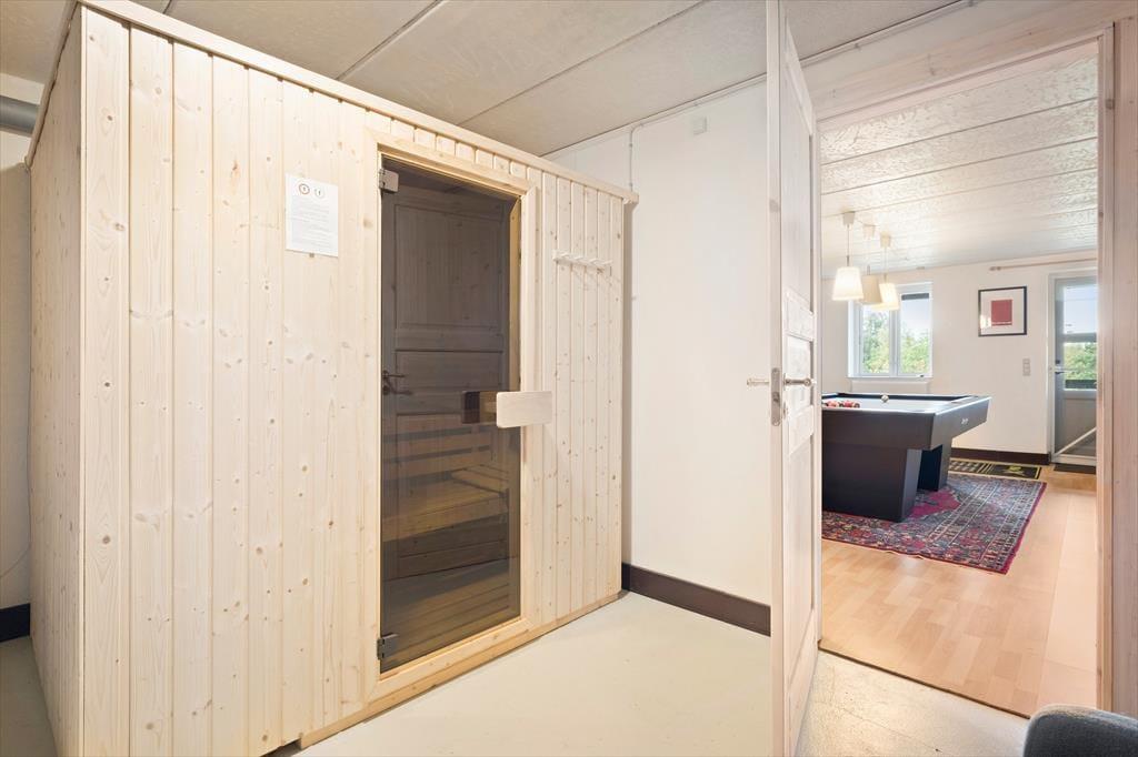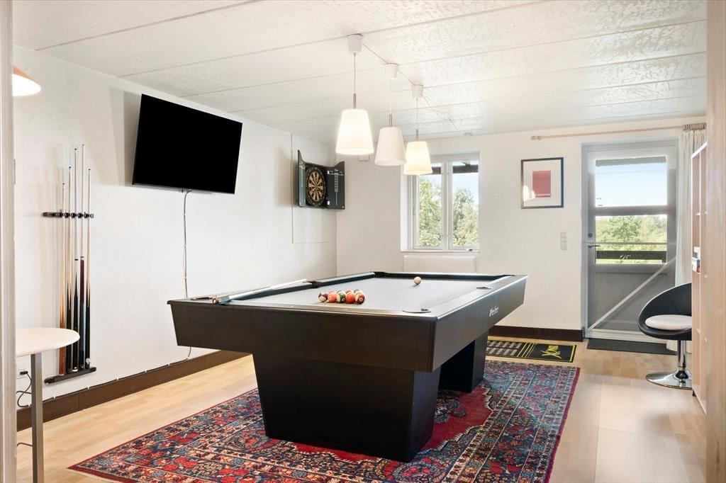Sommerhusets planløsning breder sig over tre etager, og der er hele 221 m2 at brede sig på, så du kan sagtens invitere venner og familie med på ferie. I alt er der sengepladser til seks voksne og to børn, for der er et værelse i stueplan og to på førstesalen, og derudover står der en dobbelt sovesofa i førstesalens stue. Også stueplanet byder på et dejligt opholdsrum, og her kan I hygge igennem med brætspil nær brændeovnen, fællesmadlavning og gode middage omkring spisebordet. Er det tid til sjov og leg, er der en spillekonsol i huset, og i underetagens aktivitetsrum kan I dyste i både billard og dart. Trænger du derimod til total afslapning, kan du tage en tilbagelænet pause i saunaen.