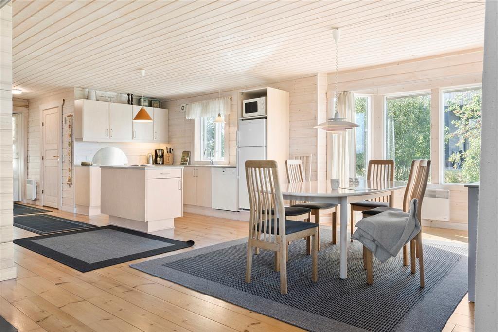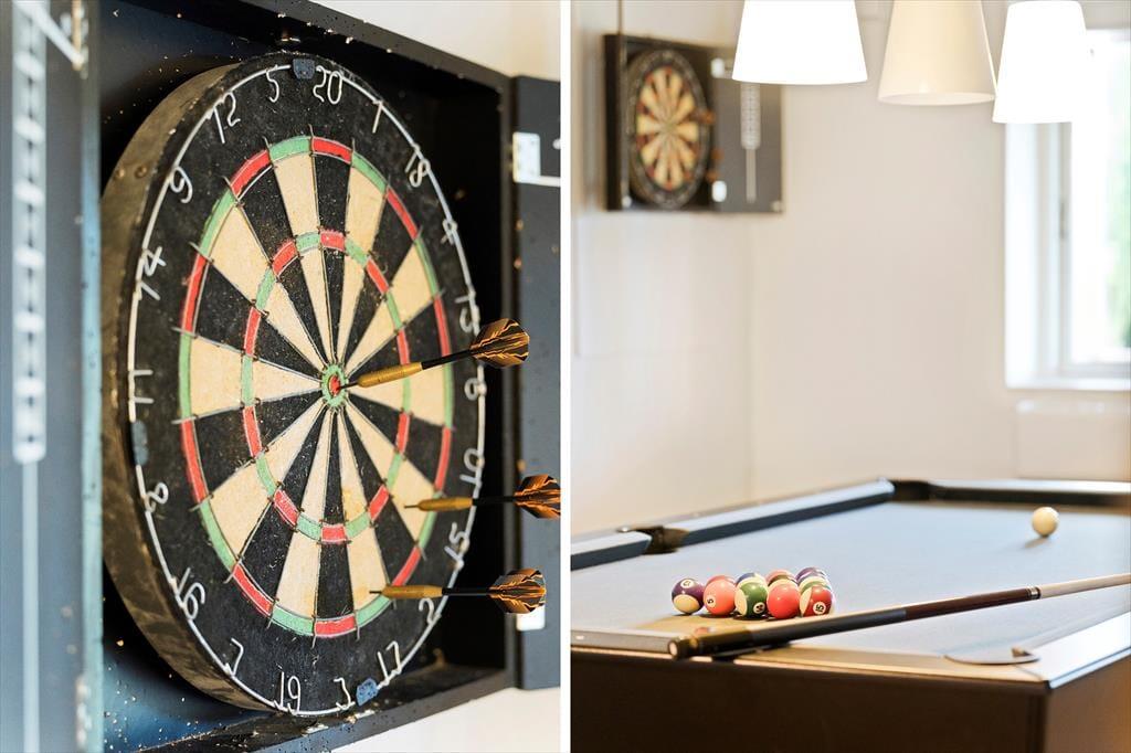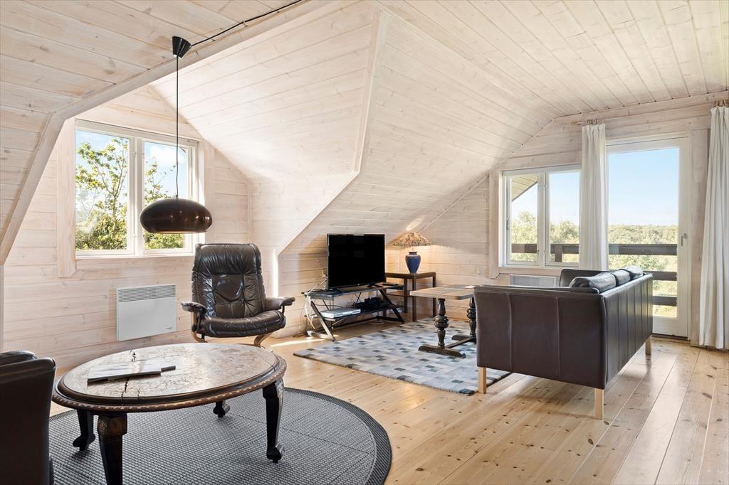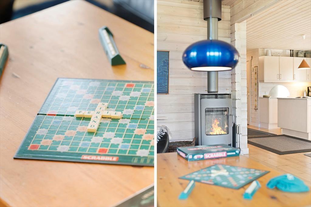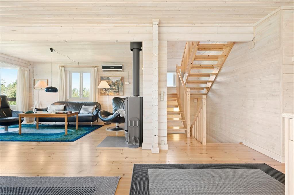 Sommerhusets planløsning breder sig over tre etager, og der er hele 221 m2 at brede sig på, så du kan sagtens invitere venner og familie med på ferie. I alt er der sengepladser til seks voksne og to børn, for der er et værelse i stueplan og to på førstesalen, og derudover står der en dobbelt sovesofa i førstesalens stue. Også stueplanet byder på et dejligt opholdsrum, og her kan I hygge igennem med brætspil nær brændeovnen, fællesmadlavning og gode middage omkring spisebordet. Er det tid til sjov og leg, er der en spillekonsol i huset, og i underetagens aktivitetsrum kan I dyste i både billard og dart. Trænger du derimod til total afslapning, kan du tage en tilbagelænet pause i saunaen.