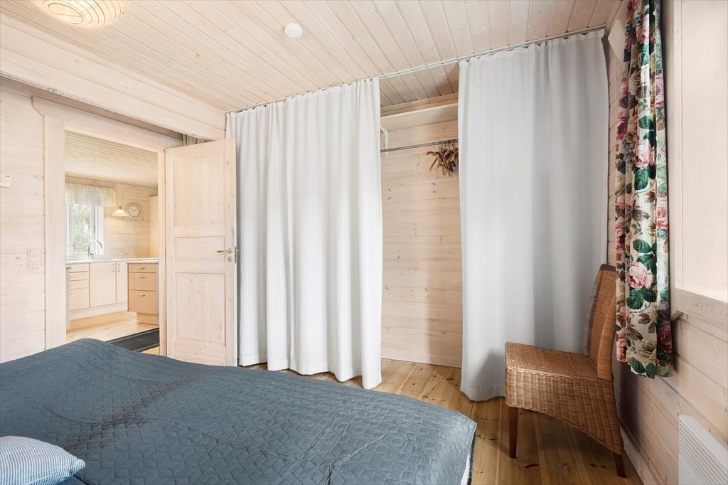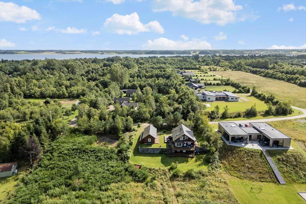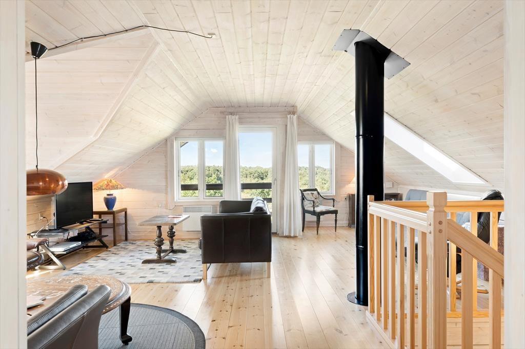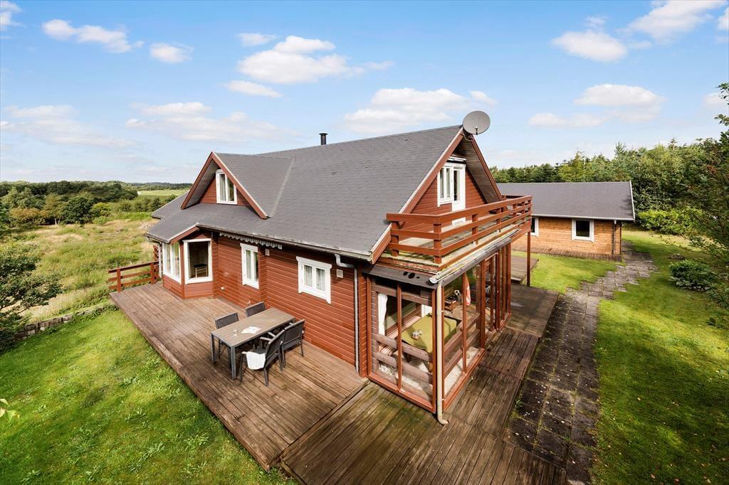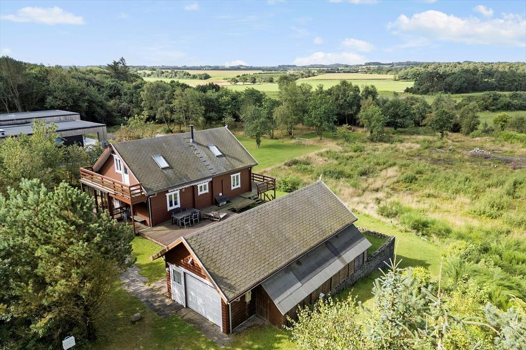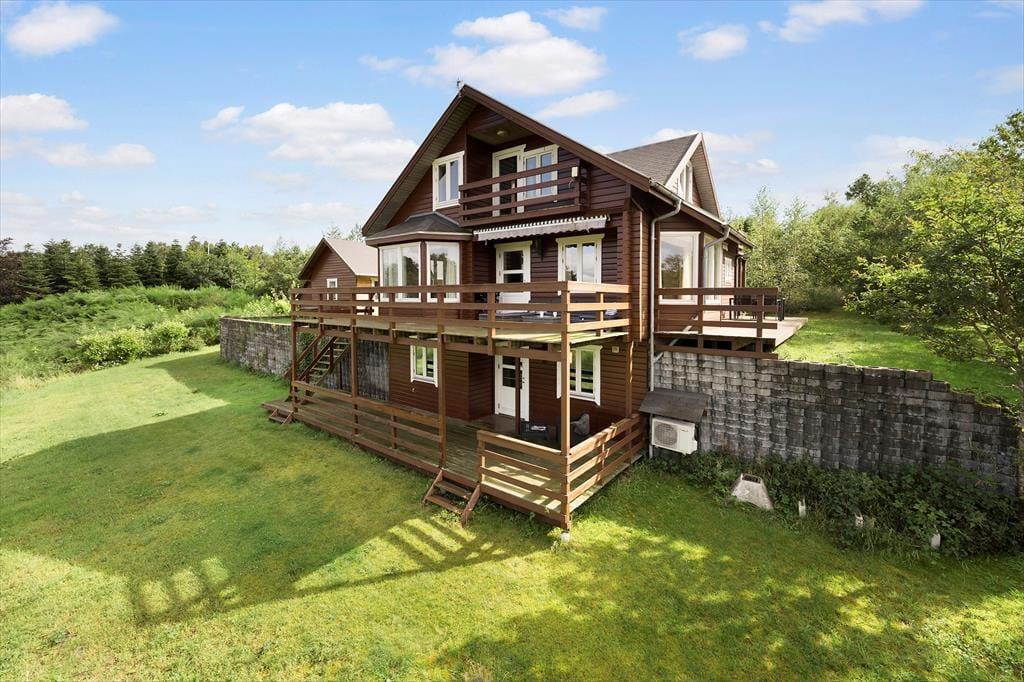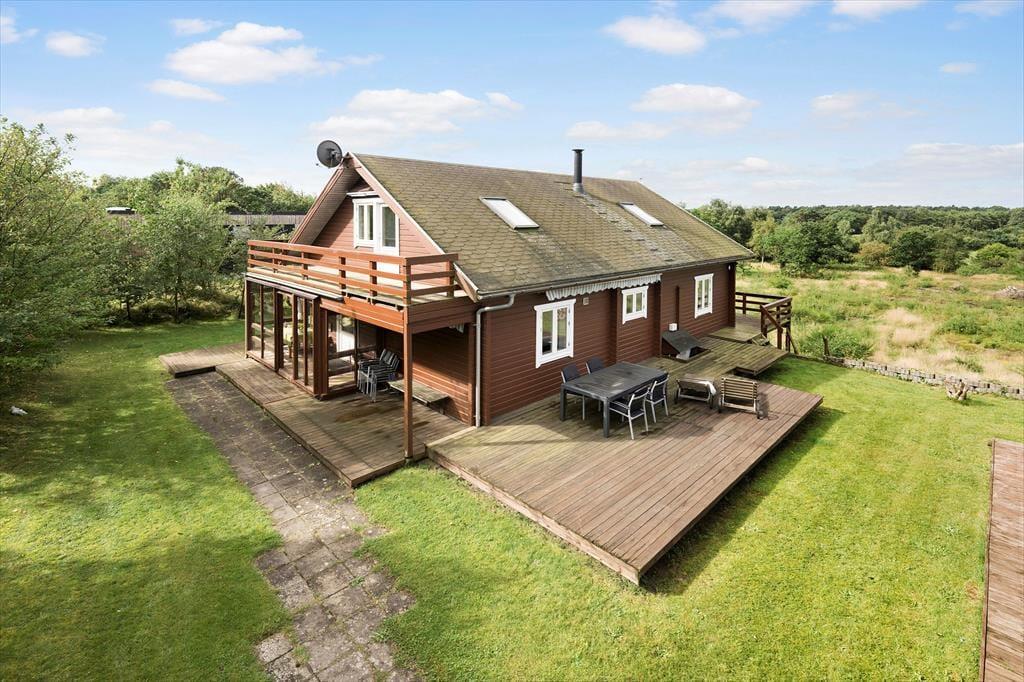 Fra alle etager har du direkte afgang til det fri, for førstesalen er udstyret med en overdækket terrasse, mens både stueplan og underetagen byder på et dejligt terrassedæk. Med andre ord er der masser af valgmuligheder, når du vil finde den helt perfekte opholdsplads i det fri – og der er endda rig chance for, at du kan sætte dig et sted, hvor du har flot udsigt til det grønne landskab, der breder sig vest for sommerhuset. Grunden er med sine 4503 m2 mere end stor, og der er gode græsarealer at boltre sig på i de rolige og naturskønne omgivelser.