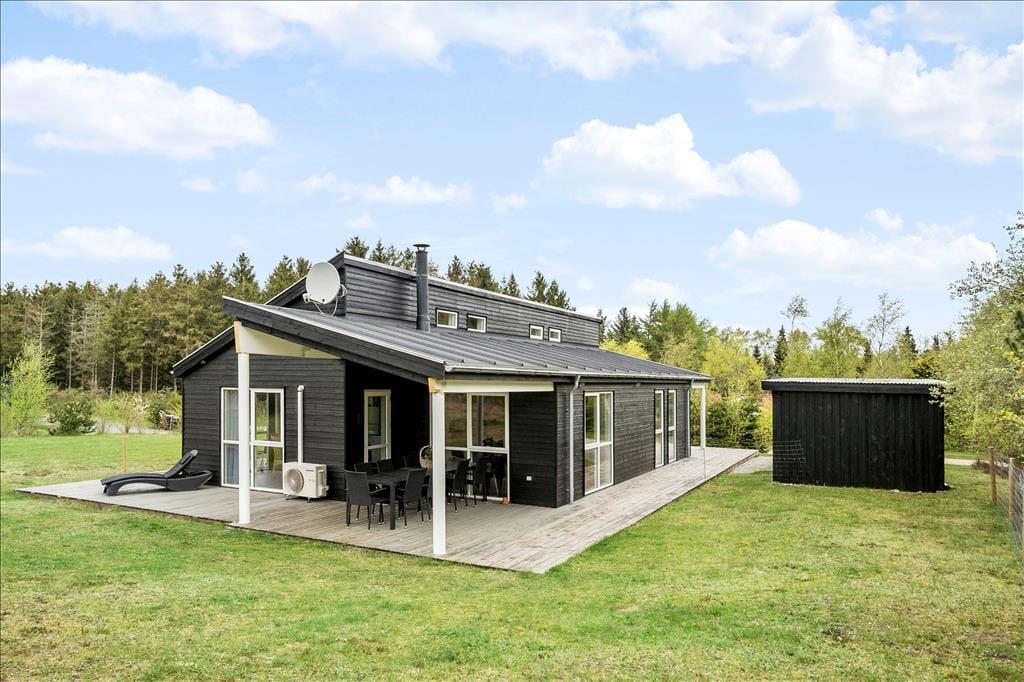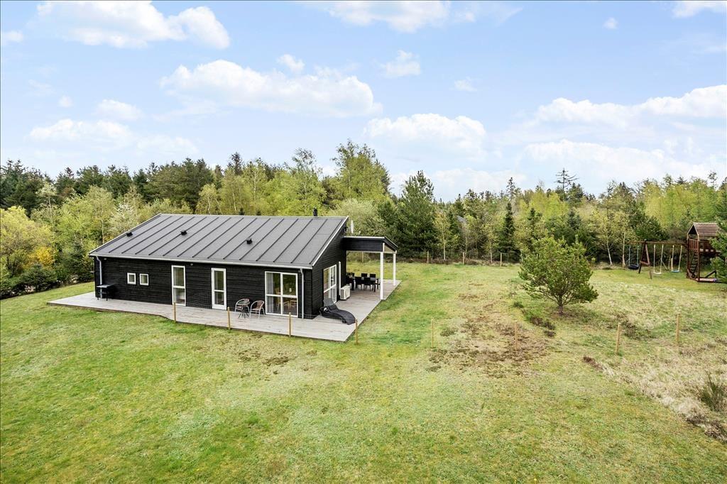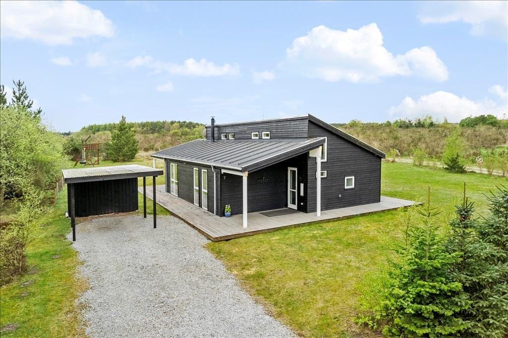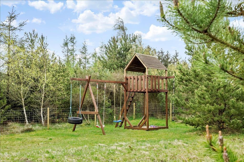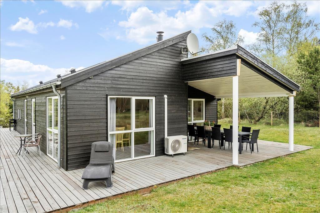 Den delvist overdækkede træterrasse, der breder sig rundt om sommerhuset, indbyder til solbadning, avislæsning, grill og andre skønne ferieaktiviteter af den tilbagelænede slags. Skal der være lidt mere gang i den, har I god plads til leg og boldspil på græsplænen på den 2599 m2 store naturgrund. En del af grunden er indhegnet, hvilket måske især er et plus for småbørnsfamilier og hundeejere, og de fredelige omgivelser på den lukkede vej Bronze højen vil alle feriegæster sikkert værdsætte. På grunden er der for øvrigt legetårn og sandkasse til de yngste og carport til bilen.