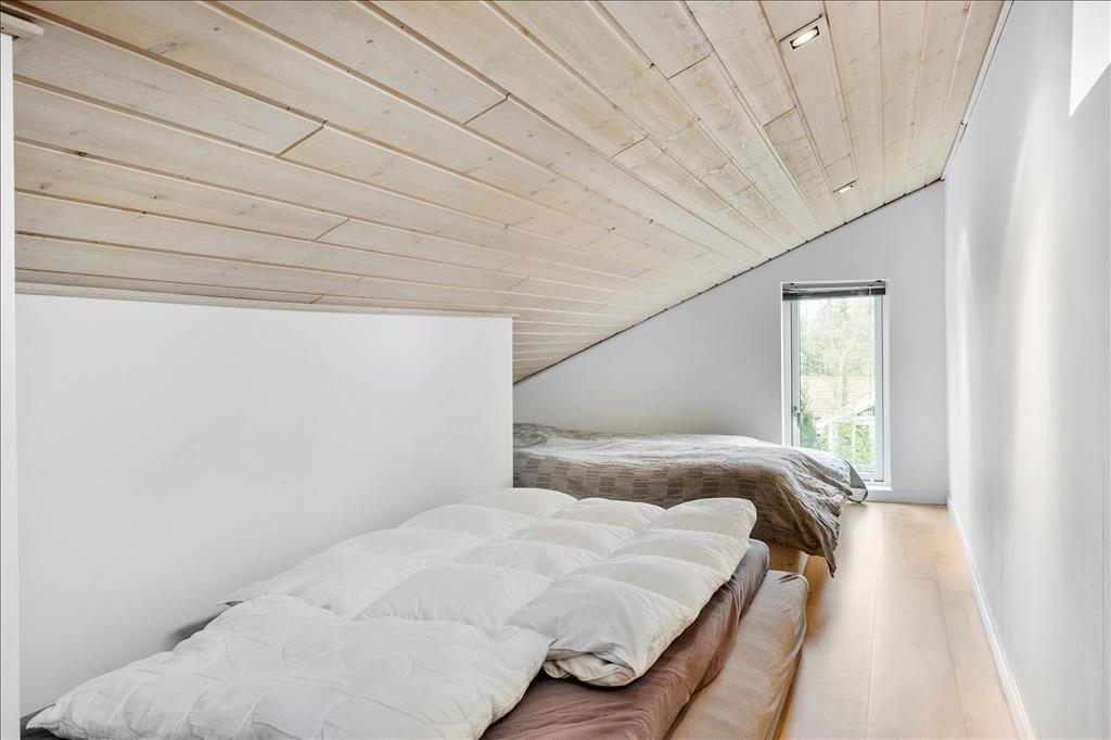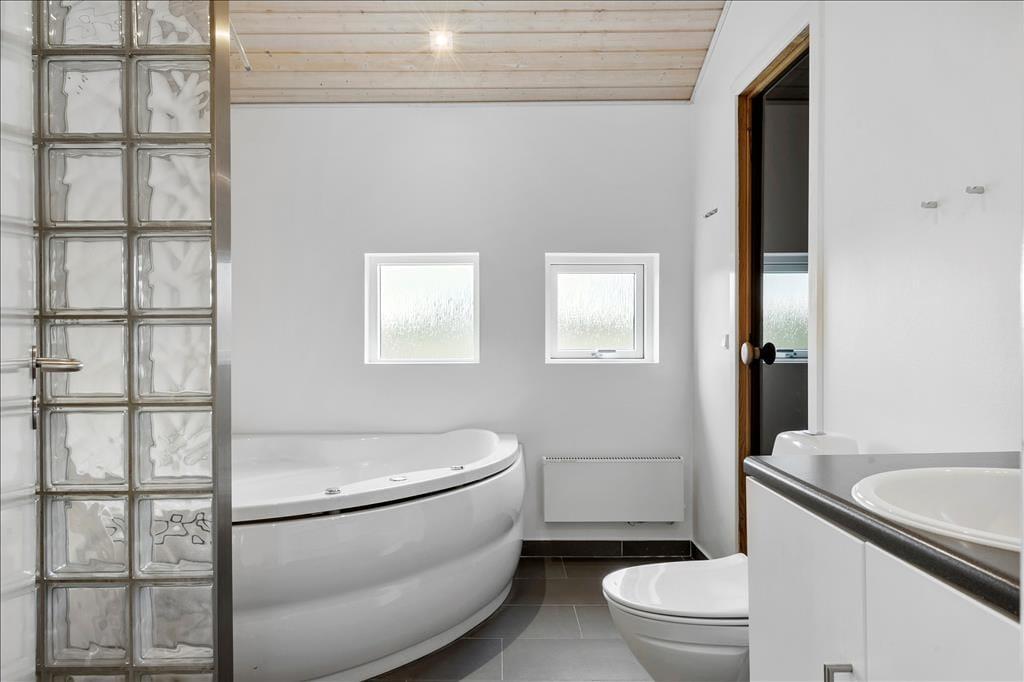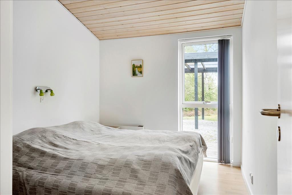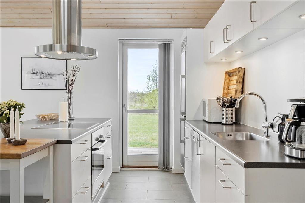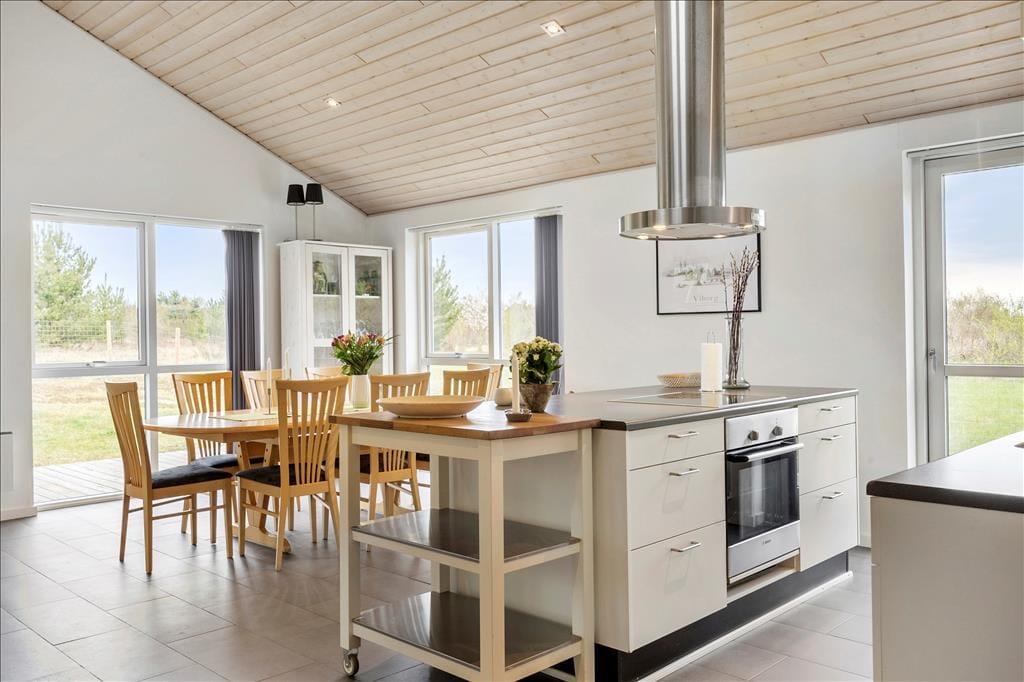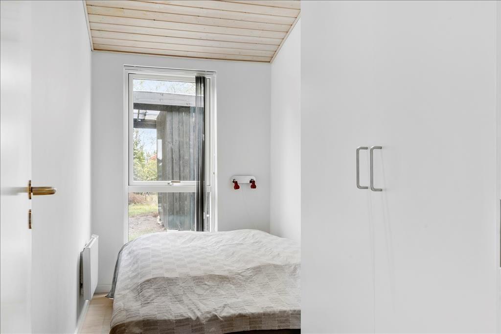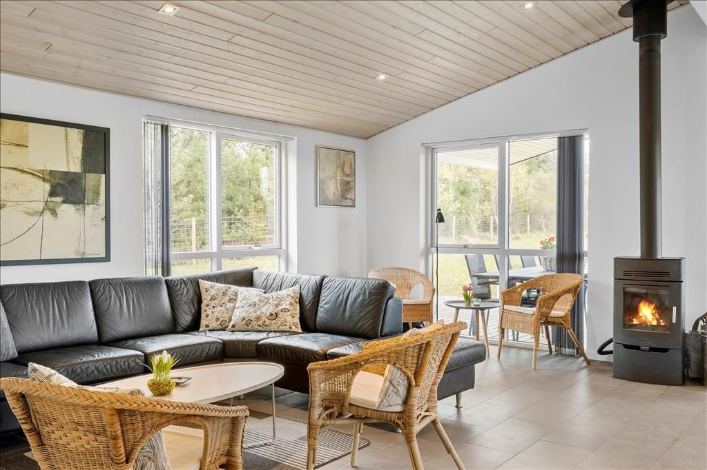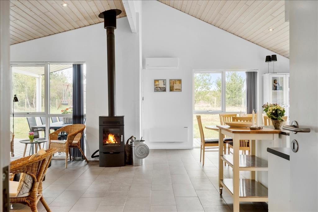 Sommerhuset er med sine 103 m2 dejligt rummeligt, og planløsningen gør det muligt at være op til ni personer inden døre. Der er nemlig tre soveværelser med dobbeltseng og ekstra sengepladser på den 12 m2 store hems, som I har adgang til fra et af værelserne. Et gæstetoilet med vaskemaskine ligger ved siden af et badeværelse, og sidstnævnte er ikke bare udstyret med bruseniche, men også et spabad og en sauna, så der er lagt op til wellness og afslapning i løbet af ferien. Stuen er også et skønt sted at koble af, for her kan I sætte jer godt til rette i sofaen nær brændeovnen eller samles til brætspil og lækre middage omkring spisebordet. Det åbne køkken er indrettet med køkken ø, frithængende emhætte og opvaskemaskine, og opholdsrummets to glasdøre gør det nemt at tage terrassemiljøet i brug på solrige dage.