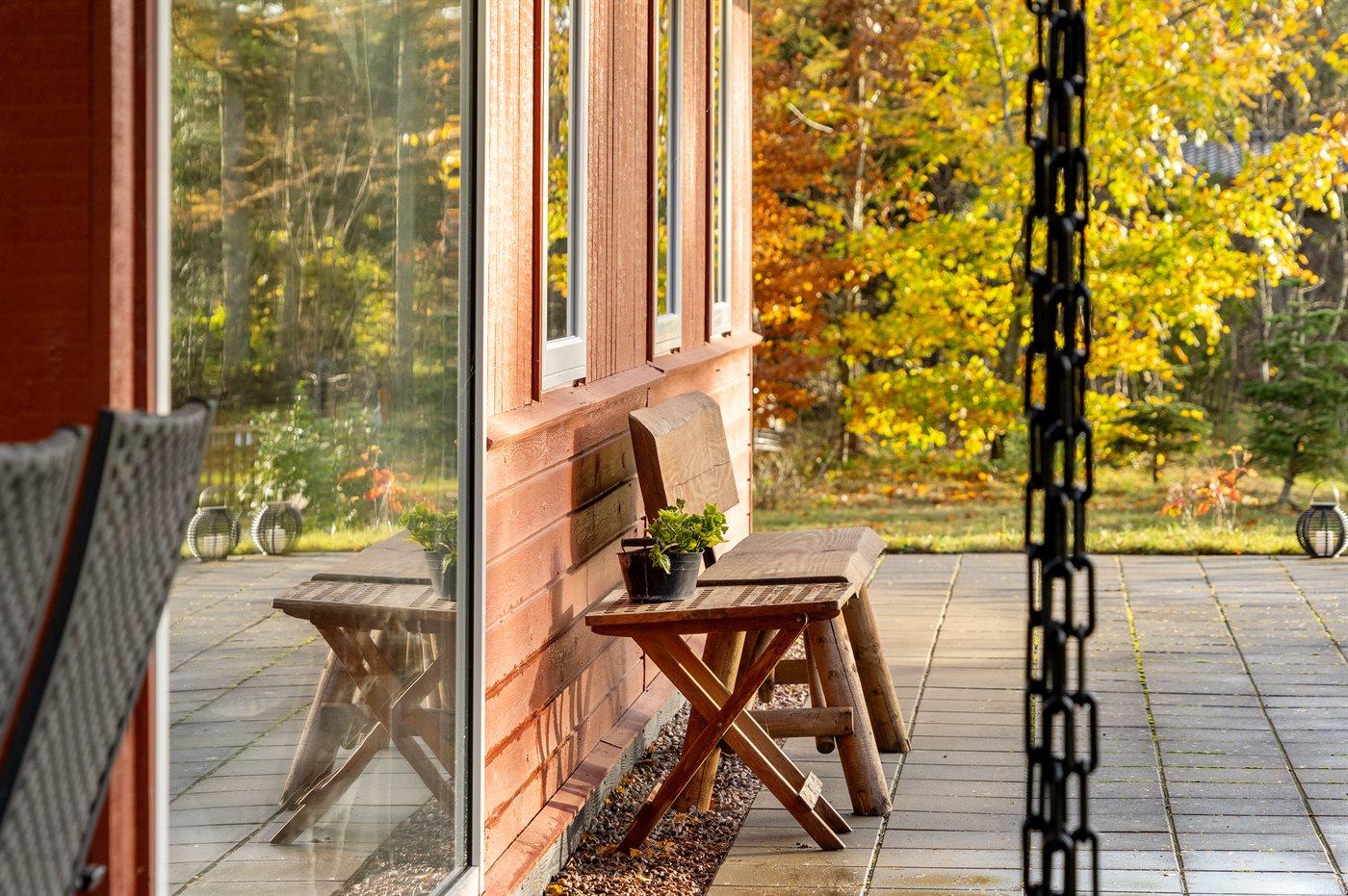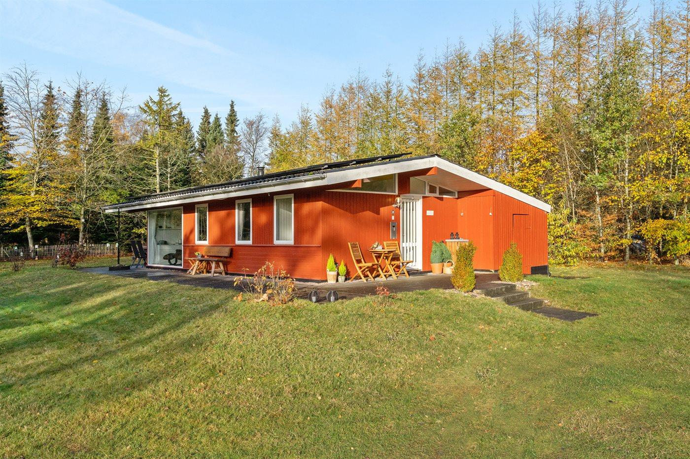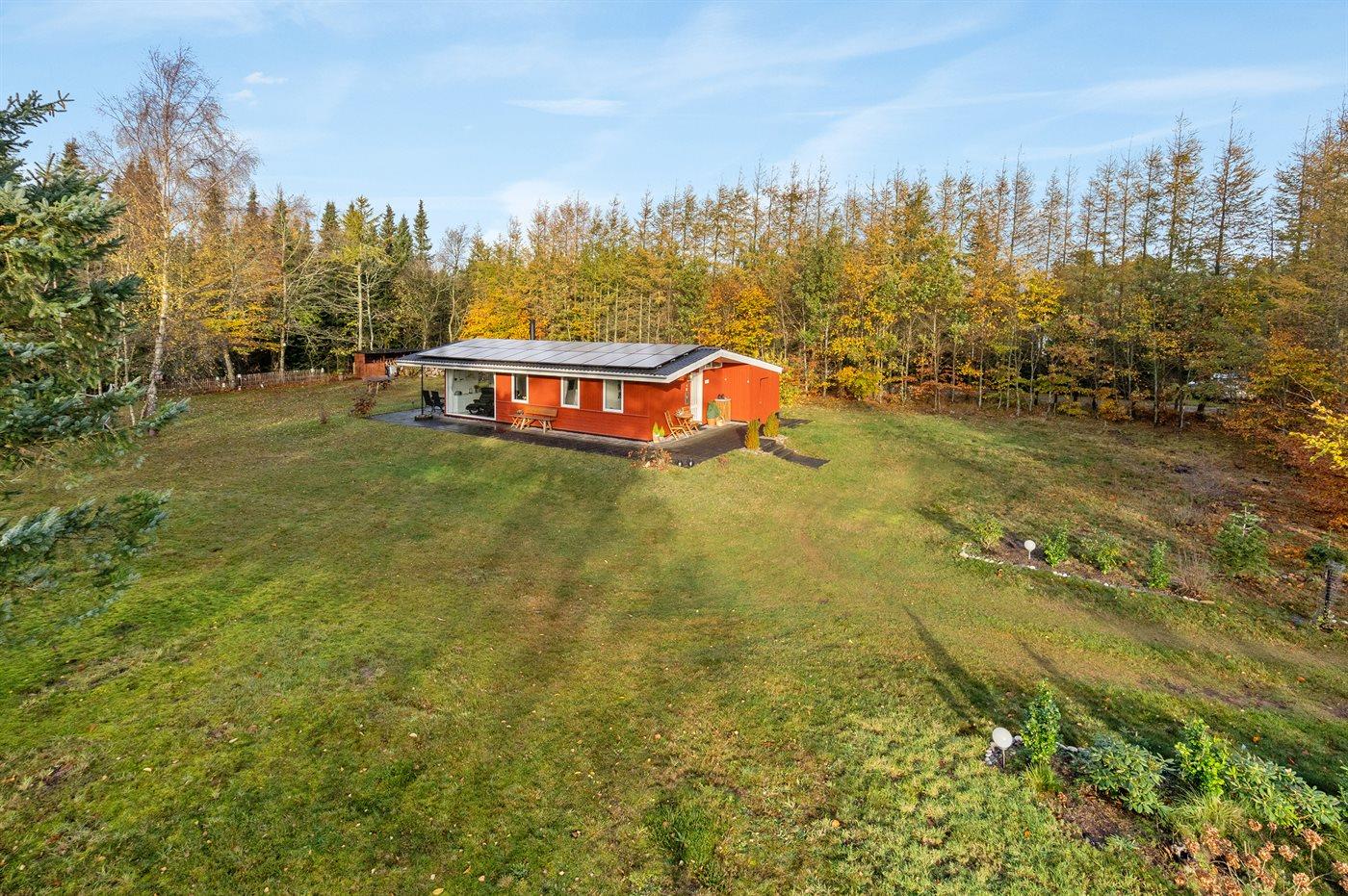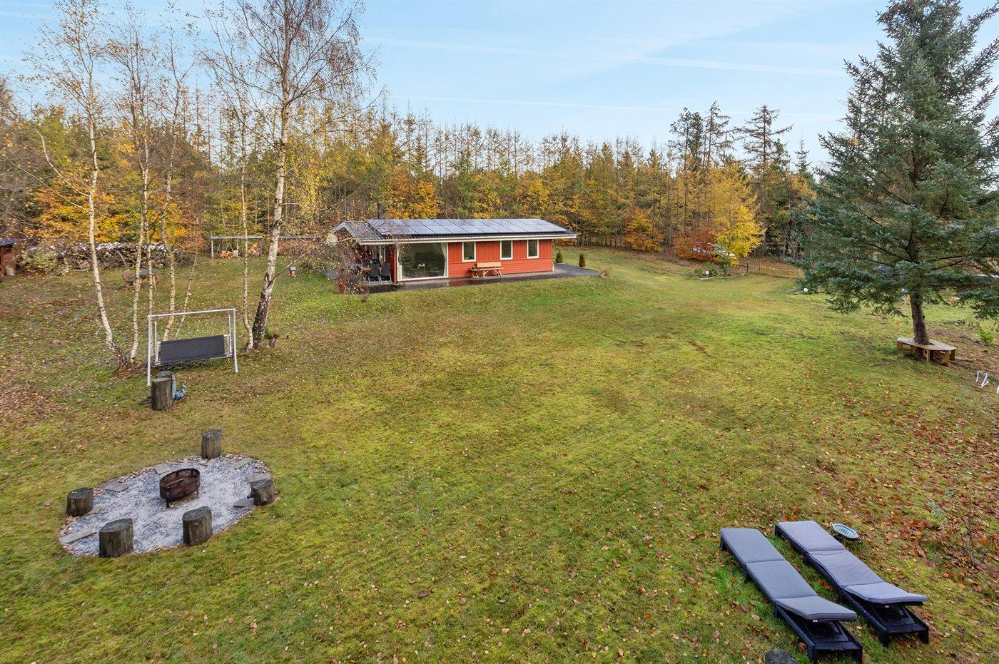 Ferieboligen er beliggende på en 2585 m² stor grund i skov/plantage. Grunden er indhegnet. Der er 400 m til fjorden. Nærmeste forretning er beliggende i en afstand af 4000 m. Til ferieboligen hører åbent terrasseareal. Desuden er der overdækket terrasse. Parkering ved ferieboligen.