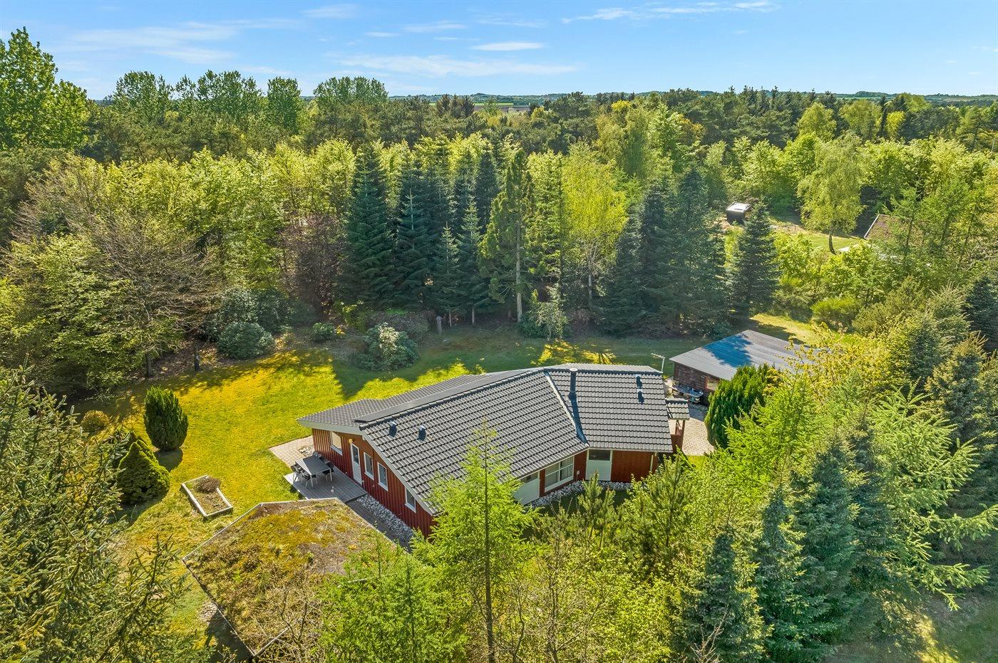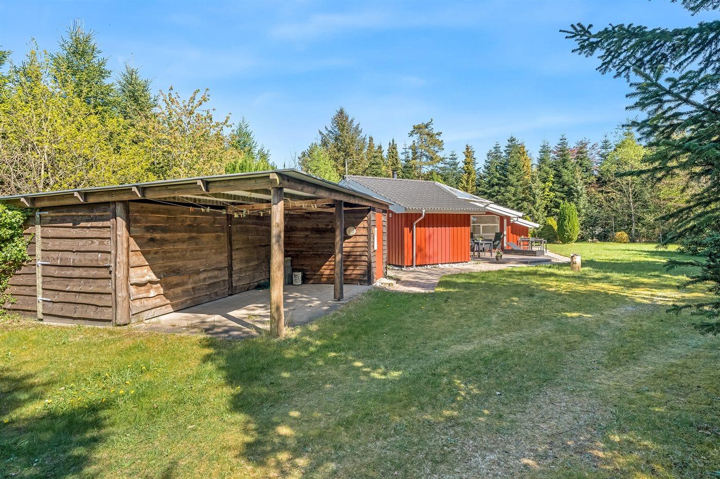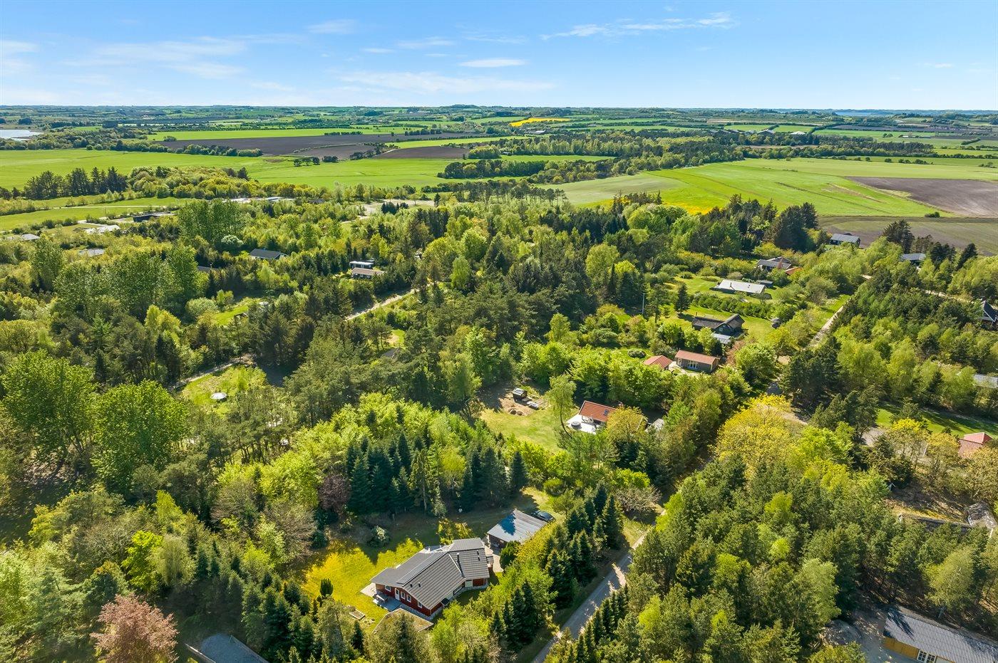 Ferieboligen er beliggende på en 3228 m² stor grund i skov/plantage. Der er 500 m til fjorden. Nærmeste forretning er beliggende i en afstand af 4000 m. Der er en golfbane i en afstand af 5000 m. Til ferieboligen hører åbent terrasseareal. Desuden er der overdækket terrasse. Der er redskabsrum. Parkering ved ferieboligen.