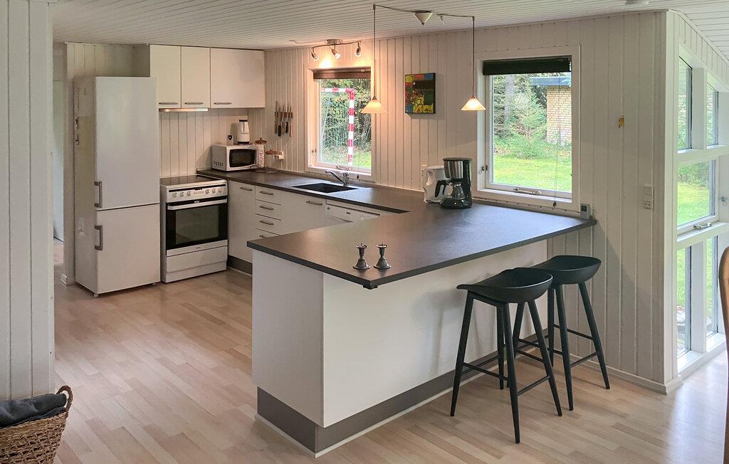 Tilbring en rolig ferie i dette lyse og velholdte feriehus, som ligger på en smukt bevokset naturgrund. Nyd den venlige atmosfære i den åbne opholdsstue med store vinduer, der lukker masser af lys ind. Spiseplads, køkken og stue hænger harmonisk sammen. Hyg jer i hjørnesofaen, læs en god bog, eller se fjernsyn sammen. I det moderne køkken med barstole finder I alt, hvad I har brug for til fælles madlavning. Spisepladsen med udsigt til det grønne indbyder til lange, hyggelige måltider.