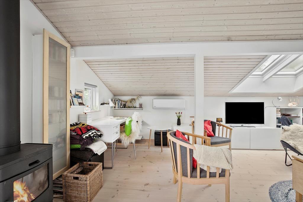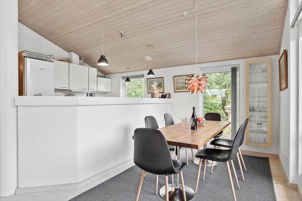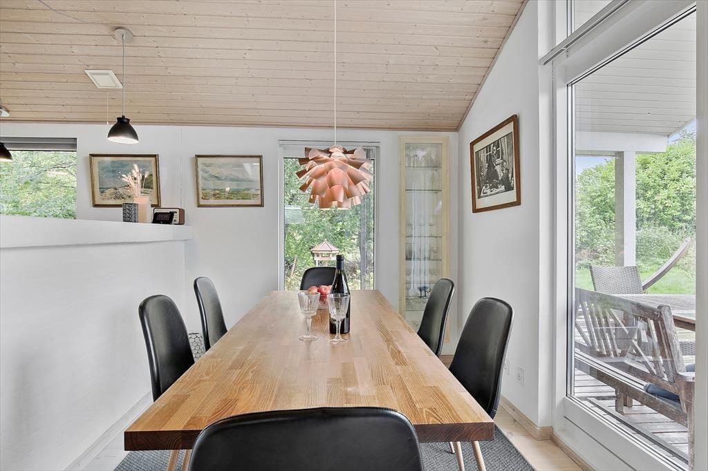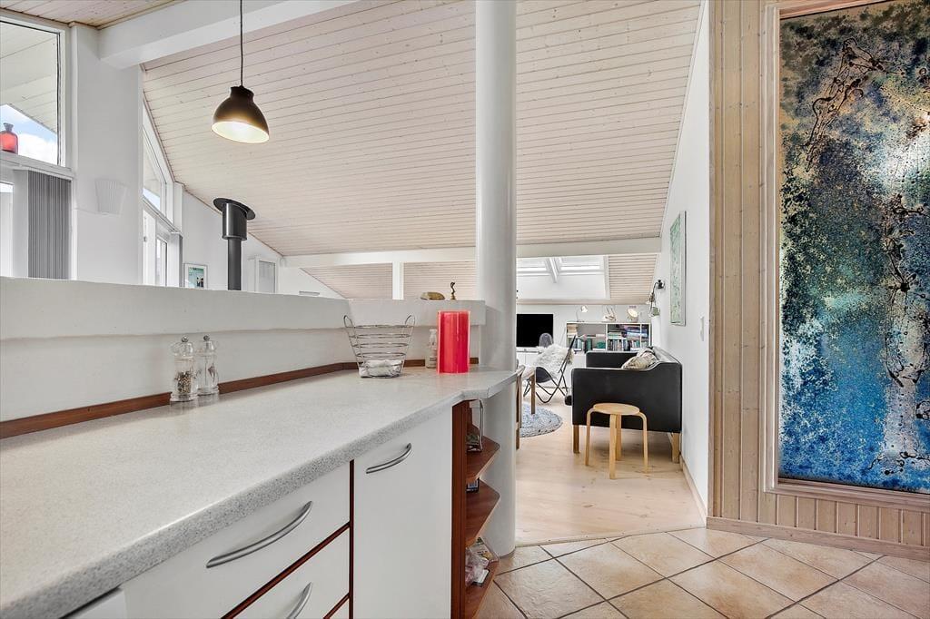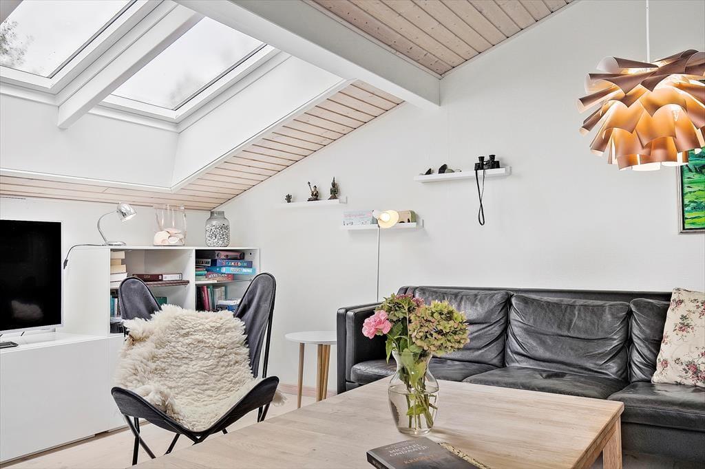 Feriehuset er indrettet med kombineret køkken og opholdsstue. Velindrettet og lyst køkken med keramisk komfur, mikroovn, opvaskemaskine og køleskab med fryser. Lys og moderne indrettet opholdsstue med loft til kip, store vinduespartier og ovenlysvinduer, og udgang til en delvis overdækket terrasse, hyggelig spisekrog, sofaer og lænestole, varmepumpe og brændeovn, Smart_TV hvor der er adgang til danske DR kanaler, og streamingtjenester (kræver eget abonnement) Badeværelse med klinkegulv, gulvvarme og bruseniche. Bryggers med vaskemaskine, tørretumbler og mikroovn. Tre soveværelser, et med dobbeltseng, og to med dobbelte sovesofaer. Opvarmning af huset foregår via varmepumpe, brændeovn og elvarme