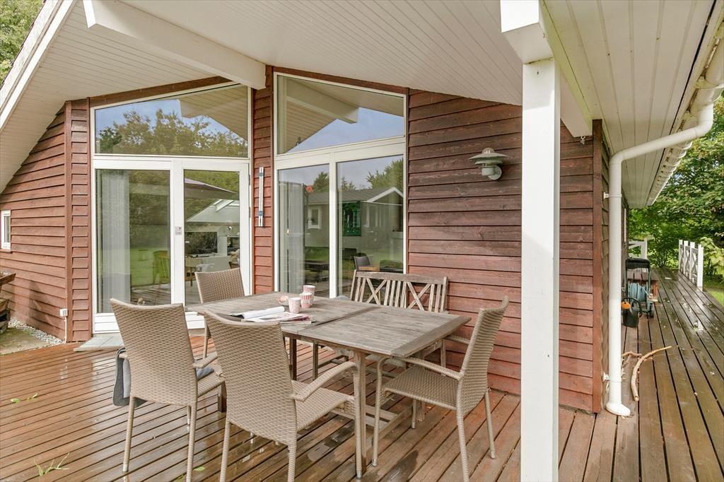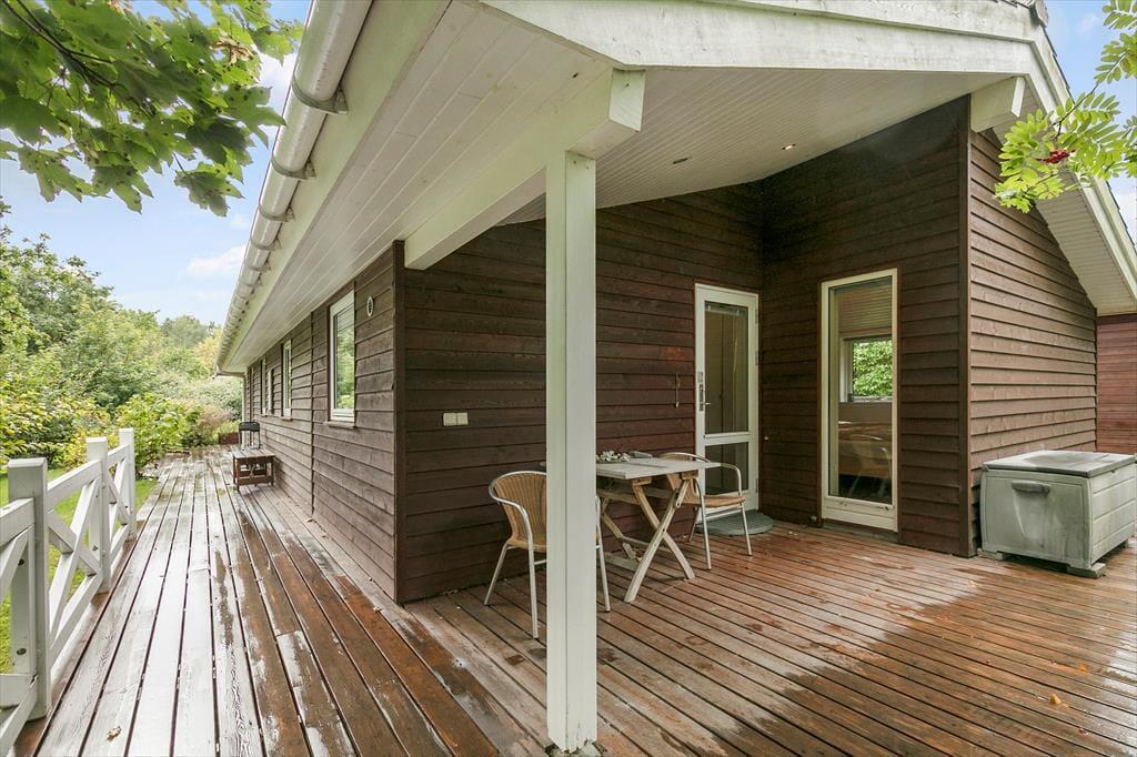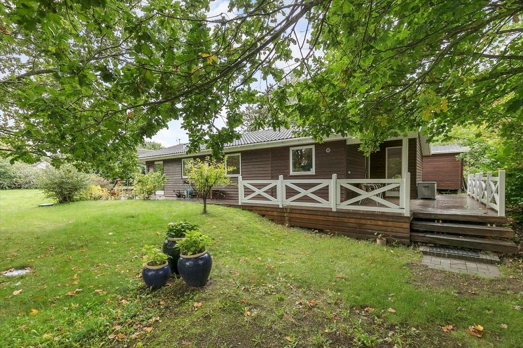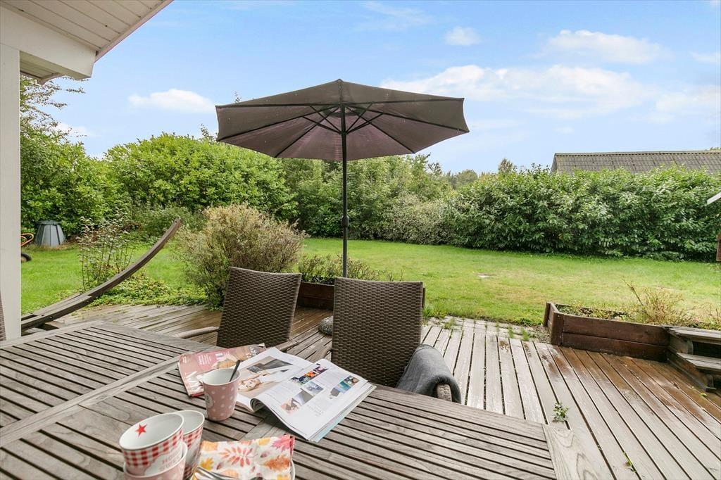 Huset har en 1262 m2 grund med en delvis overdækket terrasse. Ved feriehuset er der havemøbler, grill og trampolin