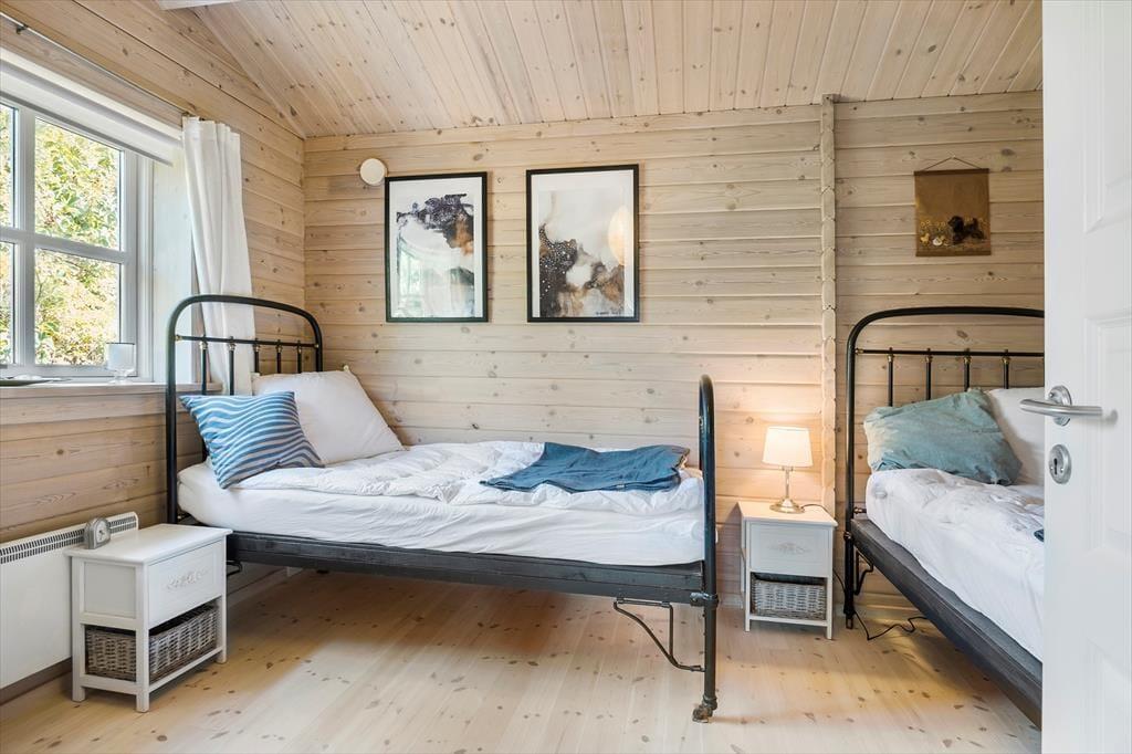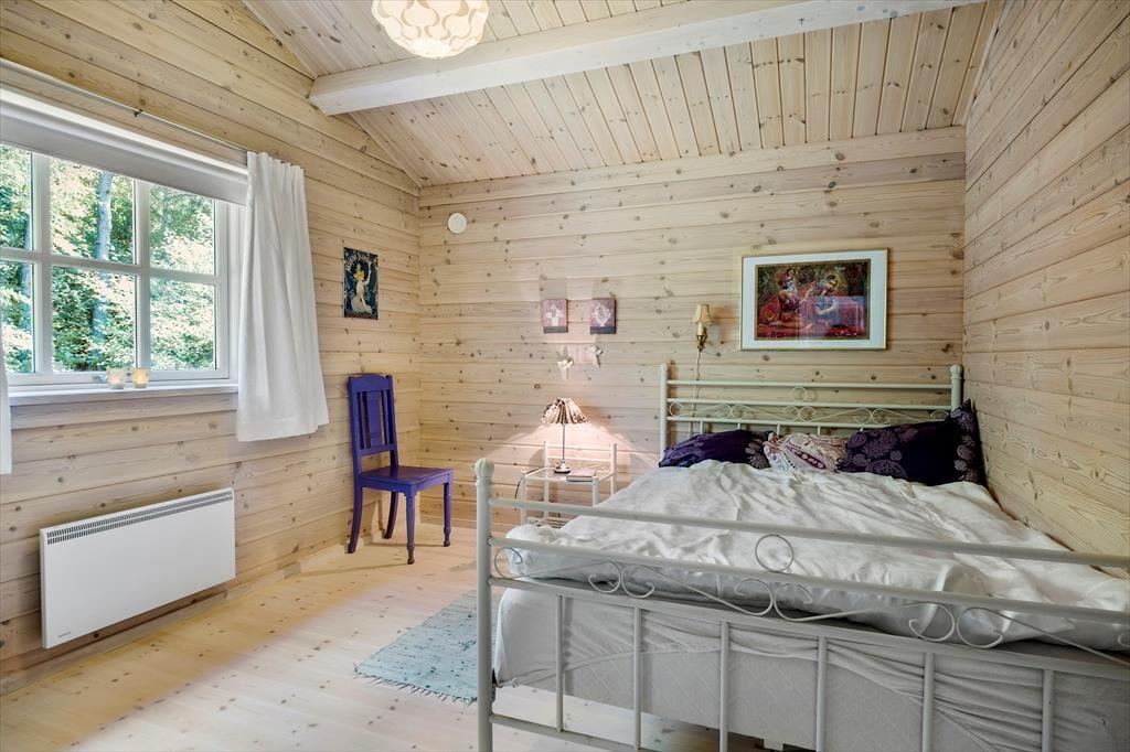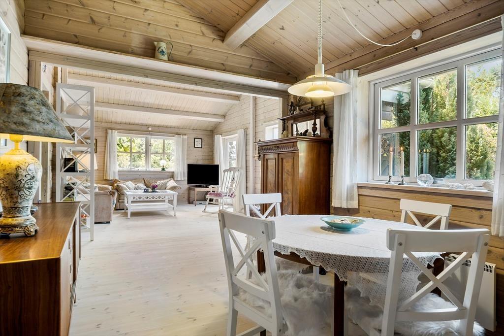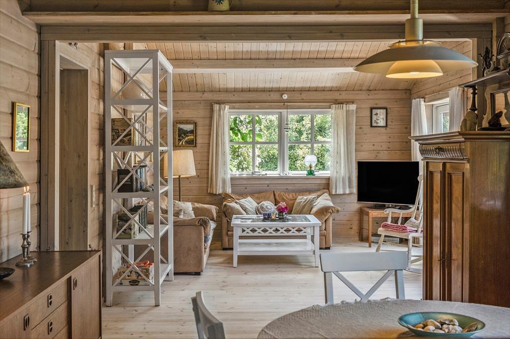 Velkommen indenfor: Indendørs finder du et lyst og åbent køkken, der i kombination med den rummelige spise- og opholdsstue er perfekt til fælles hygge. Huset rummer to komfortable soveværelser samt et dejligt badeværelse med brus og vaskemaskine. Sommerhusets indretning er meget indbydende med en hyggelig indretning, hvilket skaber en dejlig rolig og afslappende atmosfære. Tænd gerne op i brændeovnen på de køligere dage, og lad feriehyggen brede sig.