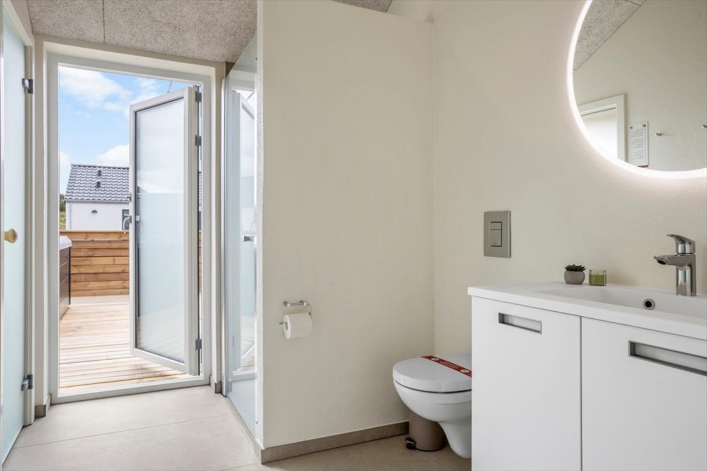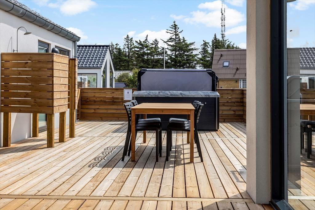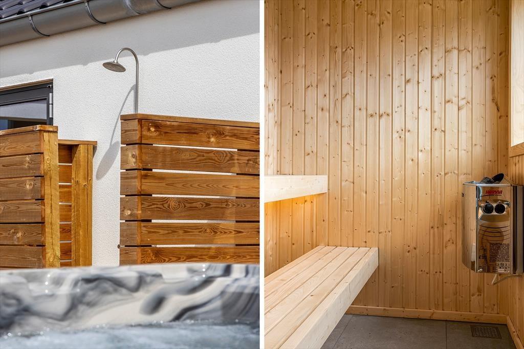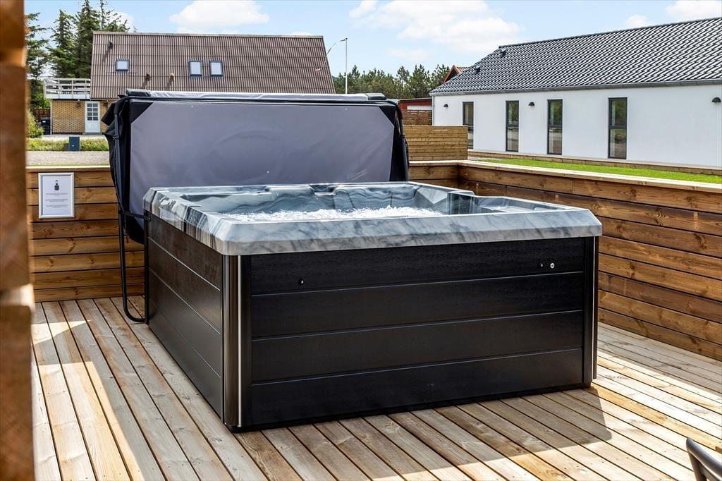 Udenfor venter et imponerende terrassemiljø med både overdækkede og åbne områder, hvor du kan nyde det fri uanset vejret. Start dagen med en forfriskende udebruser og afslut den med et afslappende bad i det udendørs spabad. Den rummelige grund er ideel til leg og aktiviteter, mens den overdækkede terrasse indbyder til hyggelige grillaftener eller en stille stund med en god bog. Her kan du nyde morgenkaffen i solopgangen eller afslutte dagen med et glas vin i solnedgangen.