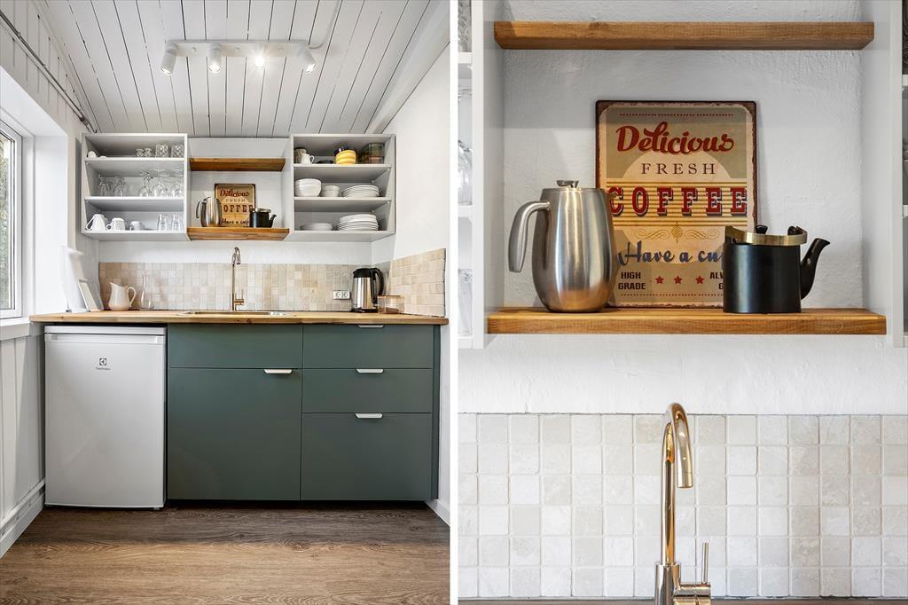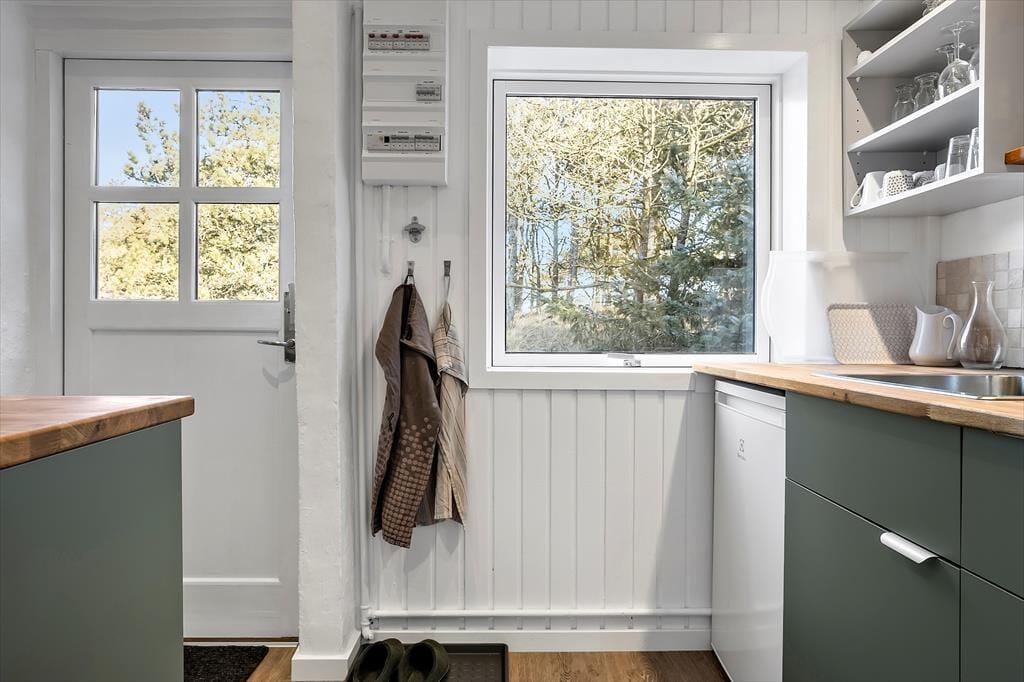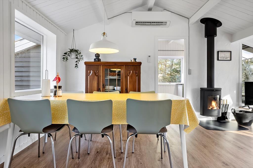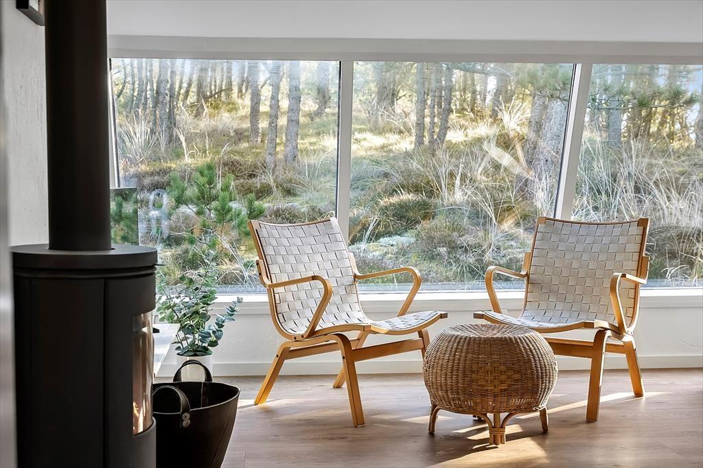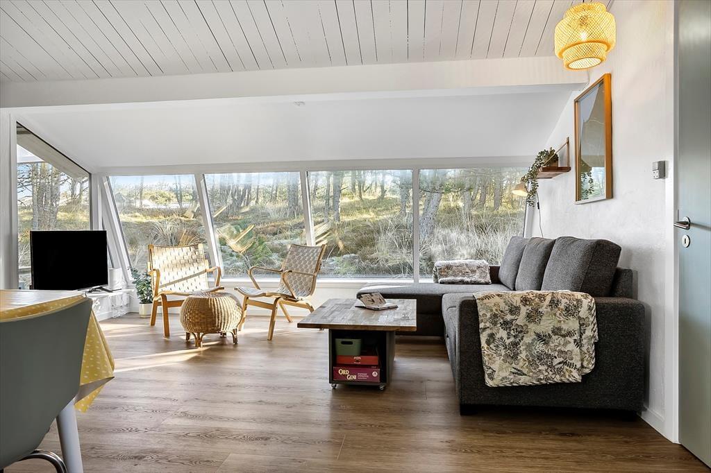 Når du træder ind i sommerhuset på Sandtornvej 15, mærker du med det samme, at her er kælet for detaljen. Renoveringen i 2025 har givet huset et friskt og moderne udtryk, uden at det har mistet sin oprindelige charme. Stuen er husets naturlige samlingspunkt – især med det store vinduesparti, der inviterer lyset indenfor og skaber en følelse af at være i ét med naturen. Her kan du læne dig tilbage i sofaen med en god bog, mens flammerne i brændeovnen knitrer og varmen breder sig stille og roligt i rummet. Køkken og opholdsrum hænger naturligt sammen og gør det nemt at være sammen – også mens der laves mad eller spilles spil. Atmosfæren er afslappet, hjemlig og perfekt til både korte getaways og længere ferier.