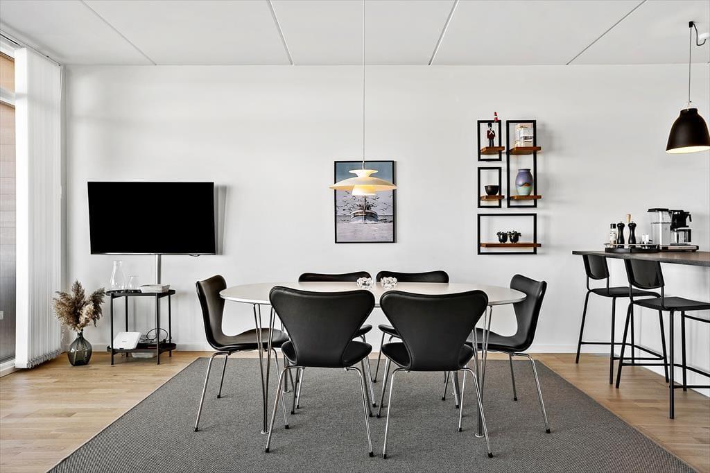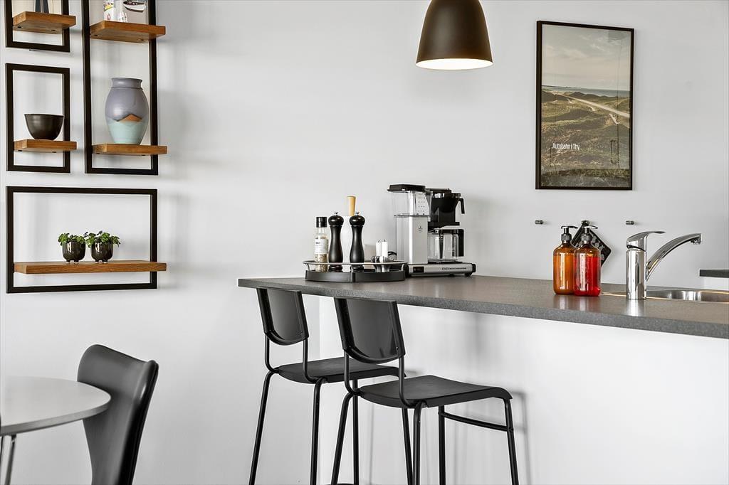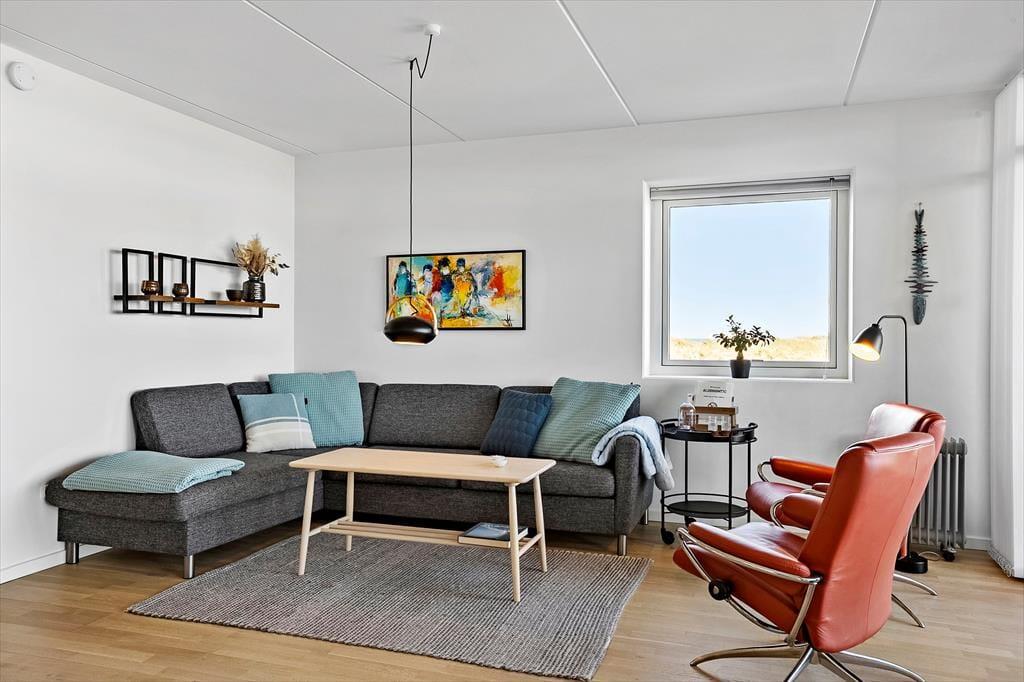 Når du træder ind i ferielejligheden på Havstokken 16 A, mødes du af en lys og indbydende atmosfære, hvor kvalitet og komfort går hånd i hånd. Den store opholdsstue, der er i åben forbindelse med køkken- og alrummet, giver masser af plads til både afslapning og samvær. Her kan du slappe af på den komfortable sofa og kigge ud over det imponerende hav, eller forberede lækre måltider i det veludstyrede køkken. Lejligheden er indrettet med fokus på detaljerne og tilbyder moderne bekvemmeligheder, som sikrer en bekvem og behagelig ferieoplevelse for den kræsne gæst. Den smagfulde indretning og de store vinduer, der giver lys og luft, bidrager til en følelse af luksus og ro.