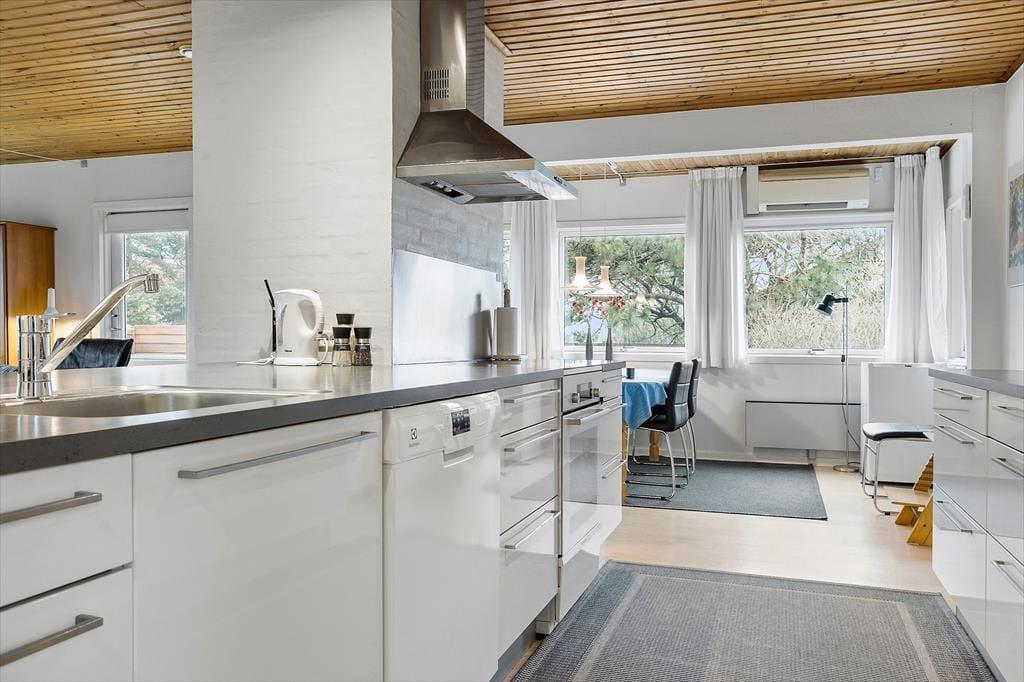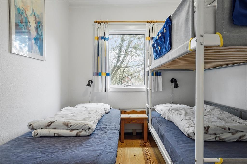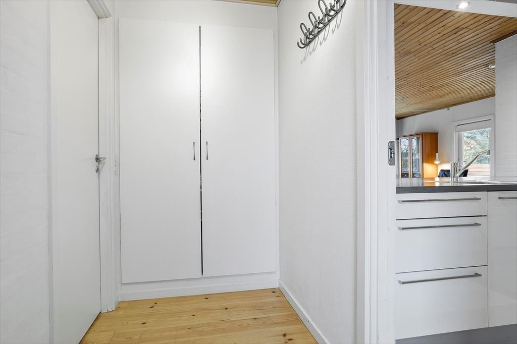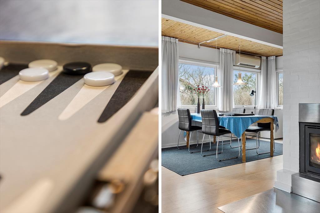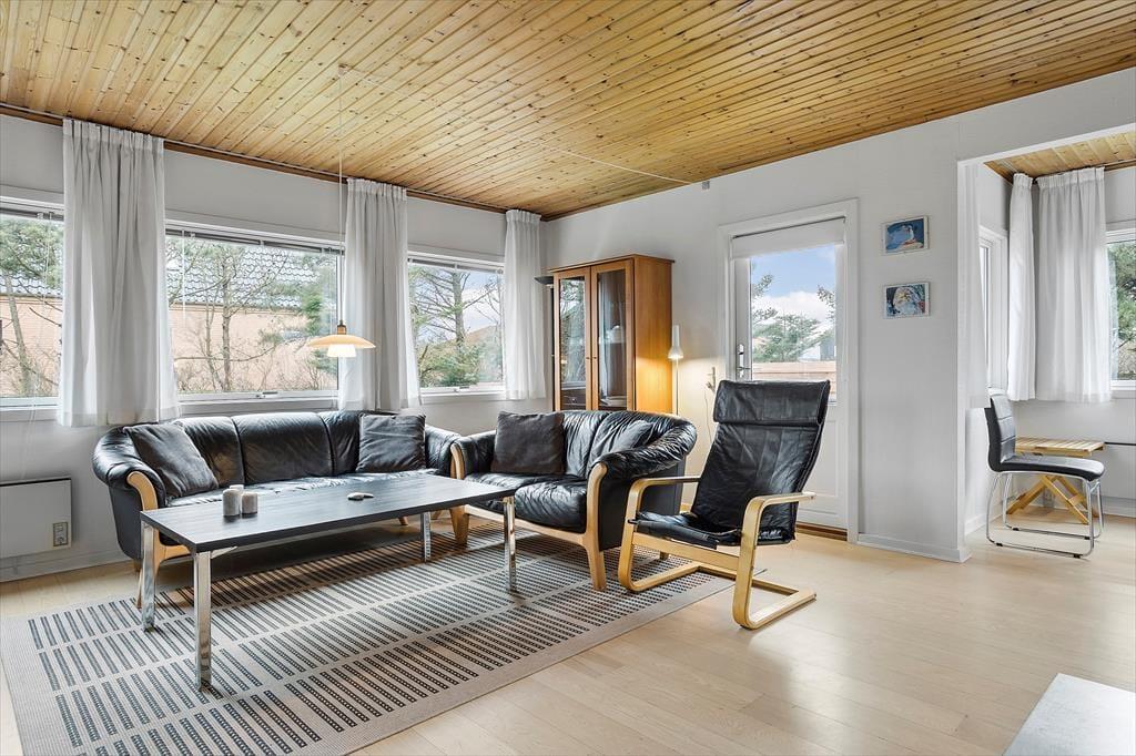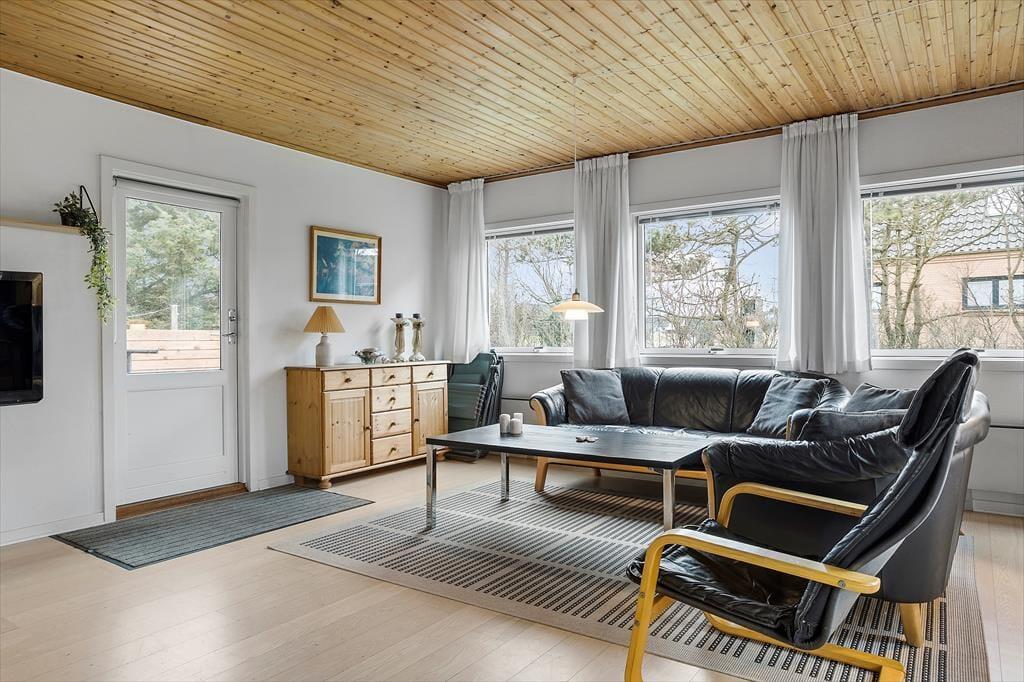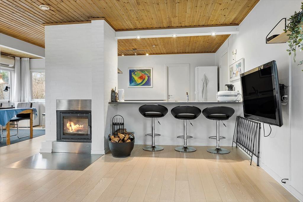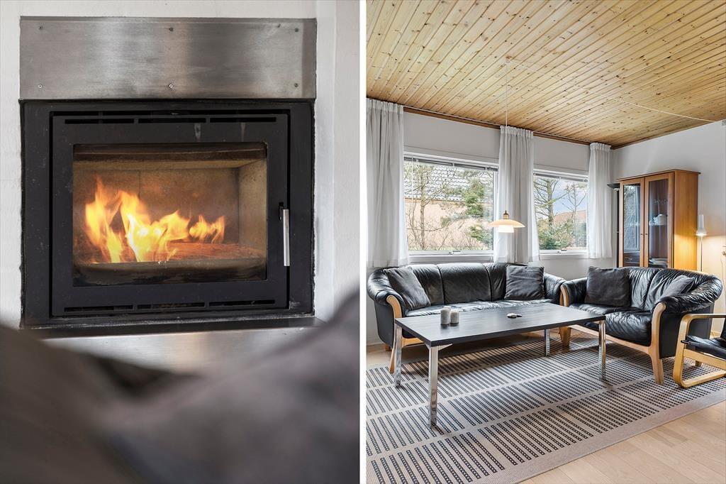 Træd ind i et lyst og indbydende opholdsrum, hvor den imponerende brændeovnsindsats skaber en hyggelig og varm atmosfære. Her er interiøret designet med fokus på komfort og funktionalitet, så du både kan nyde stille stunder med en god bog og samle alle til livlige familiemøder. Den moderne varmepumpe sikrer en behagelig temperatur hele året, hvilket gør rummet ideelt til både afslapning og sociale aktiviteter. De bløde farvetoner og omhyggeligt udvalgte detaljer skaber en følelse af hjemlig tryghed og ro. Kombinationen af moderne bekvemmeligheder med den ægte sommerhuscharme giver et unikt og indbydende miljø, hvor hver gæst straks føler sig hjemme og kan lade op til nye eventyr.