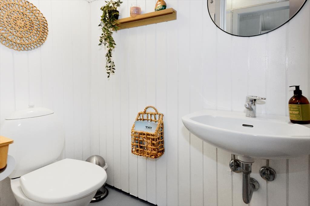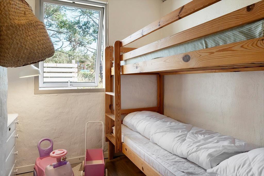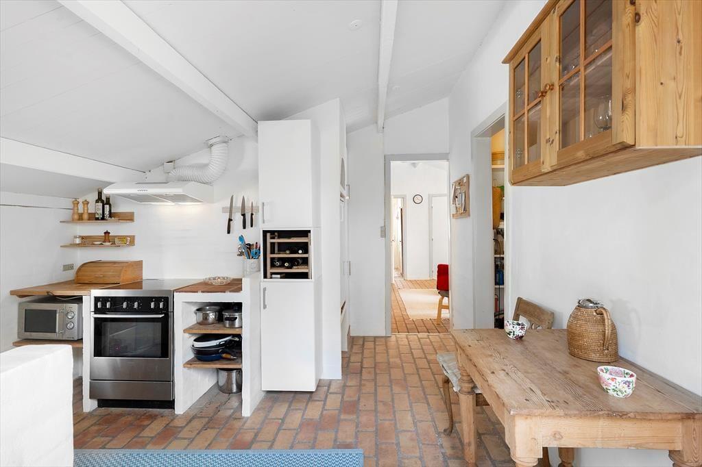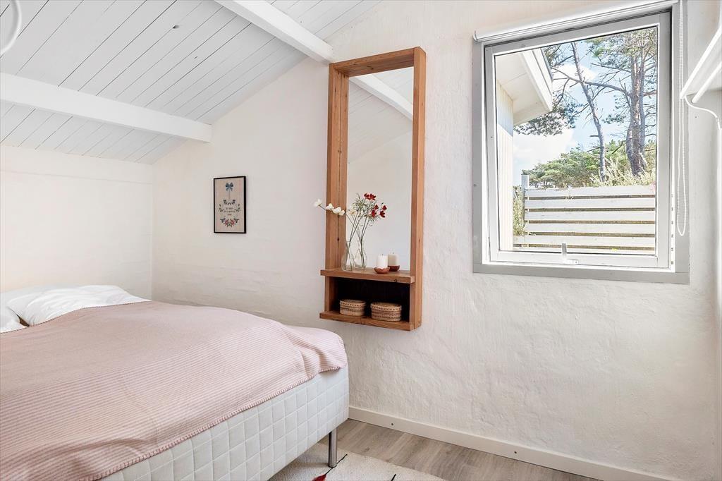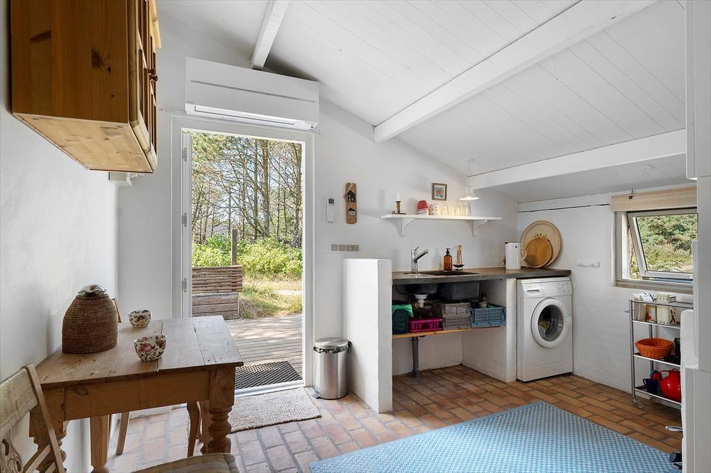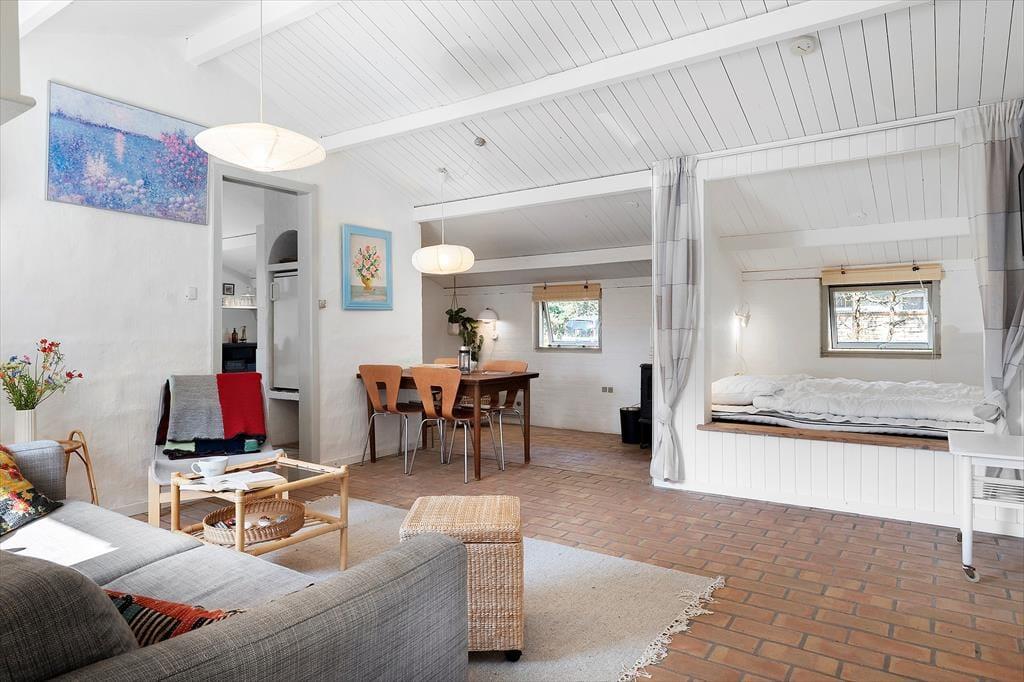 Når du træder ind ad døren, mærker du straks den hjemlige atmosfære, der kendetegner dette feriehus. Indretningen er enkel og indbydende, og i år 2025 er dele af huset blevet renoveret, så du får både moderne komfort og klassisk sommerhuscharme i ét. Det åbne køkkenalrum smelter sammen med opholdsstuen, hvor brændeovnen står klar til at sprede varme og hygge på kølige dage og aftener. Forestil dig at læne dig tilbage med en god bog, mens ilden knitrer, og du nyder duften af nybrygget kaffe – alt imens lyset strømmer ind fra vinduerne og giver dig følelsen af at være helt tæt på naturen, selv indendørs. Her er plads til både afslapning og fælles madlavning i uformelle rammer.
