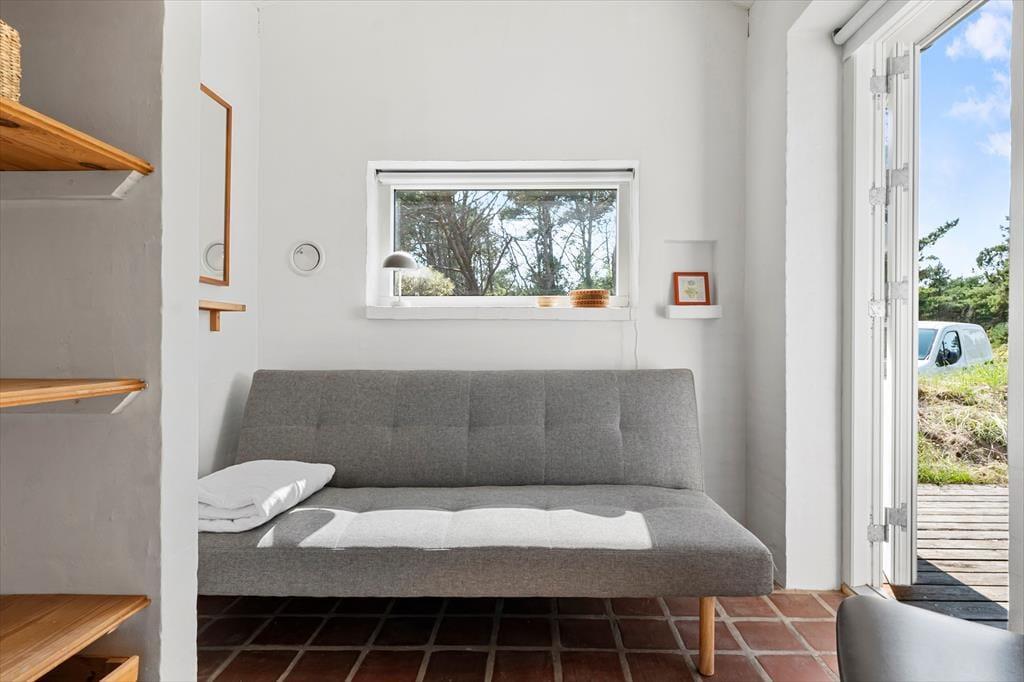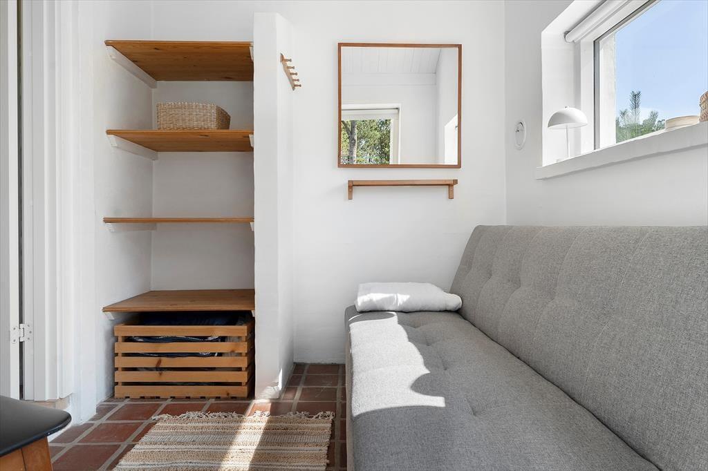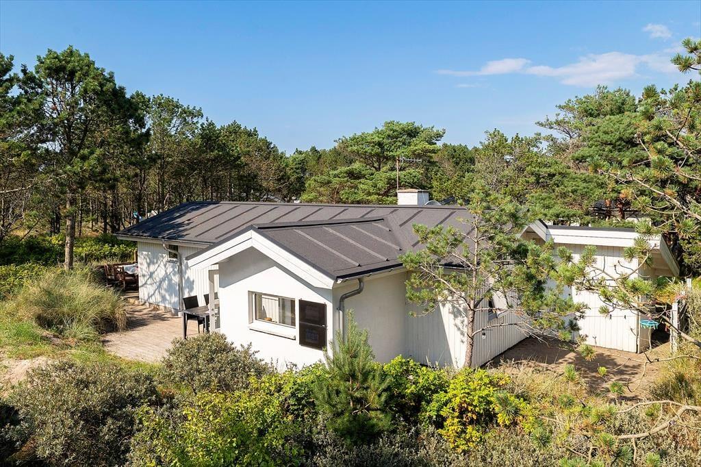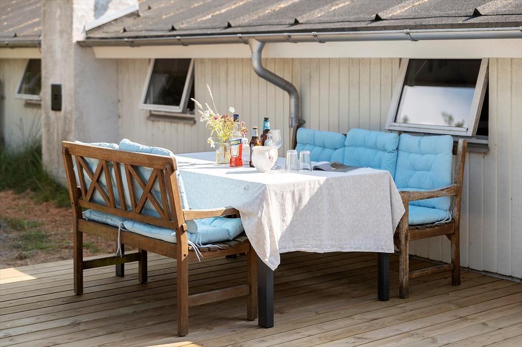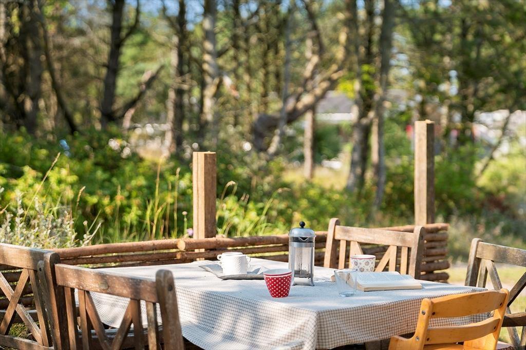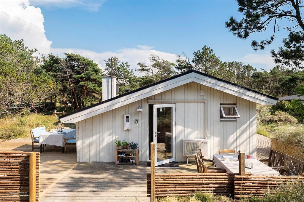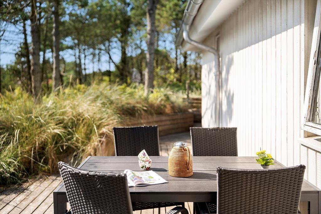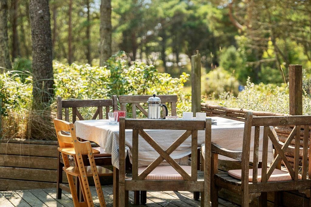 Udelivet er i centrum på Sandtornvej 43 – og det mærkes især på terrasserne, der er nyopførte og gennemtænkt placeret, så du altid kan finde en god plads i solen eller i læ for vinden. Her kan du starte dagen med morgenmad under åben himmel og slutte den af med grillmad og aftenhygge, mens solen går ned bag klitterne. Grunden er omgivet af lyng og lave træer, som skaber en rolig og ugeneret stemning, hvor du kan høre vinden suse og mærke stilheden helt ind i sjælen. Det er et oplagt sted at lade tankerne flyve, lægge hverdagen bag dig og bare være til stede – måske med en kop te og et tæppe over skuldrene på kølige sommeraftener.