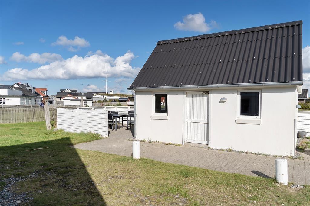 Sommerhusets udendørsareal indbyder til både leg og afslapning. Her er der god plads til, at børn og hunde kan løbe rundt og lege, mens de voksne nyder en kop kaffe på terrassen. Når vejret viser sig fra sin bedste side, er terrassen det oplagte sted til hyggelige grillaftener, hvor dagens oplevelser kan deles i afslappede omgivelser. Huset ligger fredeligt, så du kan nyde feriestemningen i fulde drag, mens lyden af fuglesang og vinden fra havet skaber en helt særlig ro. Fra sommeren 2025 etableres der en balkon fra den nye første sal hvorfra man så ville kunne nyde udsigten.