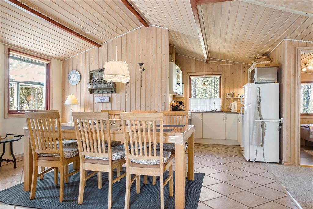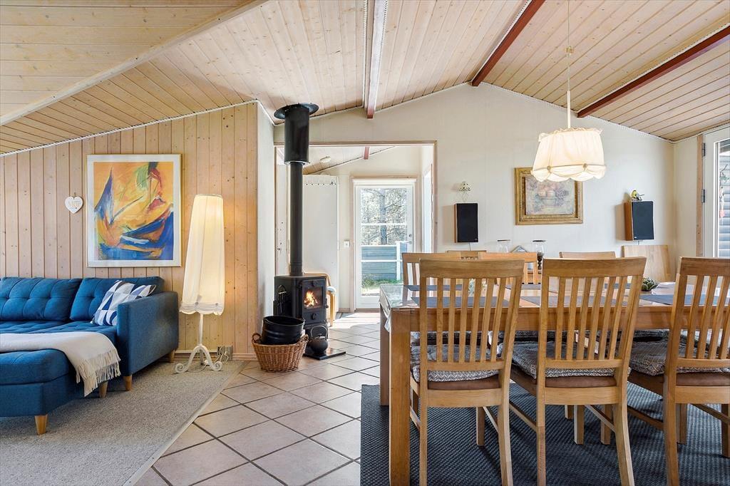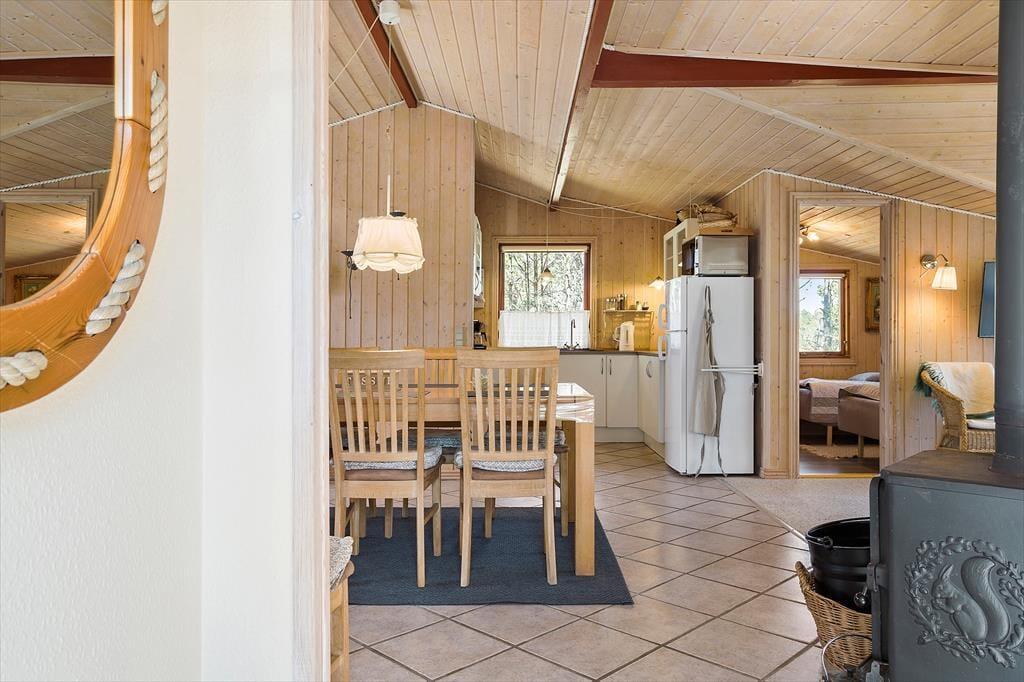 Træd ind i dette hyggelige sommerhus, hvor en varm og indbydende atmosfære straks møder dig. Sommerhuset er indrettet med omtanke og har alt, hvad du behøver for at kunne slappe helt af. Stuen er husets hjerte, hvor den knitrende brændeovn skaber rammerne for hyggelige aftener med kortspil, film eller en god bog. De bløde møbler og den charmerende indretning indbyder til afslapning, mens den åbne forbindelse til køkkenet sikrer, at samtalerne kan fortsætte, uanset om du er i gang med madlavningen eller nyder en kop kaffe ved spisebordet.