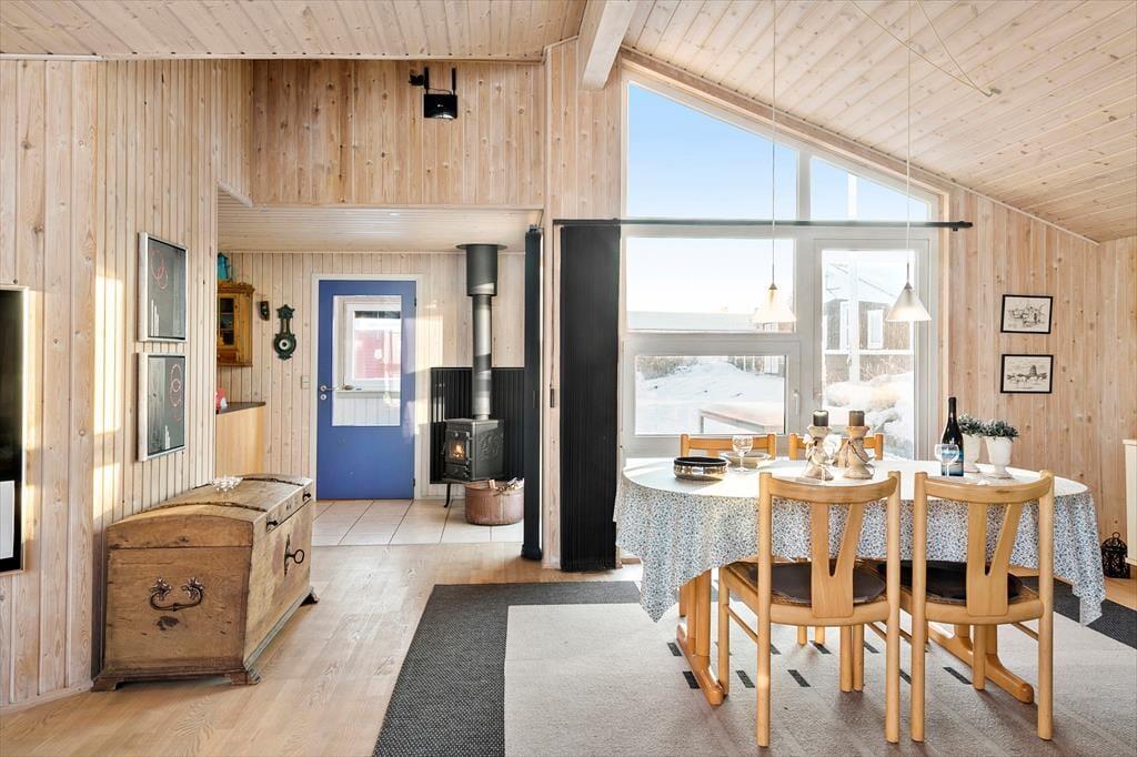 Når du træder ind i sommerhuset på Fiskervej 43, møder du en varm og indbydende atmosfære. Brændeovnens knitrende ild skaber en hyggelig stemning, perfekt til kølige aftener med familie eller venner. Huset er velindrettet og byder på plads til op til fem personer, hvilket gør det ideelt for en mindre familie eller en vennegruppe. De lyse trævægge og -lofter tilfører rummene en skøn, naturlig charme, der understøtter følelsen af ro og afslapning. Med både moderne faciliteter og klassisk sommerhusstemning er dette hjem det perfekte tilflugtssted året rundt.