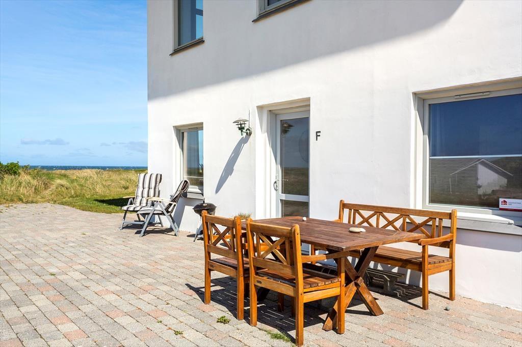 Ejendommens udearealer er fælles for alle beboere i ejendommen. Som lejer kan man forvente at have adgang til terrassen udenfor lejlighed 5F. Man kan samtidig opleve, at andre beboere forbigående færdes på terrassen. Fx når de går til og fra deres terrasse på vestsiden af ejendommen, bruger stien fra terrassen ud i klitterne, og når de foretager vedligeholdelse og vask af vinduer.