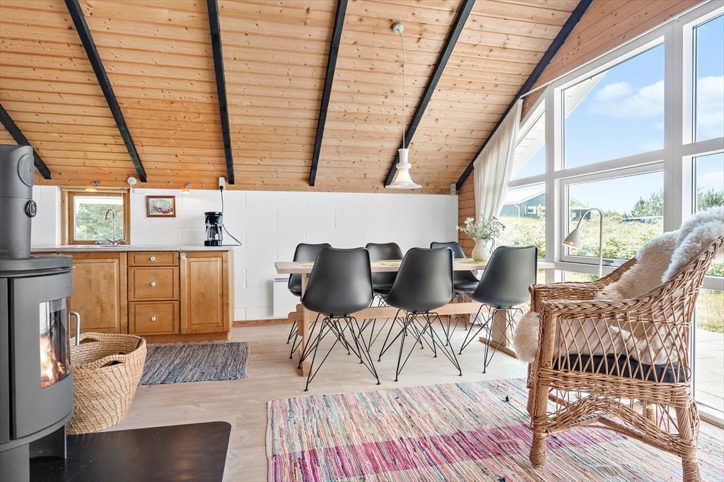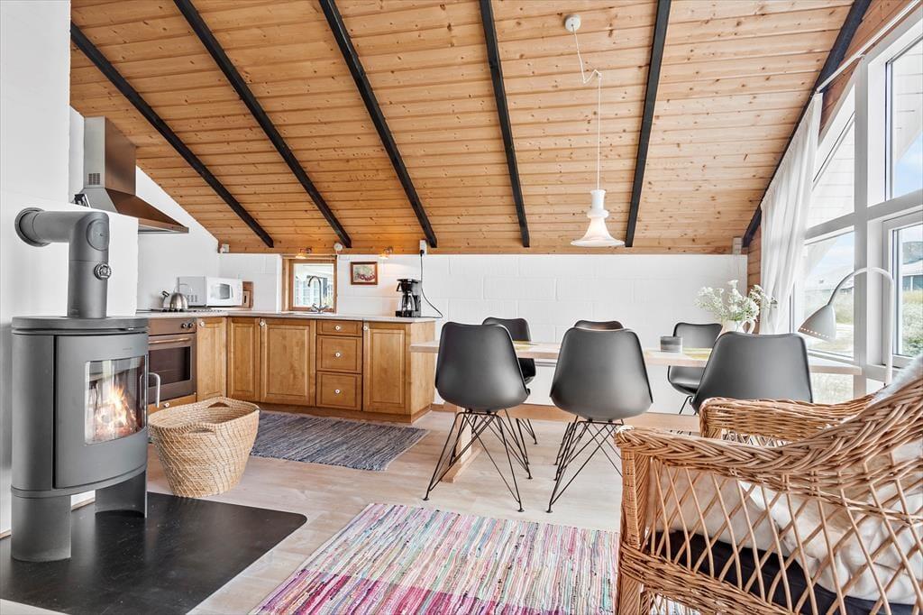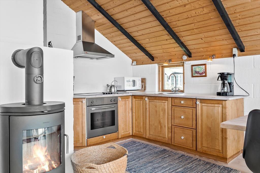 Når du træder ind i sommerhuset på Mose-Bøllevej 14, bliver du mødt af en varm og indbydende atmosfære. Den hyggelige stue med brændeovn er perfekt til afslappende aftener, hvor flammerne knitrer, og varmen spreder sig i rummet. Den moderne varmepumpe sikrer, at huset altid har en behagelig temperatur, uanset årstiden. Køkkenet ligger i åben forbindelse med stuen og gør det nemt at samles om madlavning og fælles måltider. Sommerhuset er indrettet med sans for detaljerne og giver dig følelsen af at være hjemme – men med et strejf af ferieluksus.