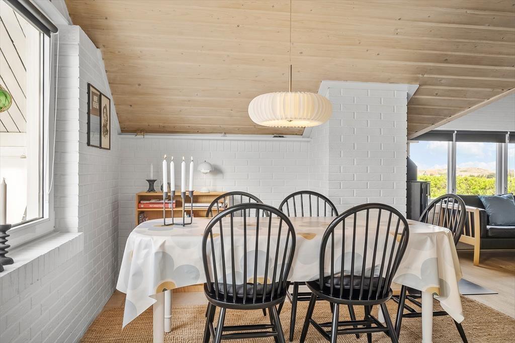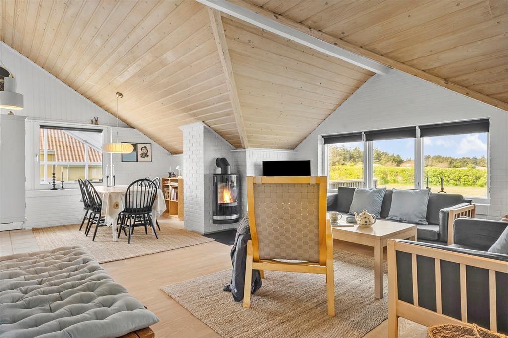 Træd indenfor i dette velholdte feriehus, hvor du mødes af et åbent og lyst køkken-alrum og stueområde, hvor loftet til kip giver en følelse af rummelighed og høj komfort. Huset er perfekt til både afslapning og samvær. Det er energivenligt og udstyret med både brændeovn og varmepumpe, så du kan nyde hyggelige stunder foran flammerne på en kold aften, eller lade dig opvarme af den behagelige varme hele året rundt. De store vinduer giver et fantastisk lysindfald og sørger samtidig for, at du kan nyde den smukke udsigt over klitterne.