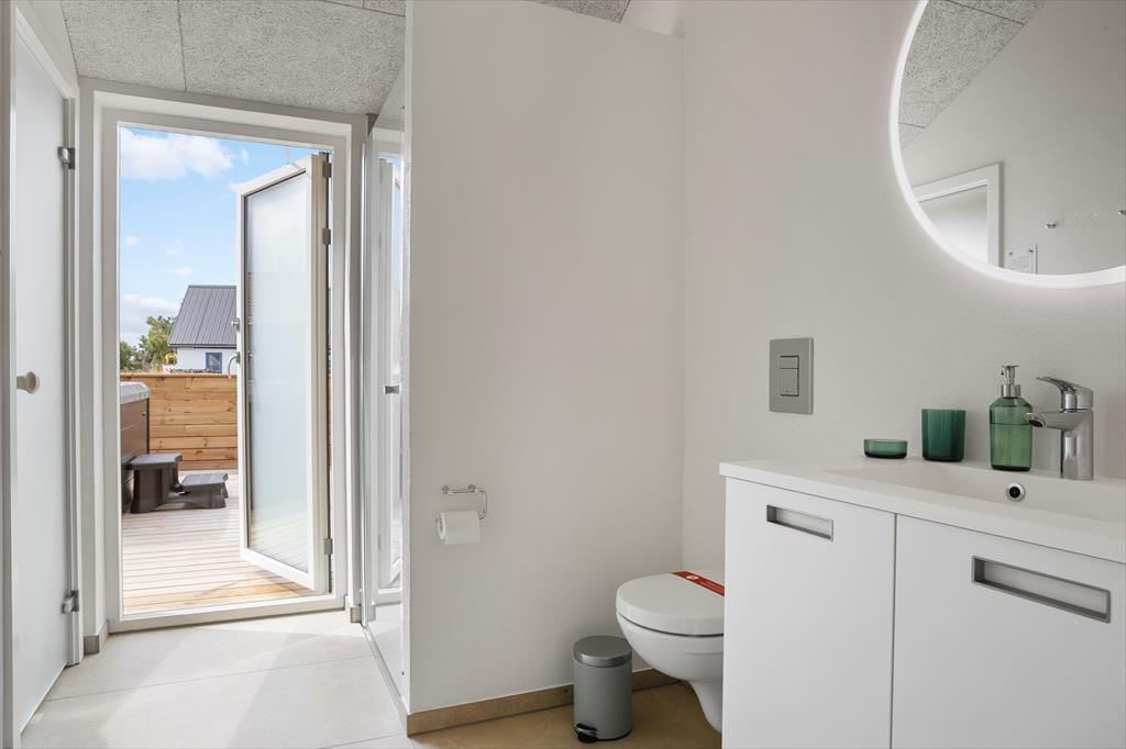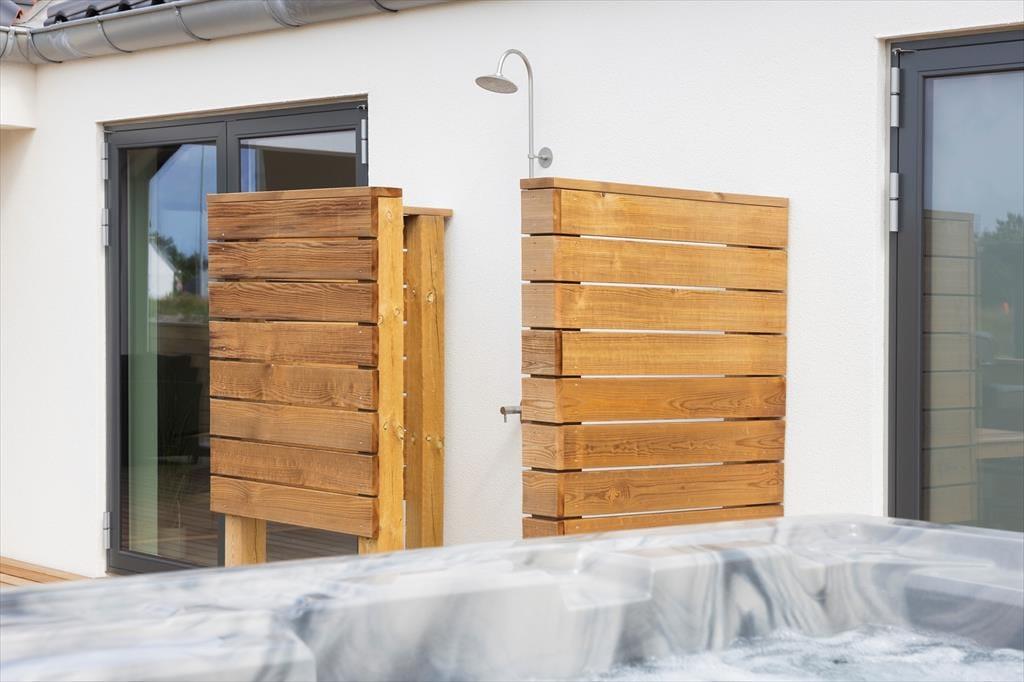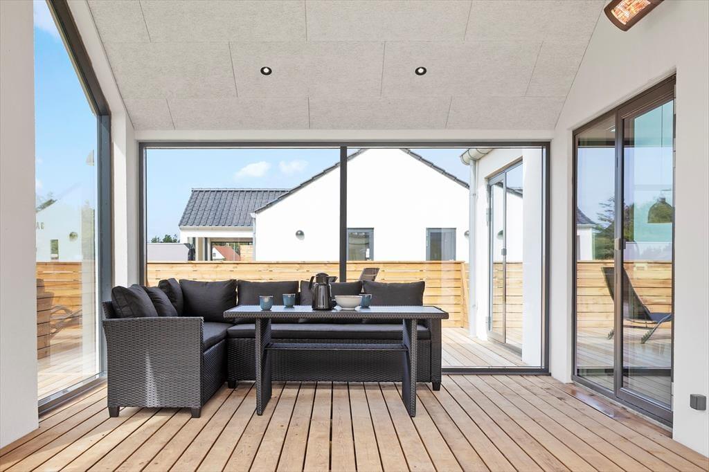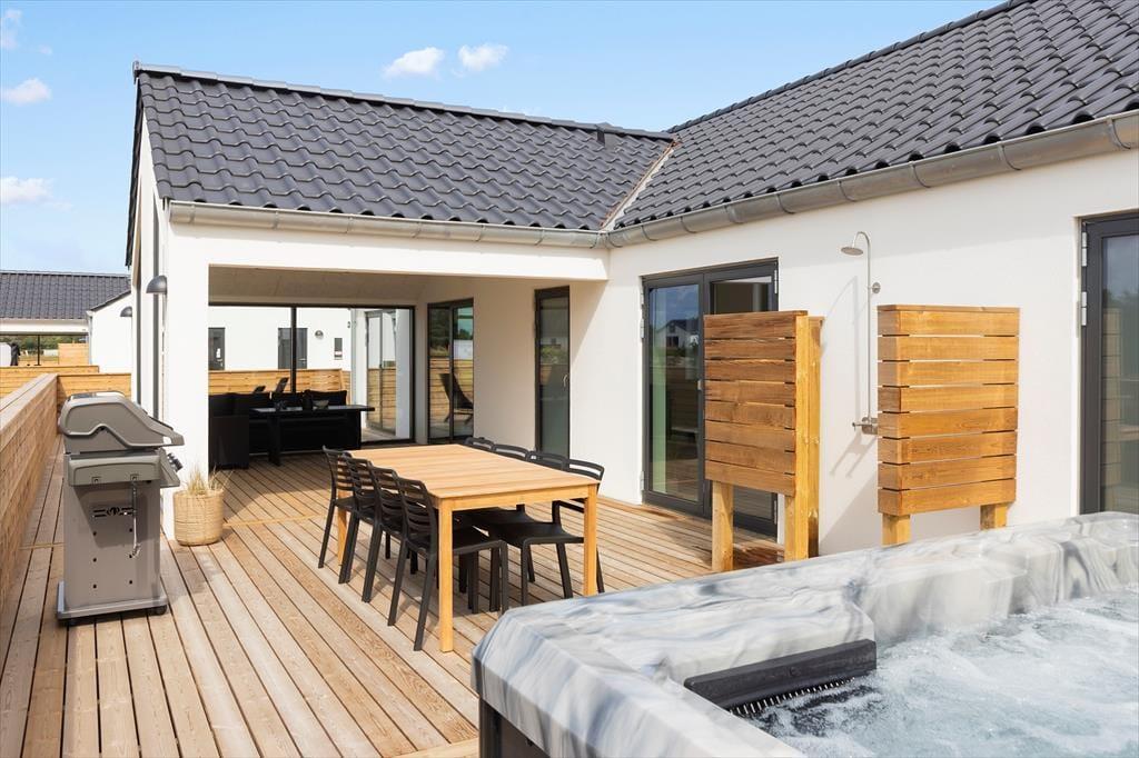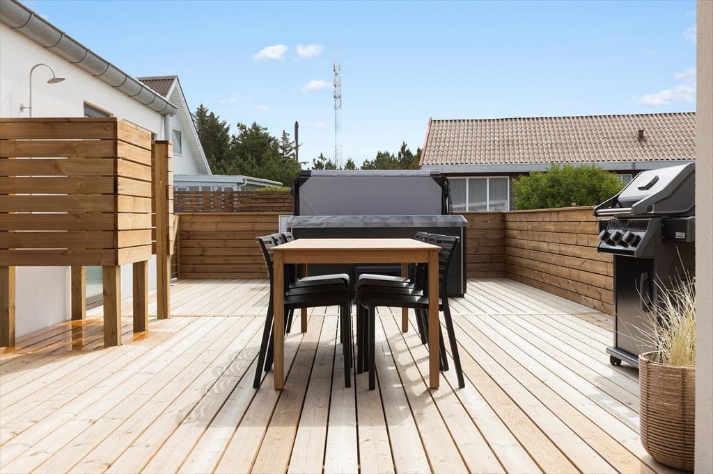 Udenfor åbner der sig en verden af luksus og komfort. Det store terrassemiljø byder på både åbne og overdækkede arealer, så I kan nyde udelivet uanset vejret. Start dagen med en forfriskende udebruser under åben himmel, og slut af med afslapning i det udendørs spabad, hvor I kan lade jer opvarme af de varme bobler og nyde de rolige omgivelser. Den store grund indbyder til leg og aktiviteter, mens den overdækkede terrasse fungerer som et perfekt sted at samles til grillhygge eller en stille stund med en god bog. Her kan I nyde morgenkaffen i solopgangen eller afslutte dagen med et glas vin i solnedgangen.